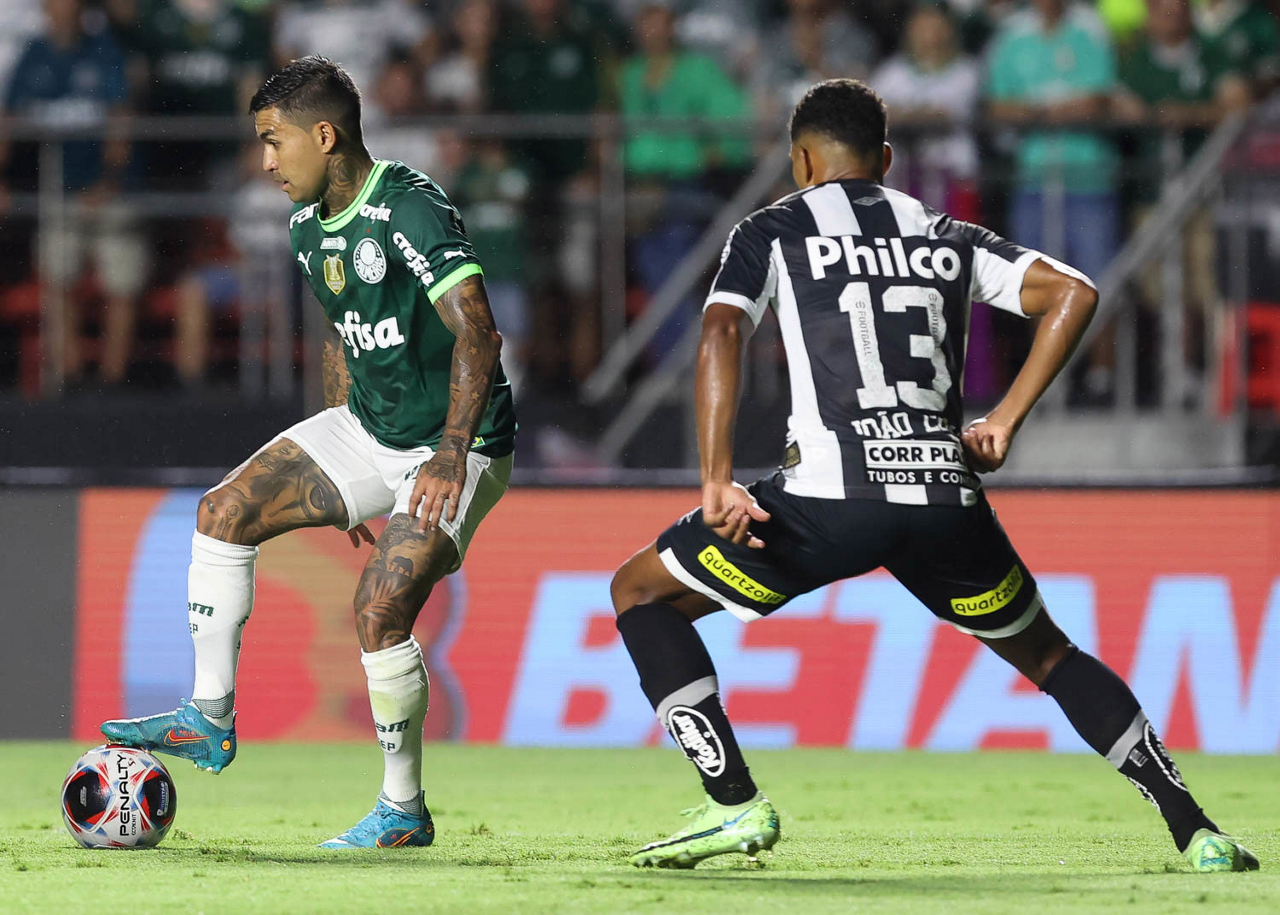 O jogador Dudu, da SE Palmeiras, disputa bola com o jogador João Lucas, do Santos FC, durante partida válida pela sexta rodada, do Campeonato Paulista, Série A1, no Estádio do Morumbi. (Foto: Cesar Greco/Palmeiras/by Canon)