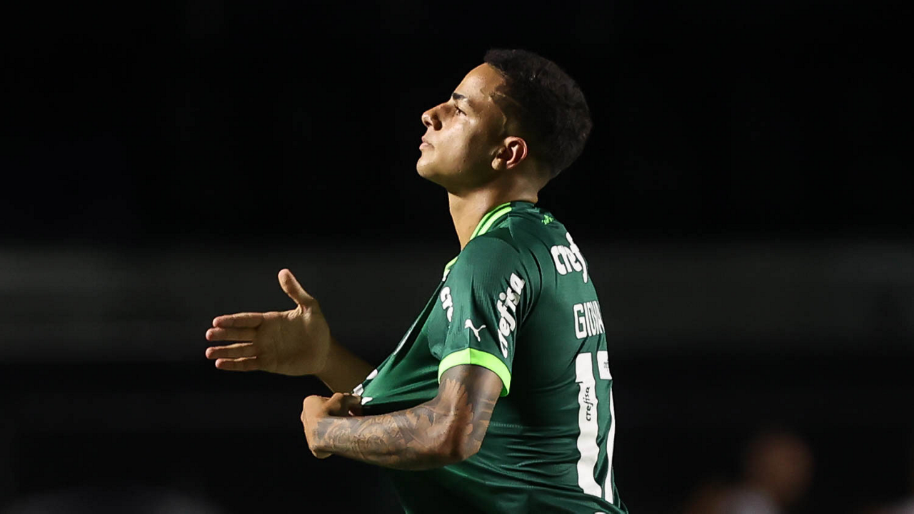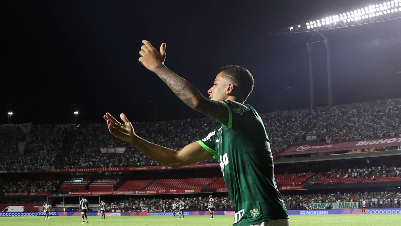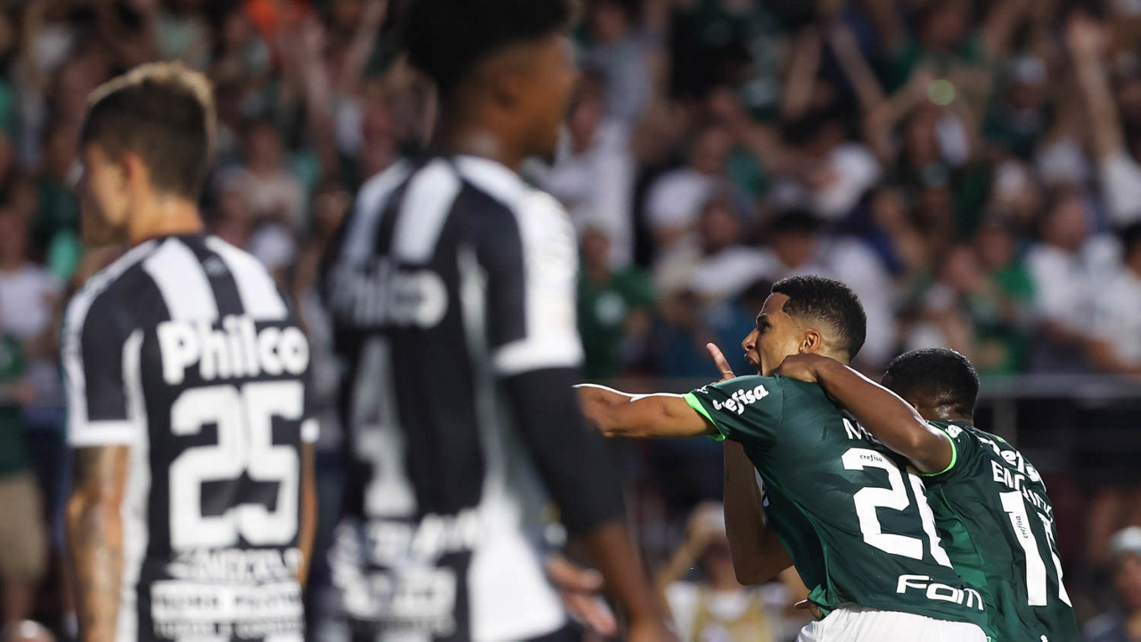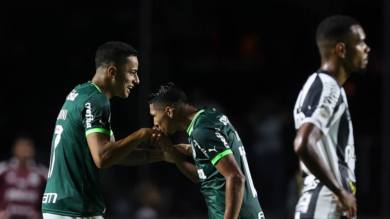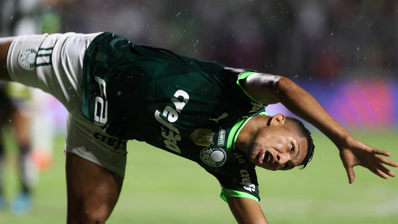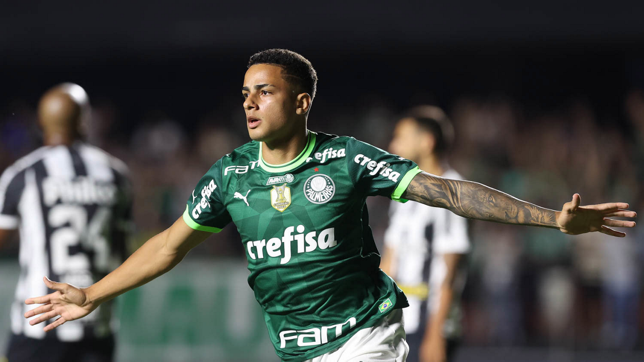 O jogador Gabriel Menino, da SE Palmeiras, em jogo contra a equipe do Santos FC, durante partida válida pela sexta rodada, do Campeonato Paulista, Série A1, no Estádio do Morumbi. (Foto: Cesar Greco/Palmeiras/by Canon)
