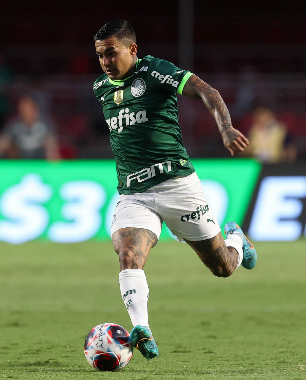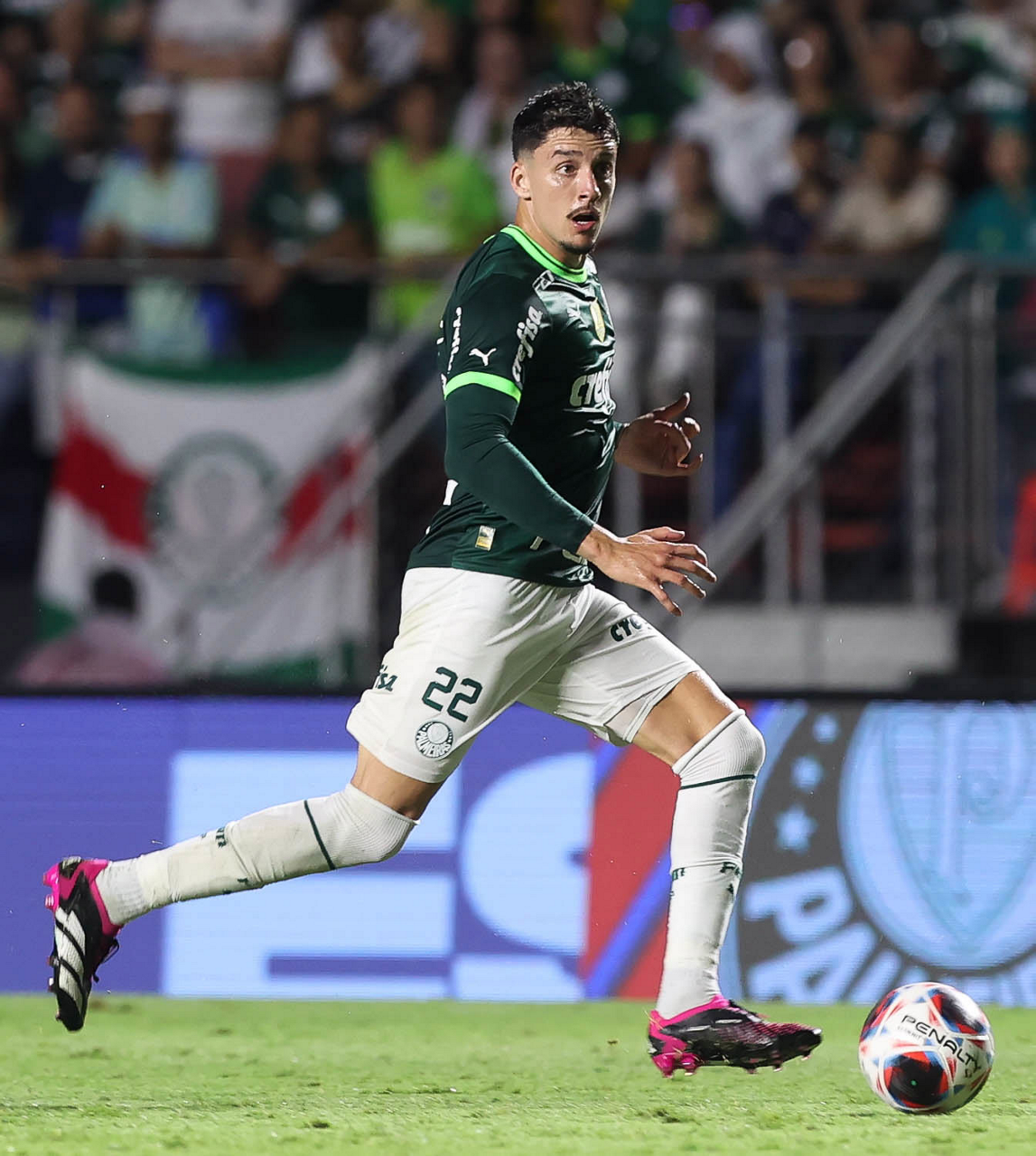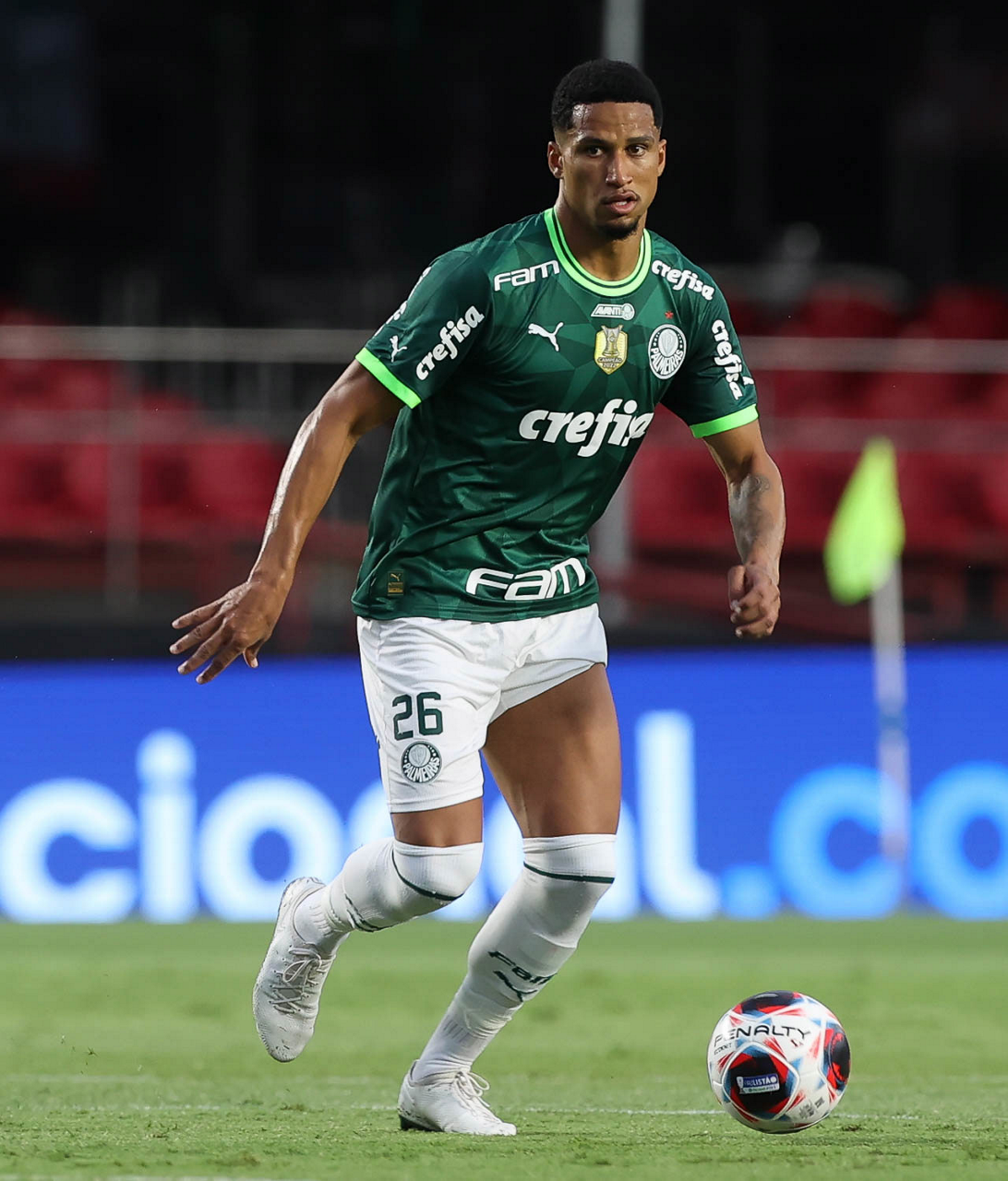 O jogador Joaquín Piquerez, da SE Palmeiras, em jogo contra a equipe do Santos FC, durante partida válida pela sexta rodada, do Campeonato Paulista, Série A1, no Estádio do Morumbi. (Foto: Cesar Greco/Palmeiras/by Canon)