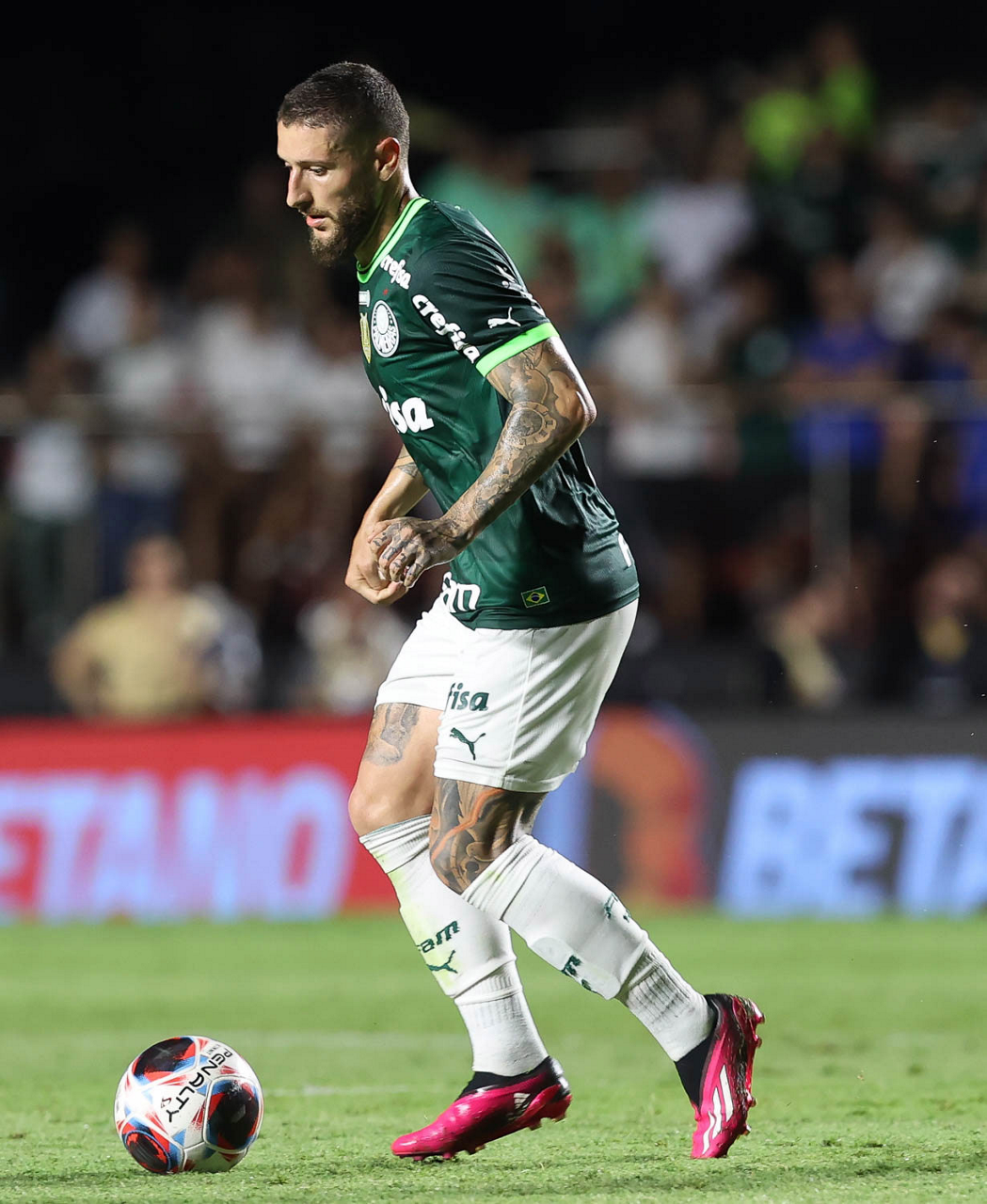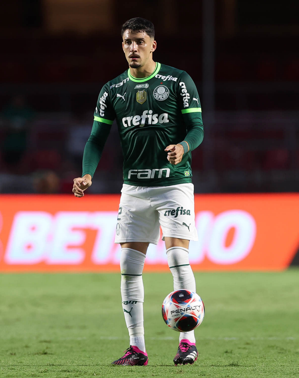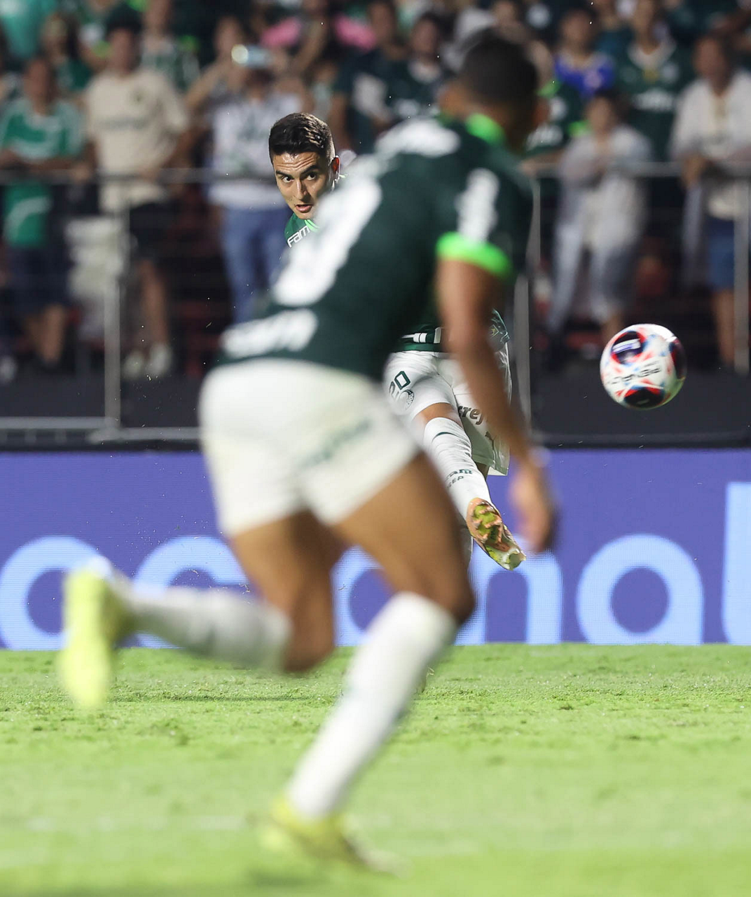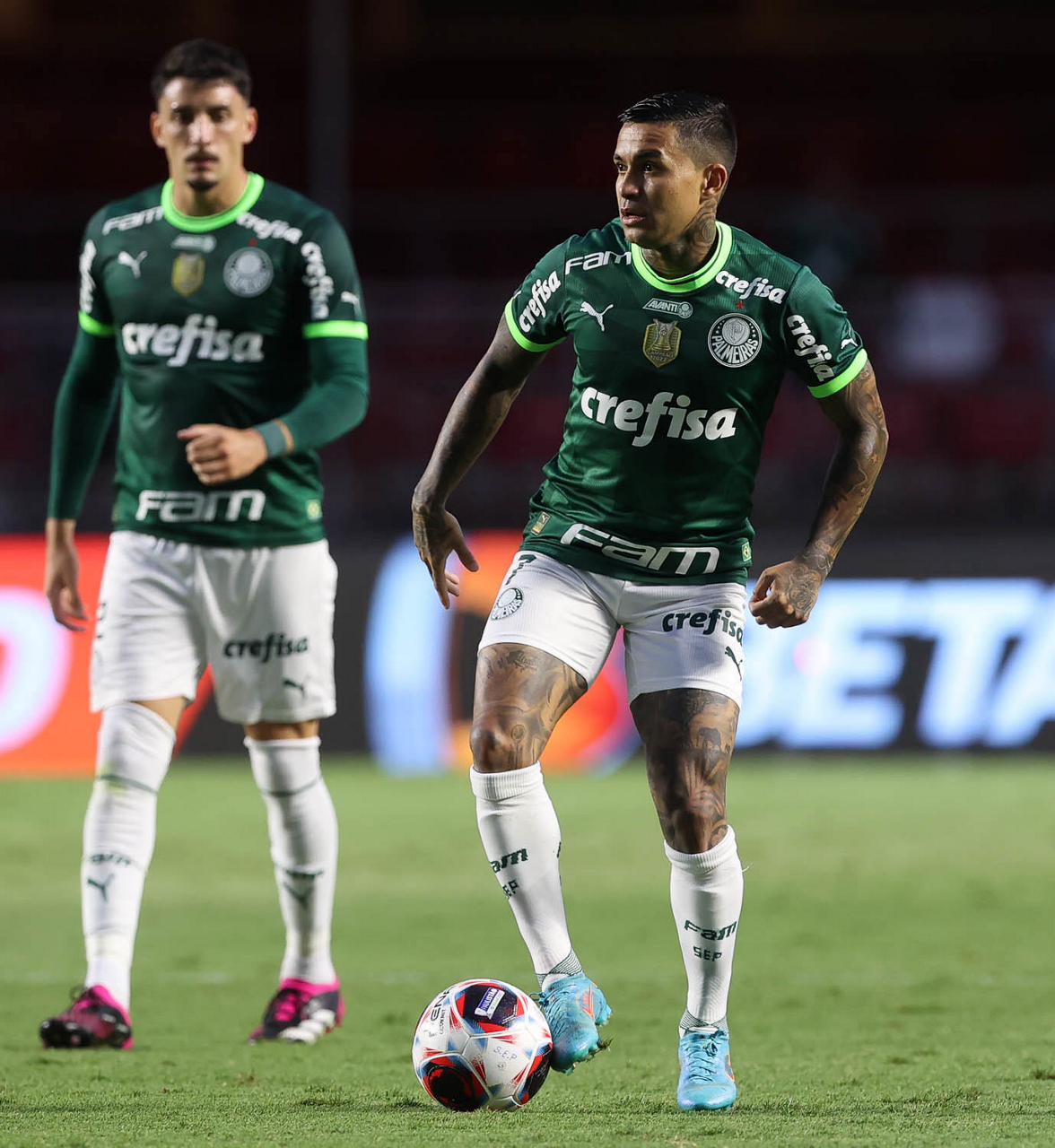 O jogador Joaquín Piquerez, da SE Palmeiras, em jogo contra a equipe do Santos FC, durante partida válida pela sexta rodada, do Campeonato Paulista, Série A1, no Estádio do Morumbi. (Foto: Cesar Greco/Palmeiras/by Canon)