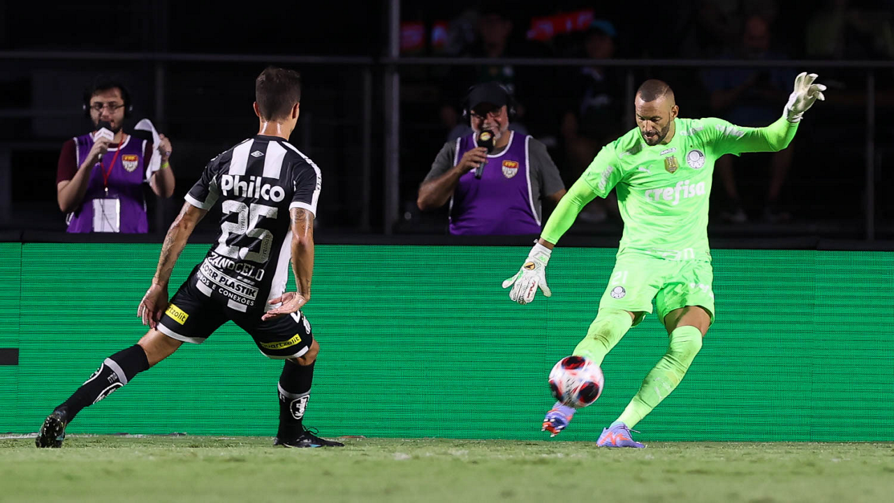 O goleiro Weverton, da SE Palmeiras, em jogo contra a equipe do Santos FC, durante partida válida pela sexta rodada, do Campeonato Paulista, Série A1, no Estádio do Morumbi. (Foto: Cesar Greco/Palmeiras/by Canon)