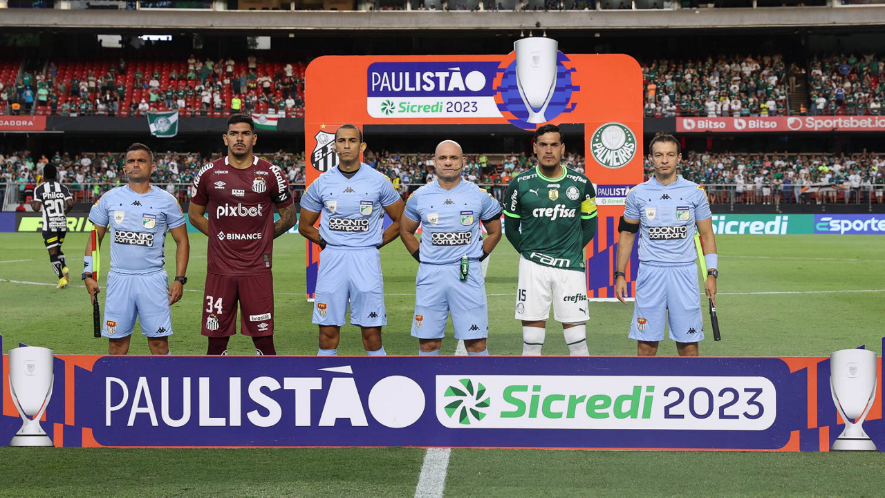 O árbitro Vinicius Gonçalves Dias Araujo, do jogo entre as equipes da SE Palmeiras e Santos FC, durante partida válida pela sexta rodada, do Campeonato Paulista, Série A1, no Estádio do Morumbi. (Foto: Cesar Greco/Palmeiras/by Canon)