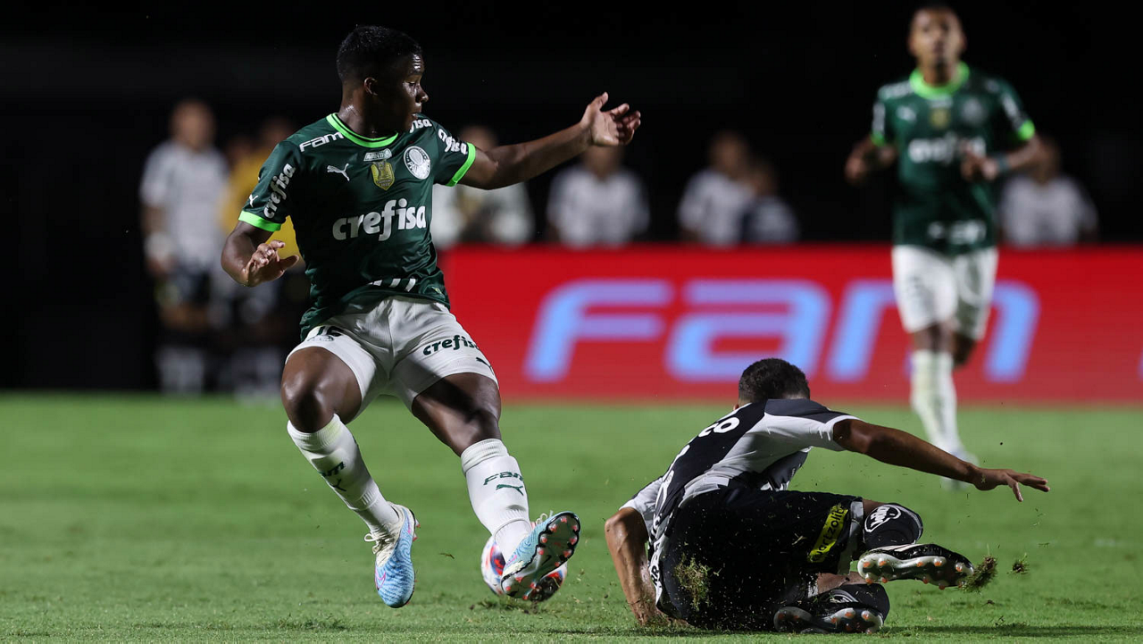 O jogador Endrick, da SE Palmeiras, disputa bola com o jogador Sandry, do Santos FC, durante partida válida pela sexta rodada, do Campeonato Paulista, Série A1, no Estádio do Morumbi. (Foto: Cesar Greco/Palmeiras/by Canon)