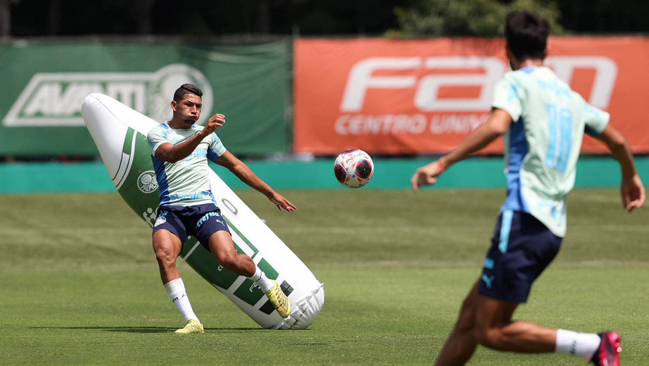 Os jogadores Benjamín Kuscevic, Fabinho, Luan, Jailson, Murilo, Garcia, Marcos Rocha, Naves e Aranha (E/D em pé) e Joaquín Piquerez, Vanderlan, Mayke, Gabriel Menino e Gustavo Gómez (E/D agachados), da SE Palmeiras, durante treinamento, na Academia de Futebol. (Foto: Cesar Greco/Palmeiras/by Canon)