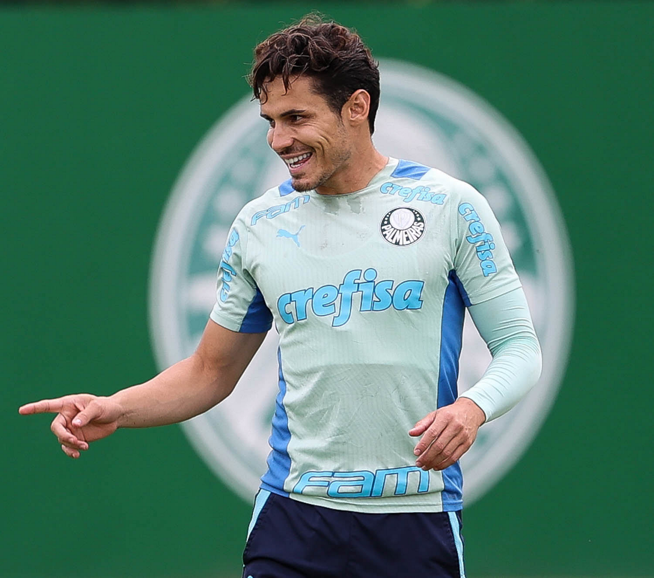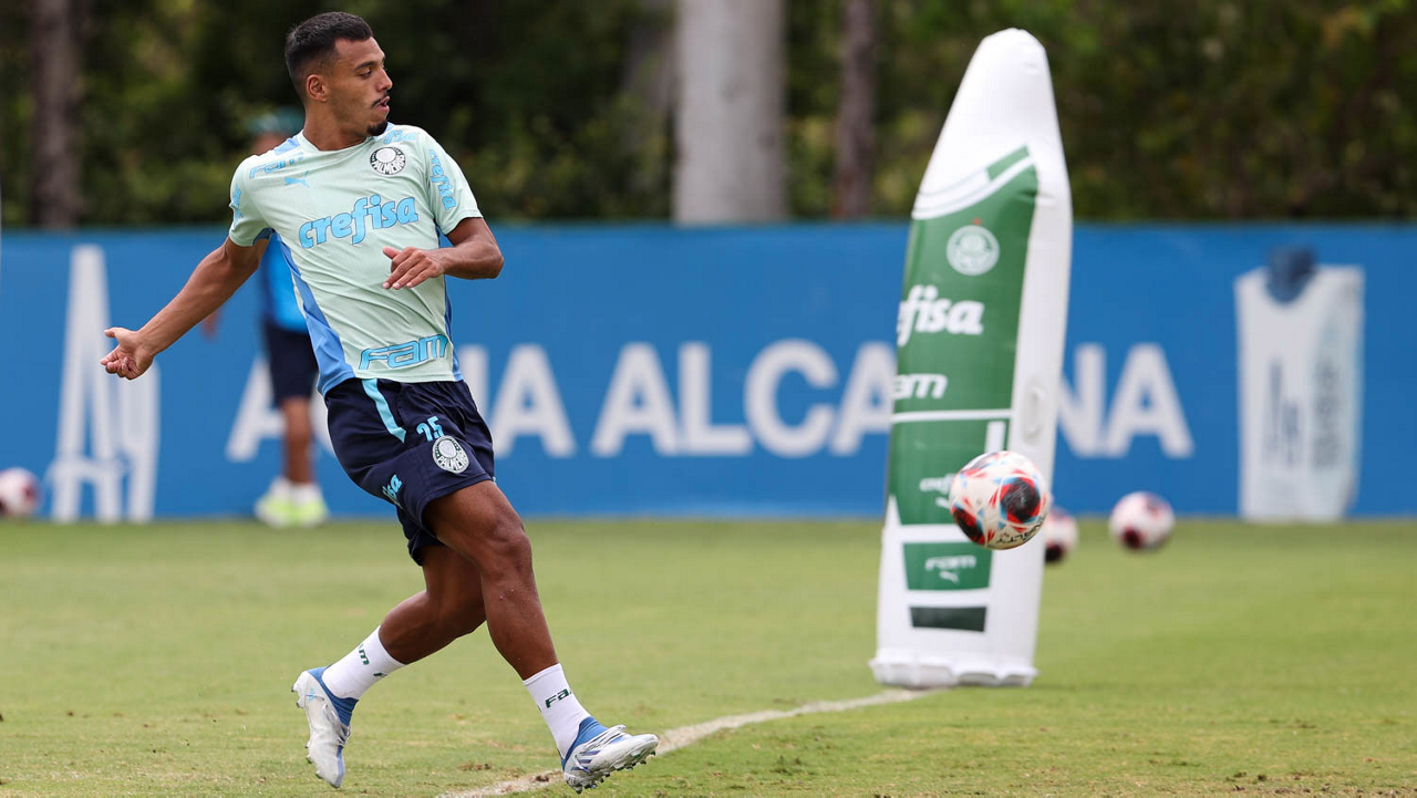 Os jogadores Raphael Veiga, Breno Lopes, Rony, Rafael Navarro e o goleiro Vinicius (E/D em pé) e Dudu, Bruno Tabata, Flaco López, Zé Rafael, Endrick, Jhonatan e Giovani (E/D agachados), da SE Palmeiras, durante treinamento, na Academia de Futebol. (Foto: Cesar Greco/Palmeiras/by Canon)