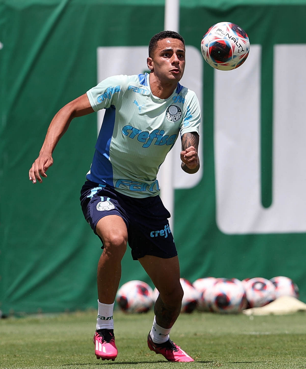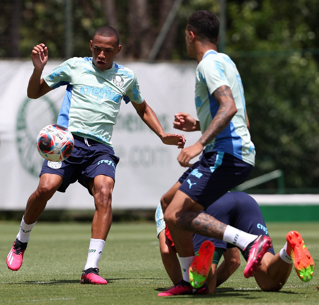 Os jogadores Raphael Veiga, Jhonatan, Rony, Eduard Atuesta, Flaco López, Rafael Navarro e Marcelo Lomba (E/D em pé) e Giovani, Dudu, Endrick, Bruno Tabata, Zé Rafael e o goleiro Vinicius (E/D agachados), da SE Palmeiras, durante treinamento, na Academia de Futebol. (Foto: Cesar Greco/Palmeiras/by Canon)