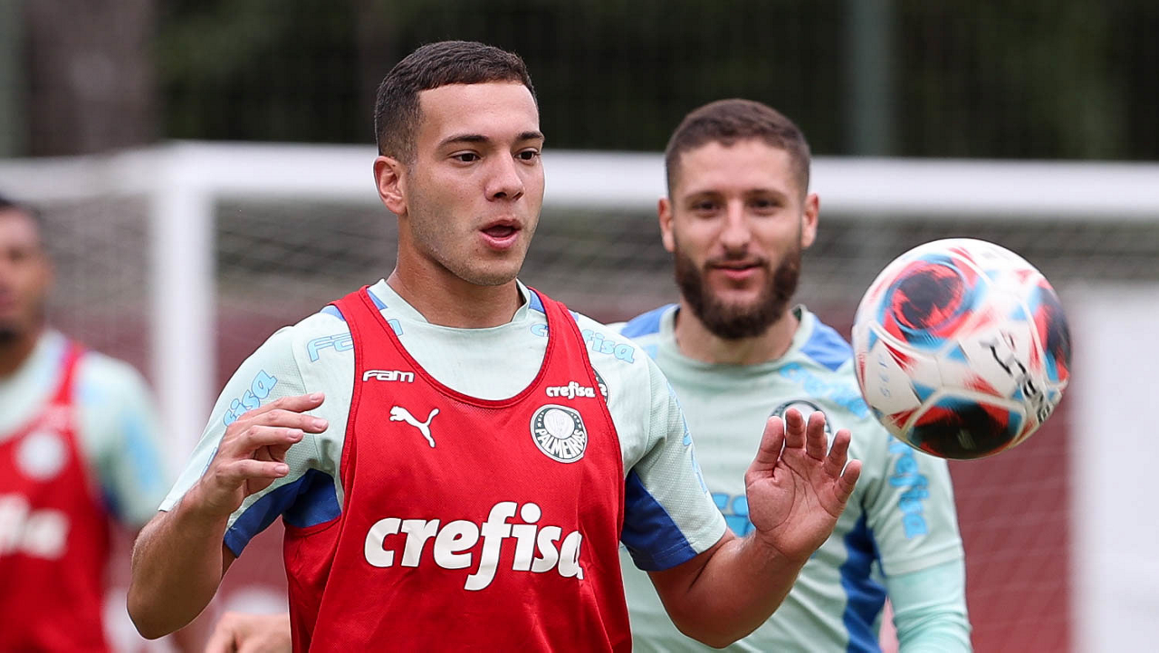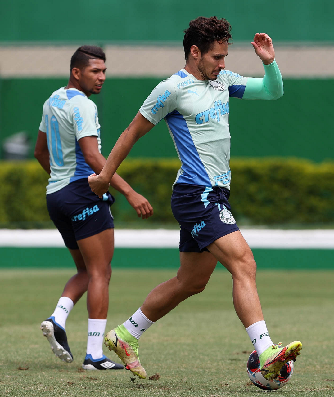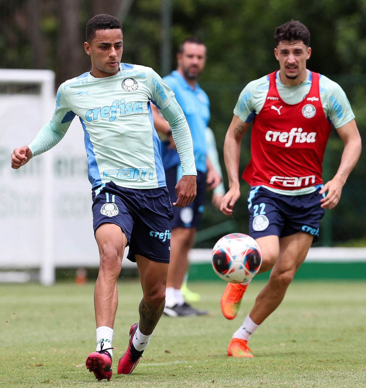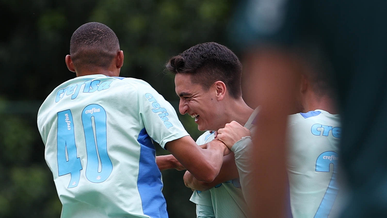 Os jogadores Gabriel Menino e Rony (D), da SE Palmeiras, durante treinamento, na Academia de Futebol. (Foto: Cesar Greco/Palmeiras/by Canon)