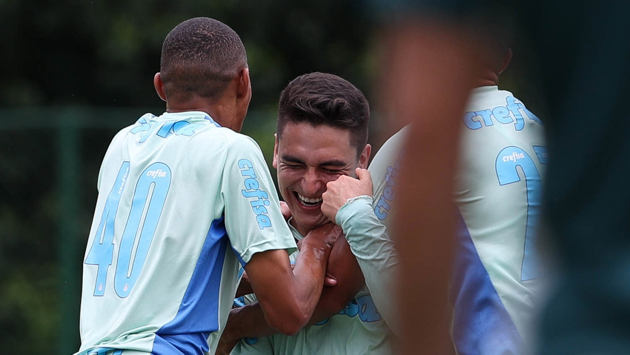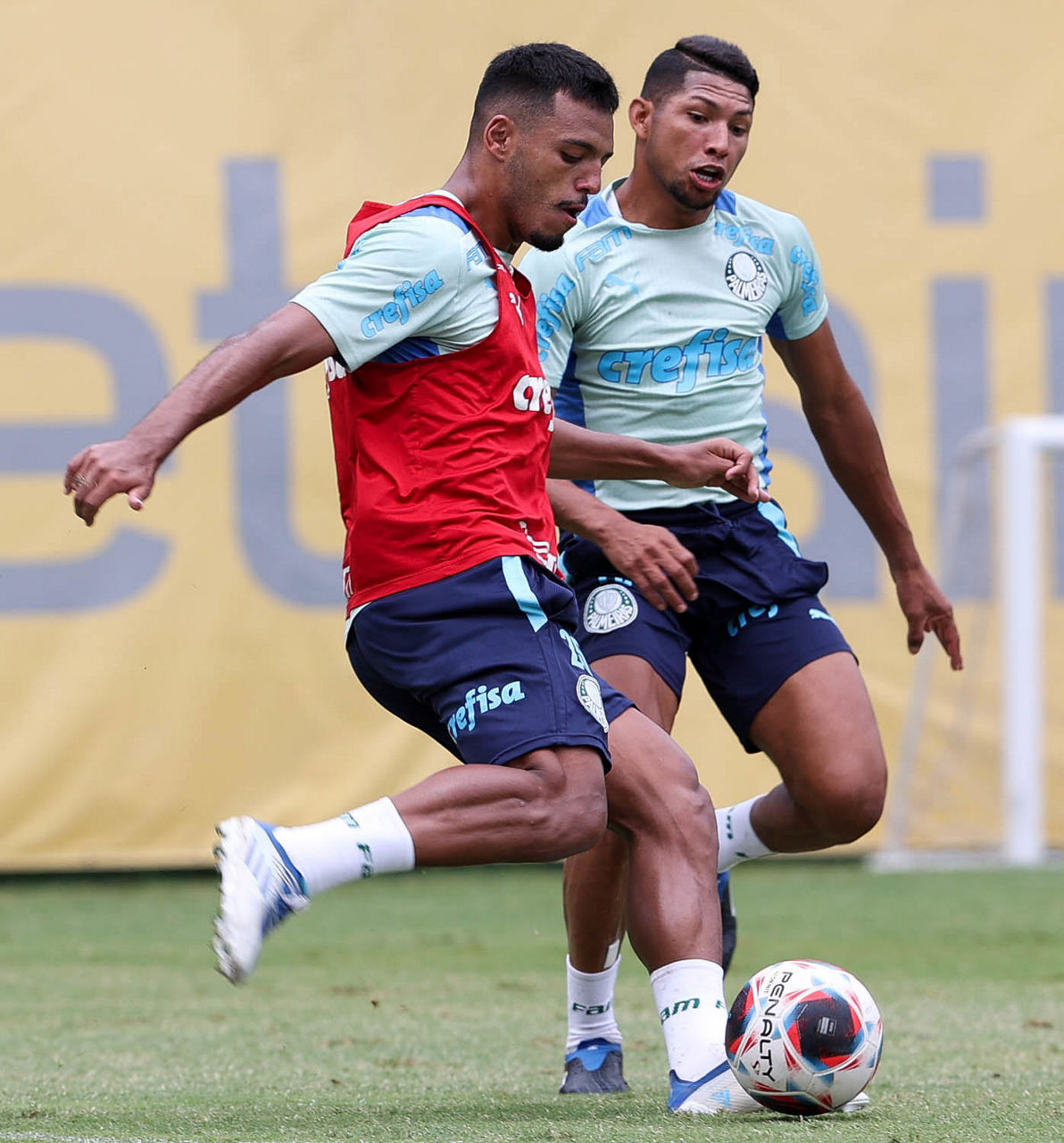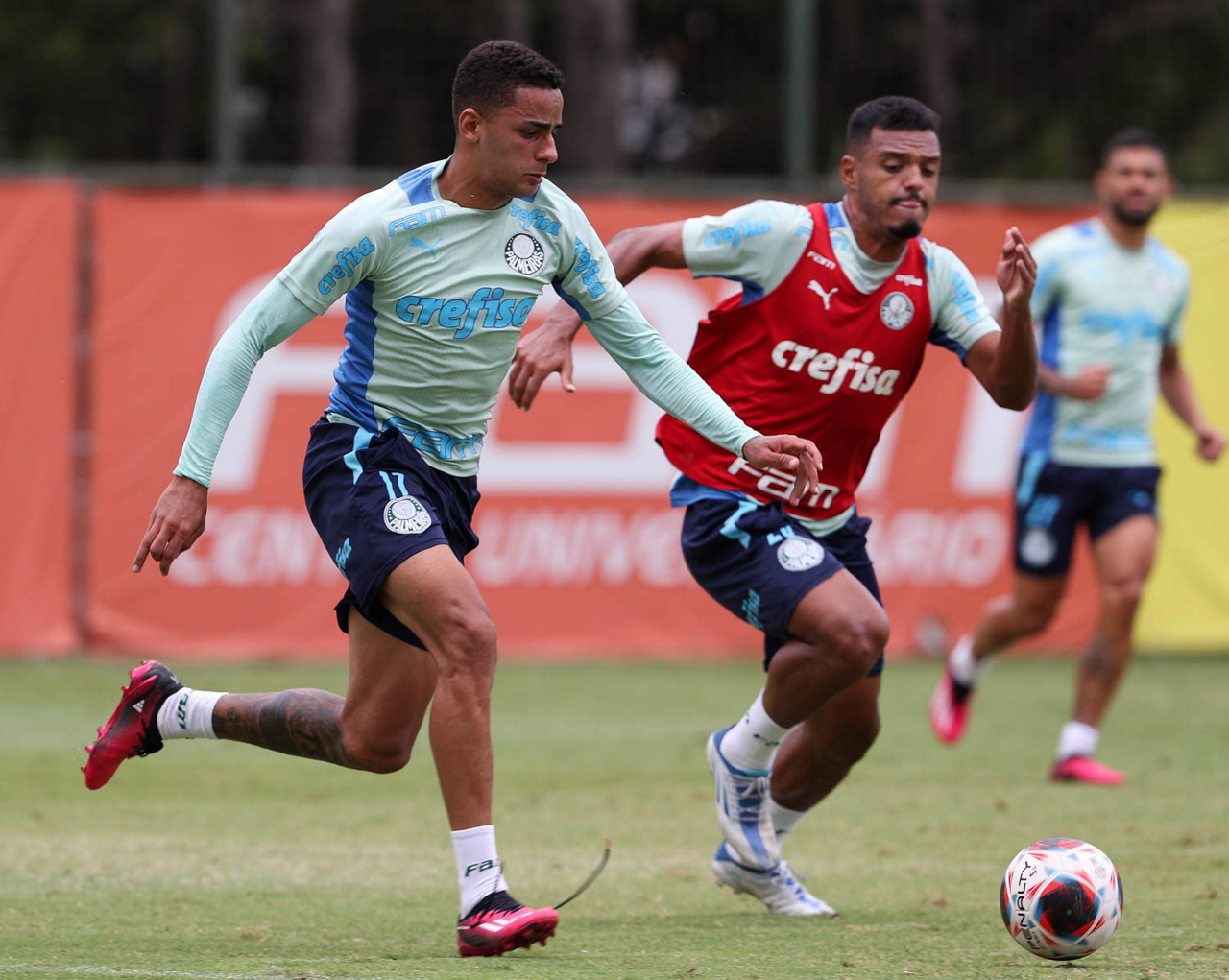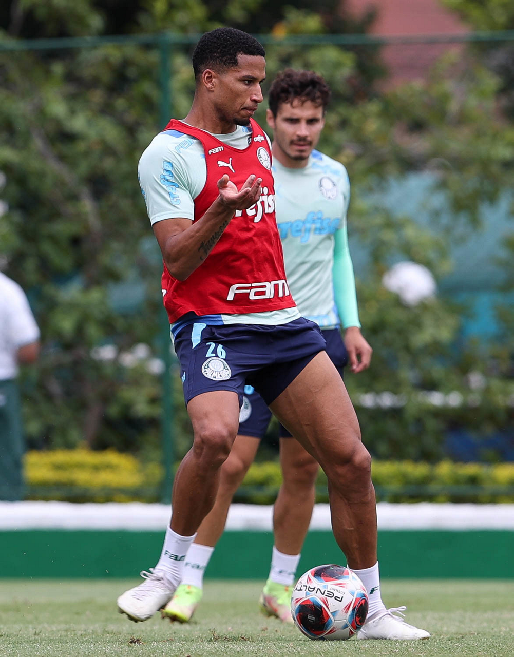 Os jogadores Gabriel Menino e Rony (D), da SE Palmeiras, durante treinamento, na Academia de Futebol. (Foto: Cesar Greco/Palmeiras/by Canon)