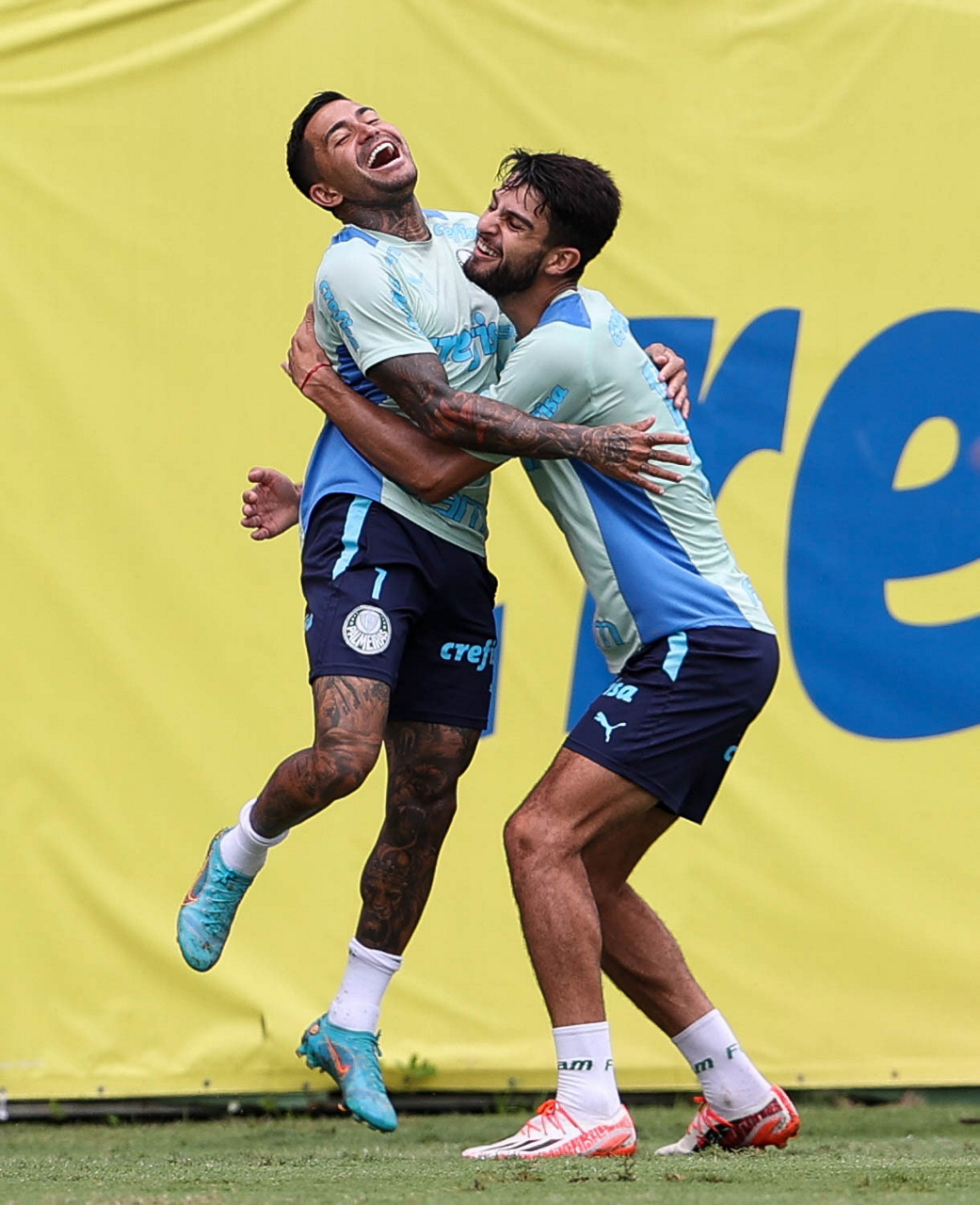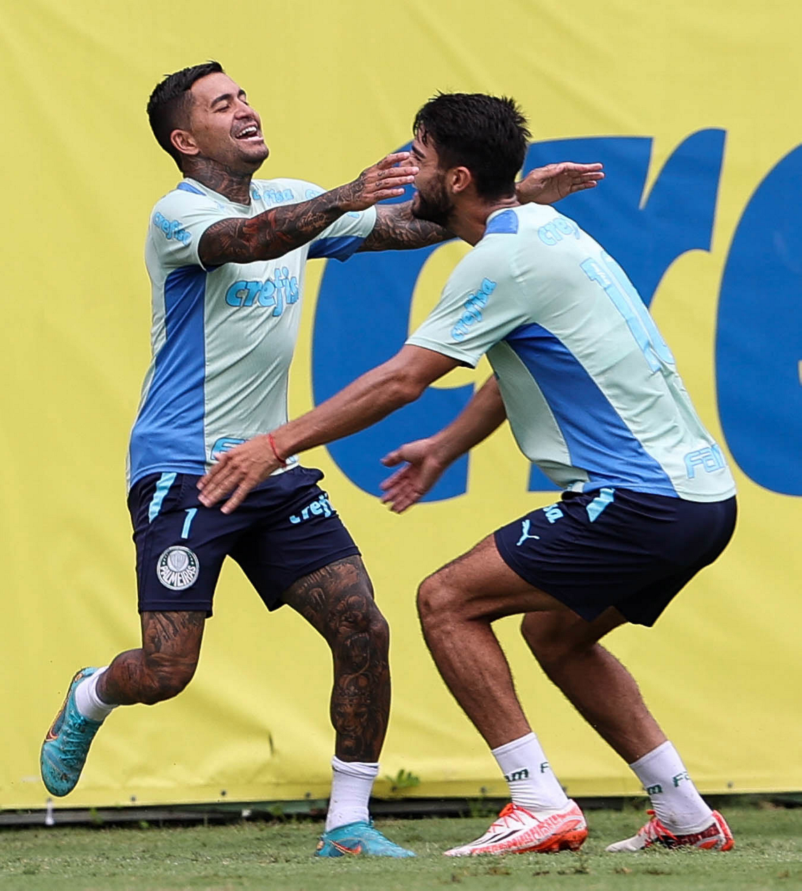 Os jogadores Dudu e Flaco López (D), da SE Palmeiras, durante treinamento, na Academia de Futebol. (Foto: Cesar Greco/Palmeiras/by Canon)