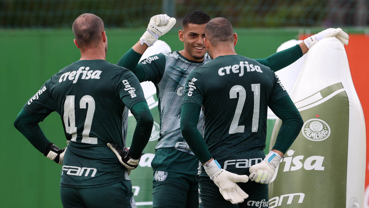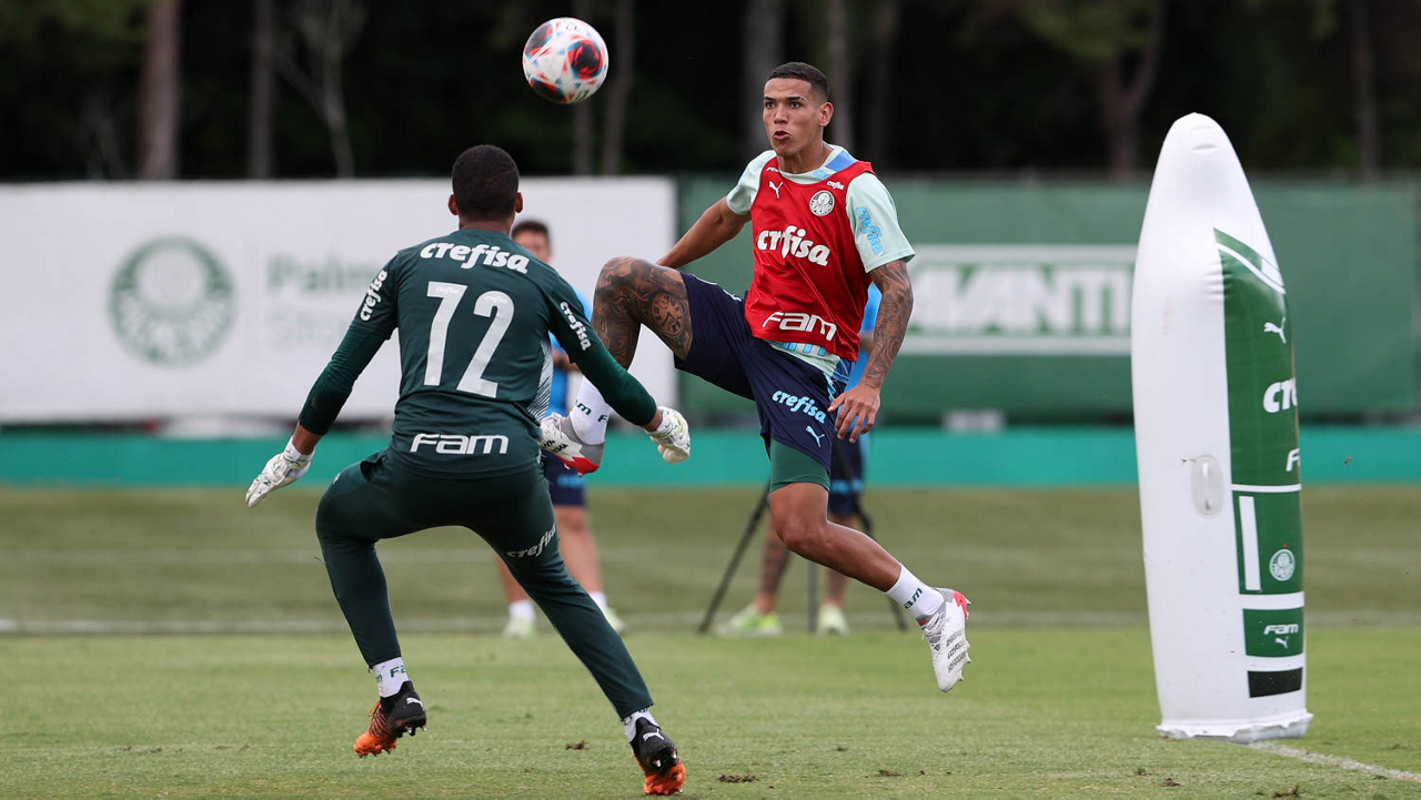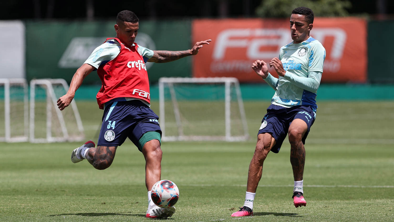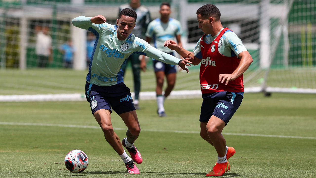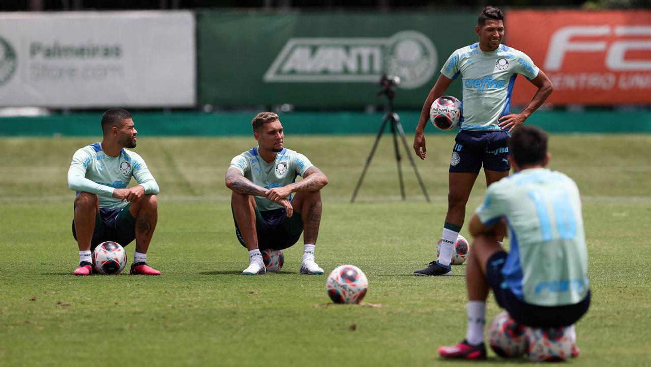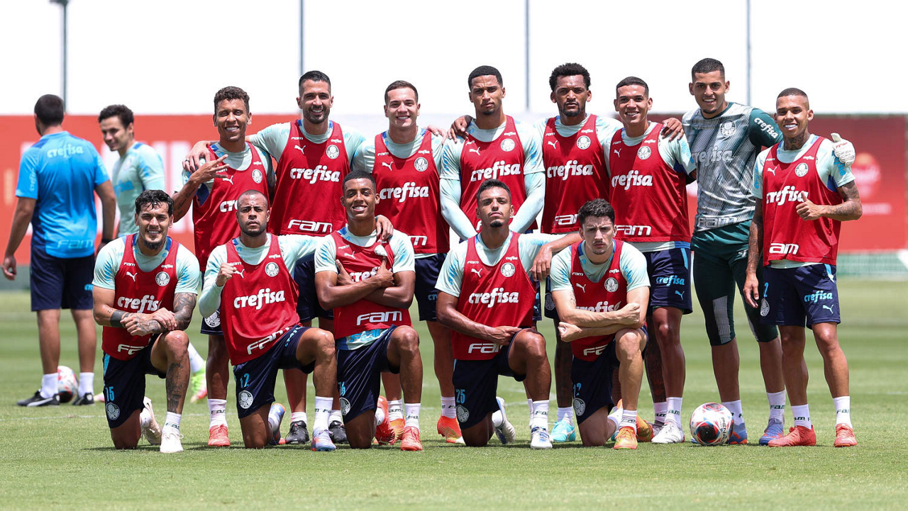 Os jogadores Marcos Rocha, Luan, Fabinho, Murilo, Jailson, Naves, Kaique e Garcia (E/D em pé) e Gustavo Gómez, Mayke, Vanderlan, Gabriel Menino e Joaquín Piquerez (E/D agachados), da SE Palmeiras, durante treinamento, na Academia de Futebol. (Foto: Cesar Greco/Palmeiras/by Canon)