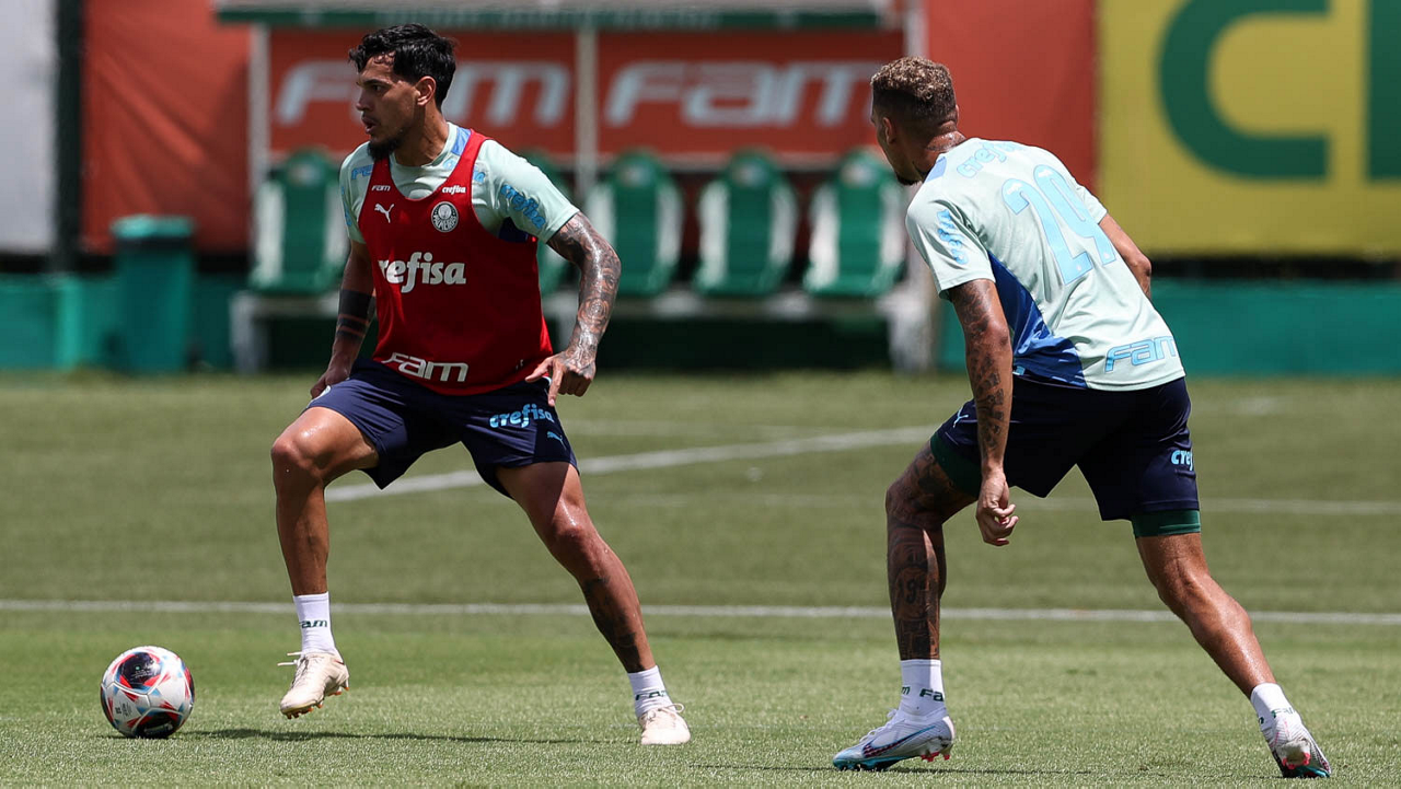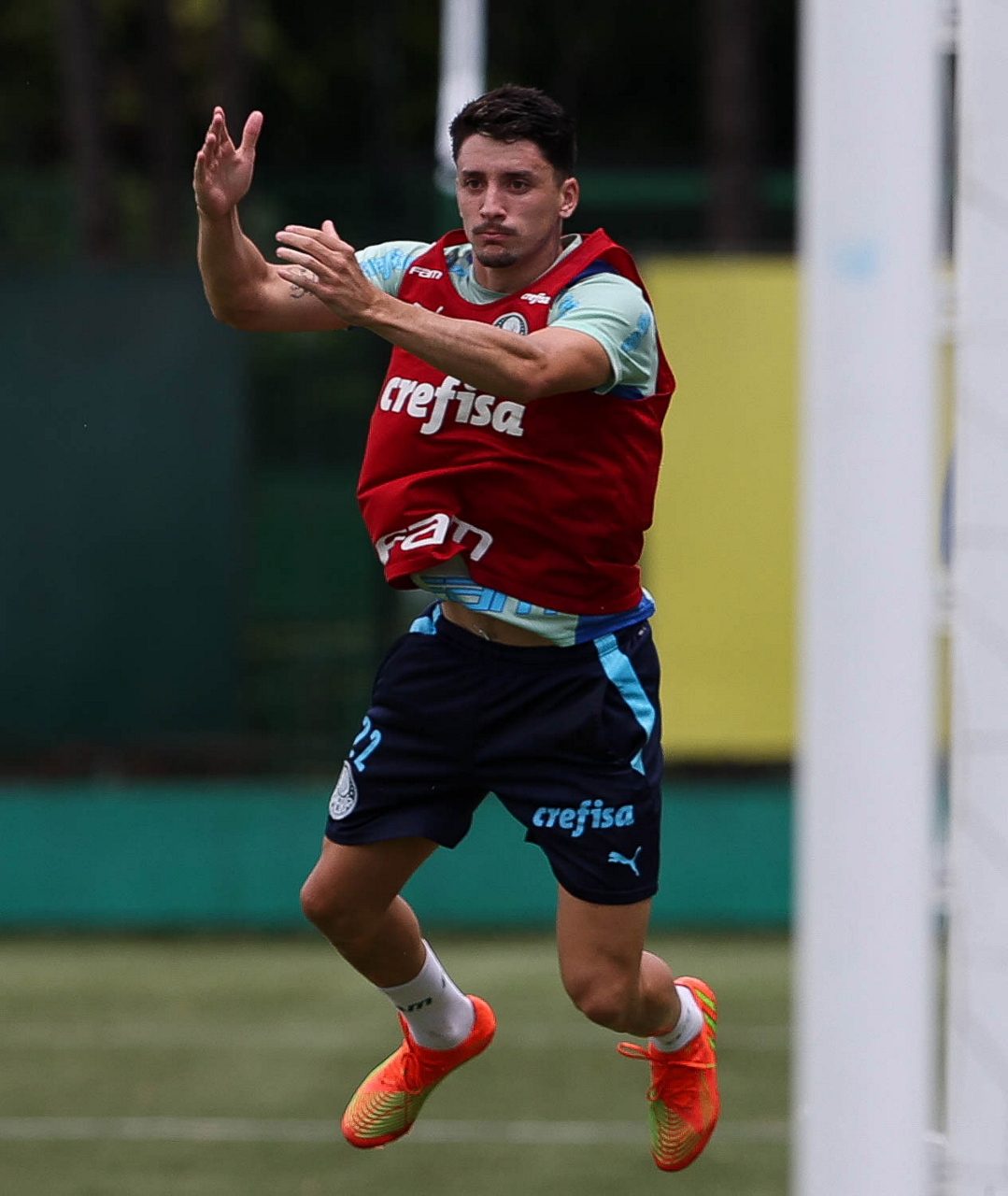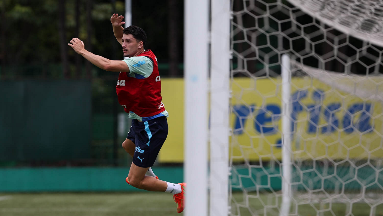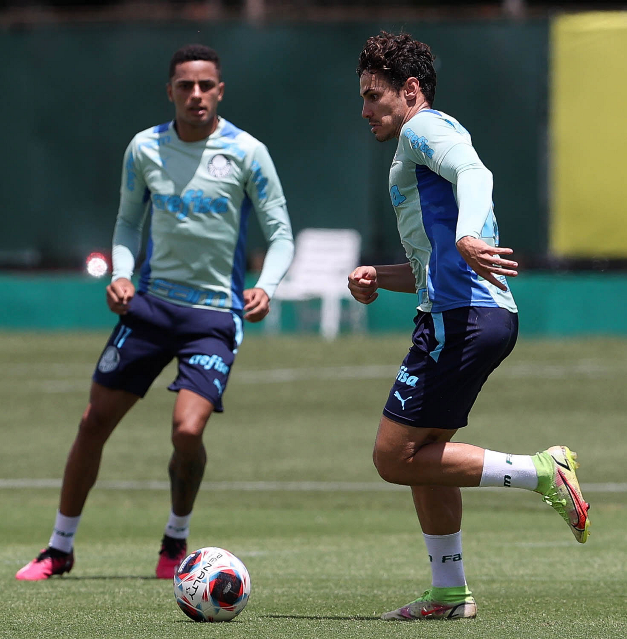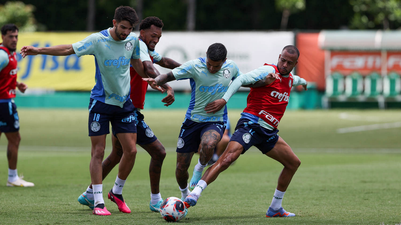 Os jogadores Marcos Rocha, Luan, Fabinho, Murilo, Jailson, Naves, Kaique e Garcia (E/D em pé) e Gustavo Gómez, Mayke, Vanderlan, Gabriel Menino e Joaquín Piquerez (E/D agachados), da SE Palmeiras, durante treinamento, na Academia de Futebol. (Foto: Cesar Greco/Palmeiras/by Canon)