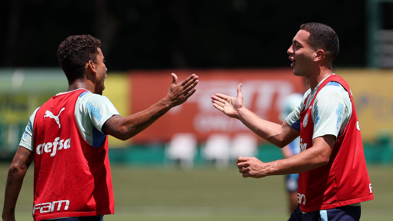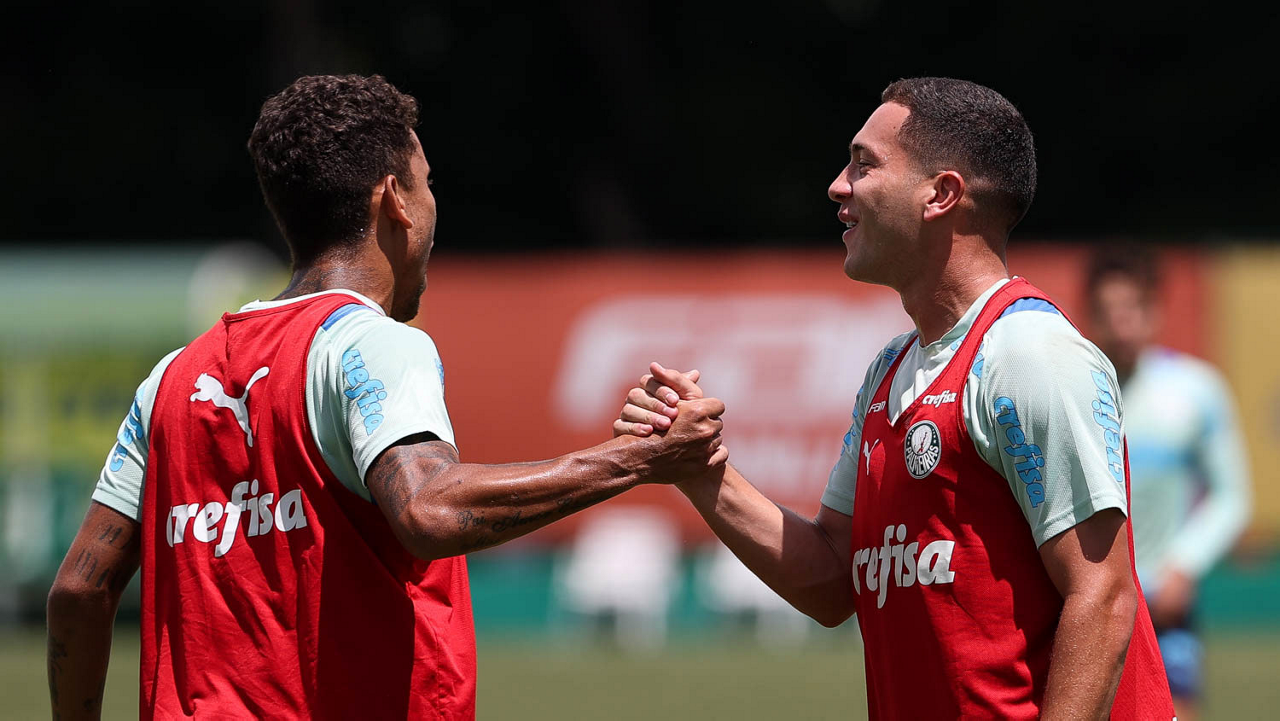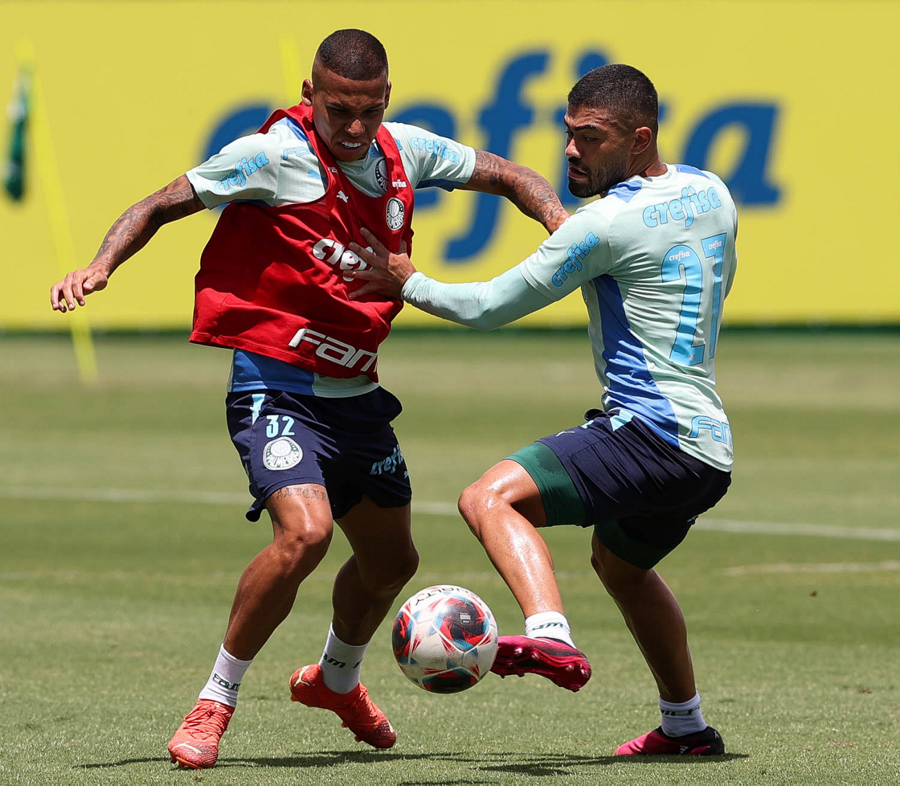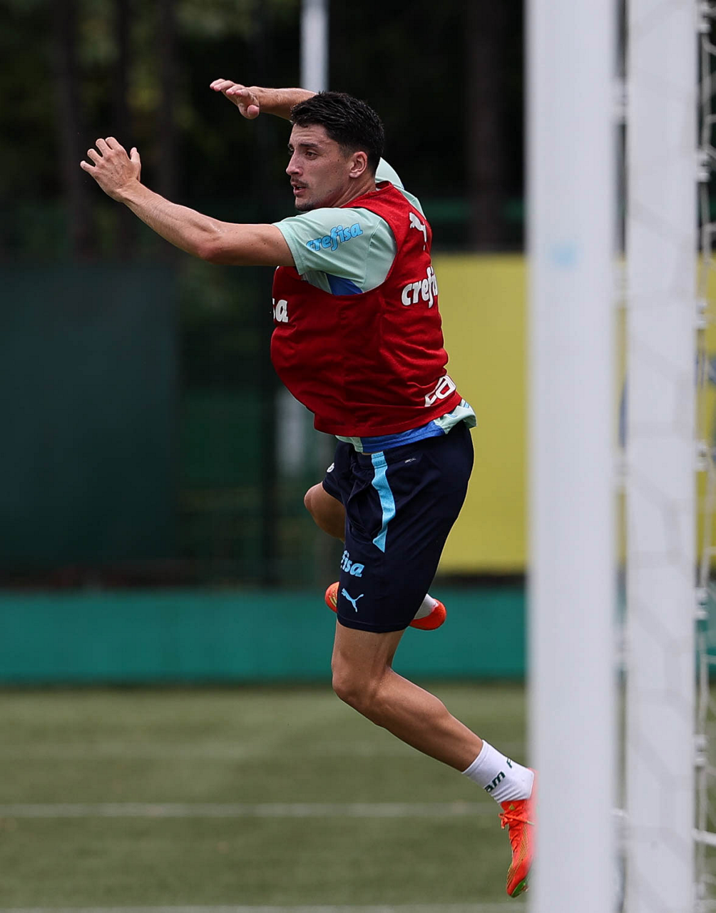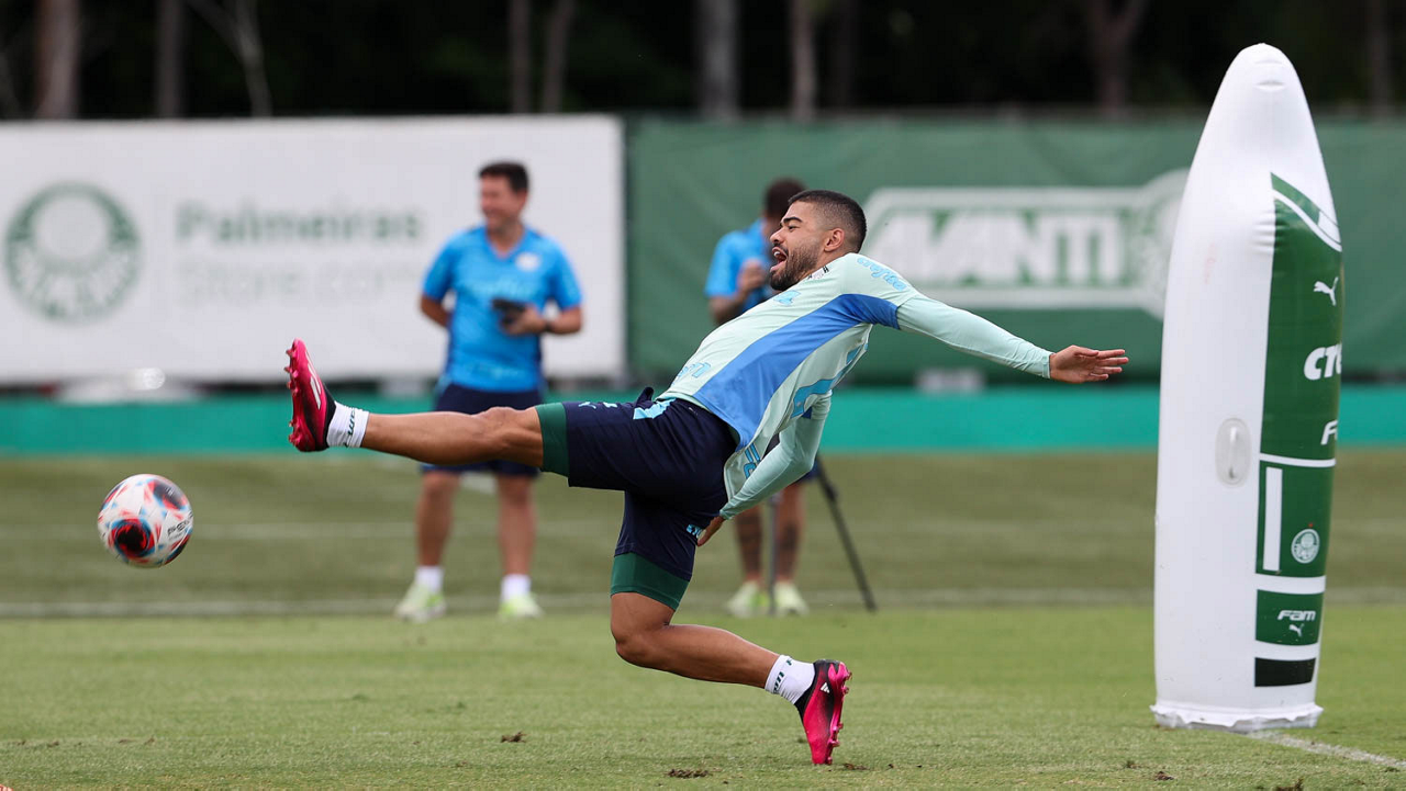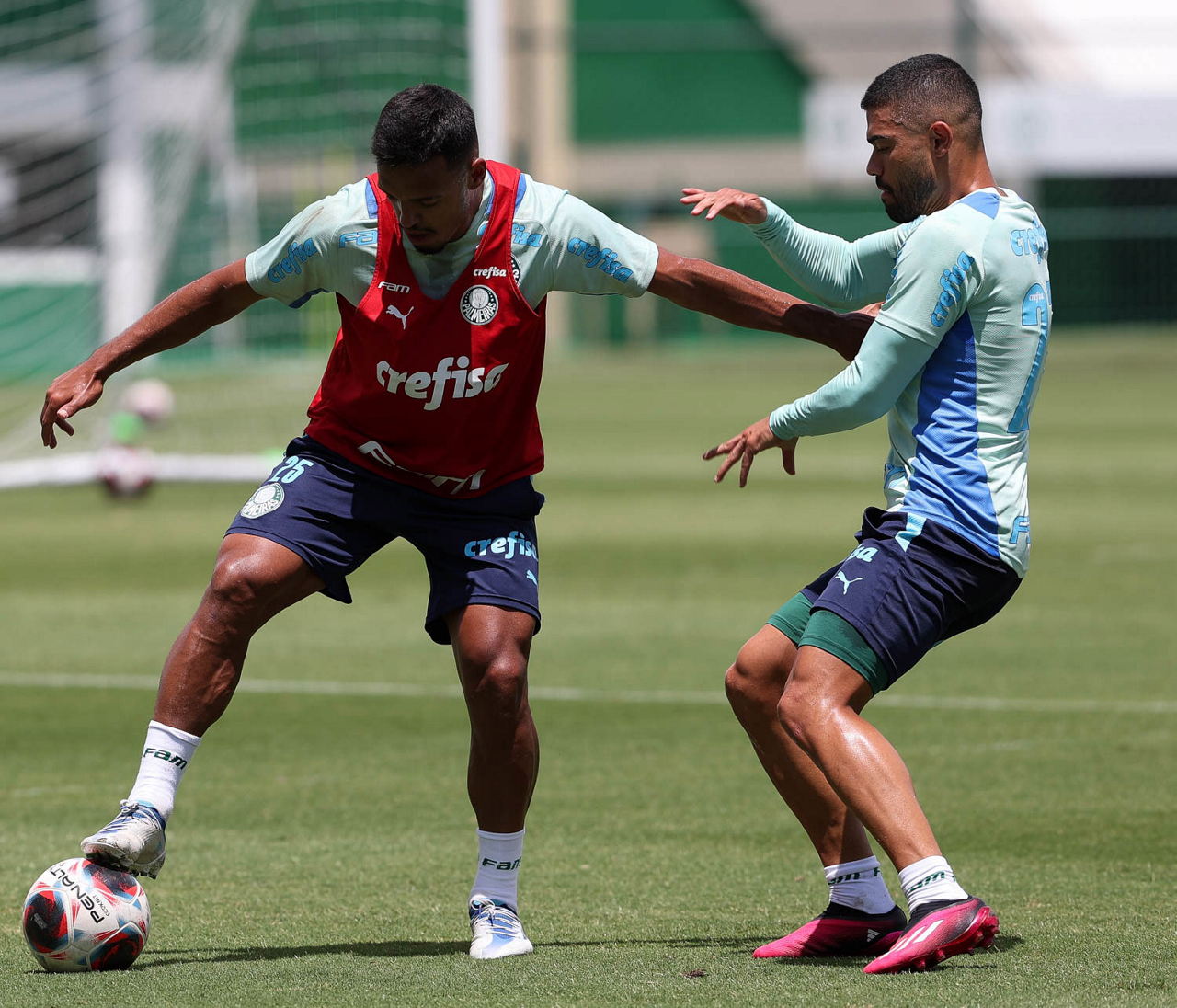 Os jogadores Marcos Rocha, Luan, Fabinho, Murilo, Jailson, Naves, Kaique e Garcia (E/D em pé) e Gustavo Gómez, Mayke, Vanderlan, Gabriel Menino e Joaquín Piquerez (E/D agachados), da SE Palmeiras, durante treinamento, na Academia de Futebol. (Foto: Cesar Greco/Palmeiras/by Canon)