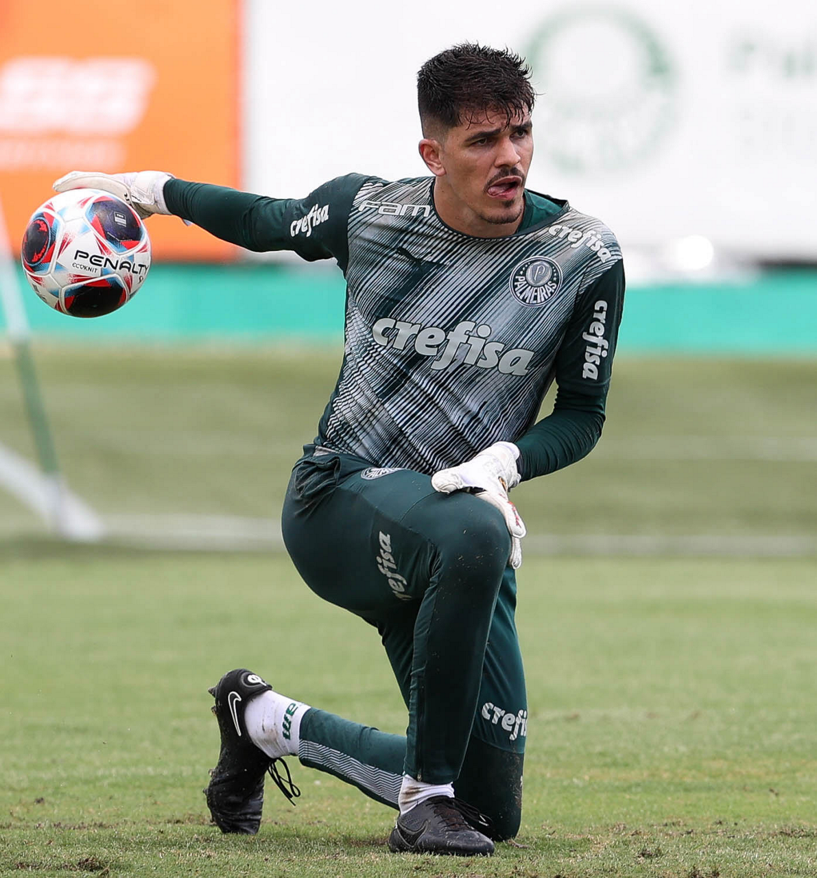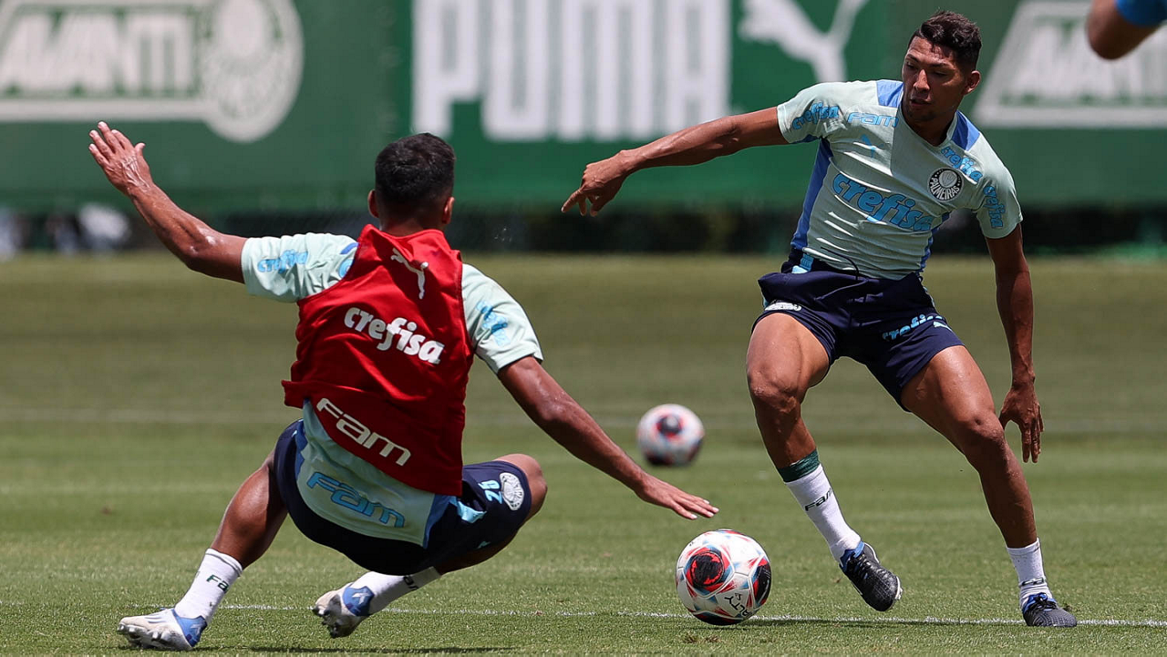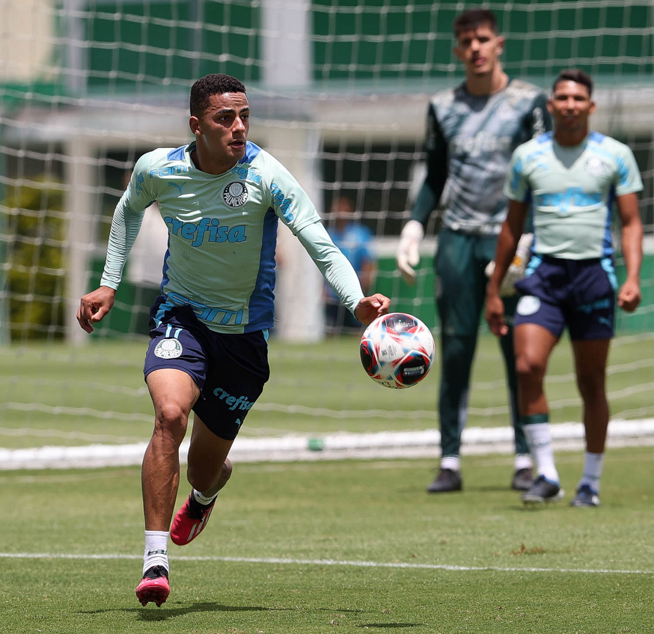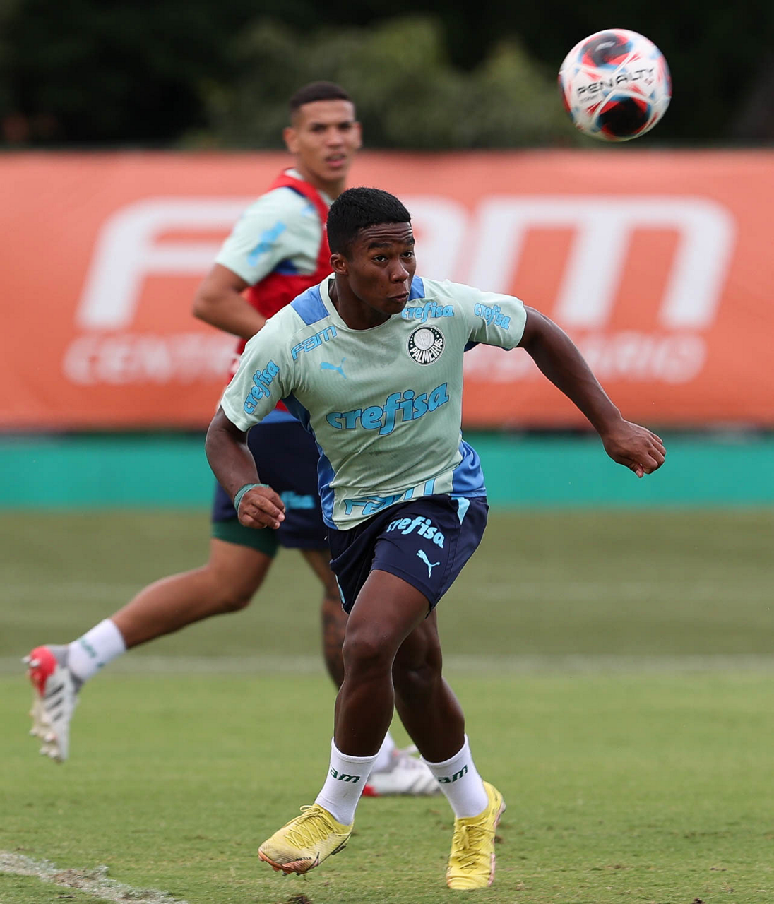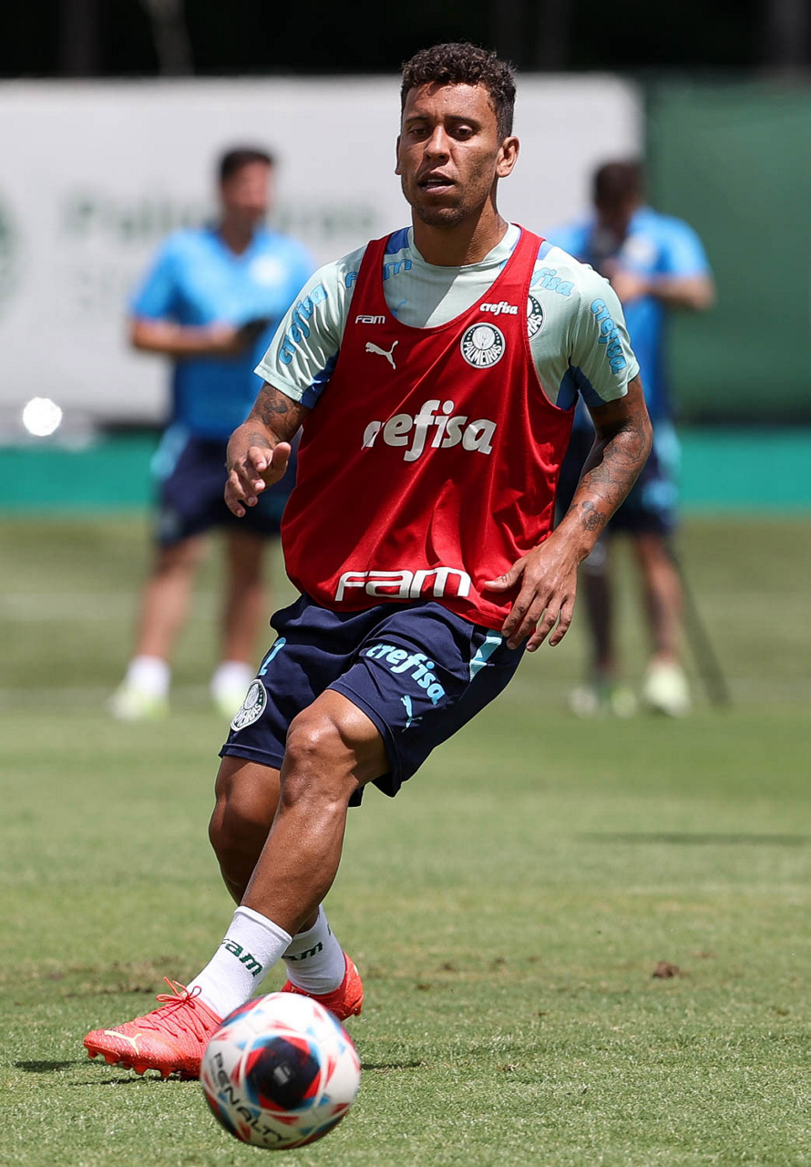 Os jogadores Marcos Rocha, Luan, Fabinho, Murilo, Jailson, Naves, Kaique e Garcia (E/D em pé) e Gustavo Gómez, Mayke, Vanderlan, Gabriel Menino e Joaquín Piquerez (E/D agachados), da SE Palmeiras, durante treinamento, na Academia de Futebol. (Foto: Cesar Greco/Palmeiras/by Canon)