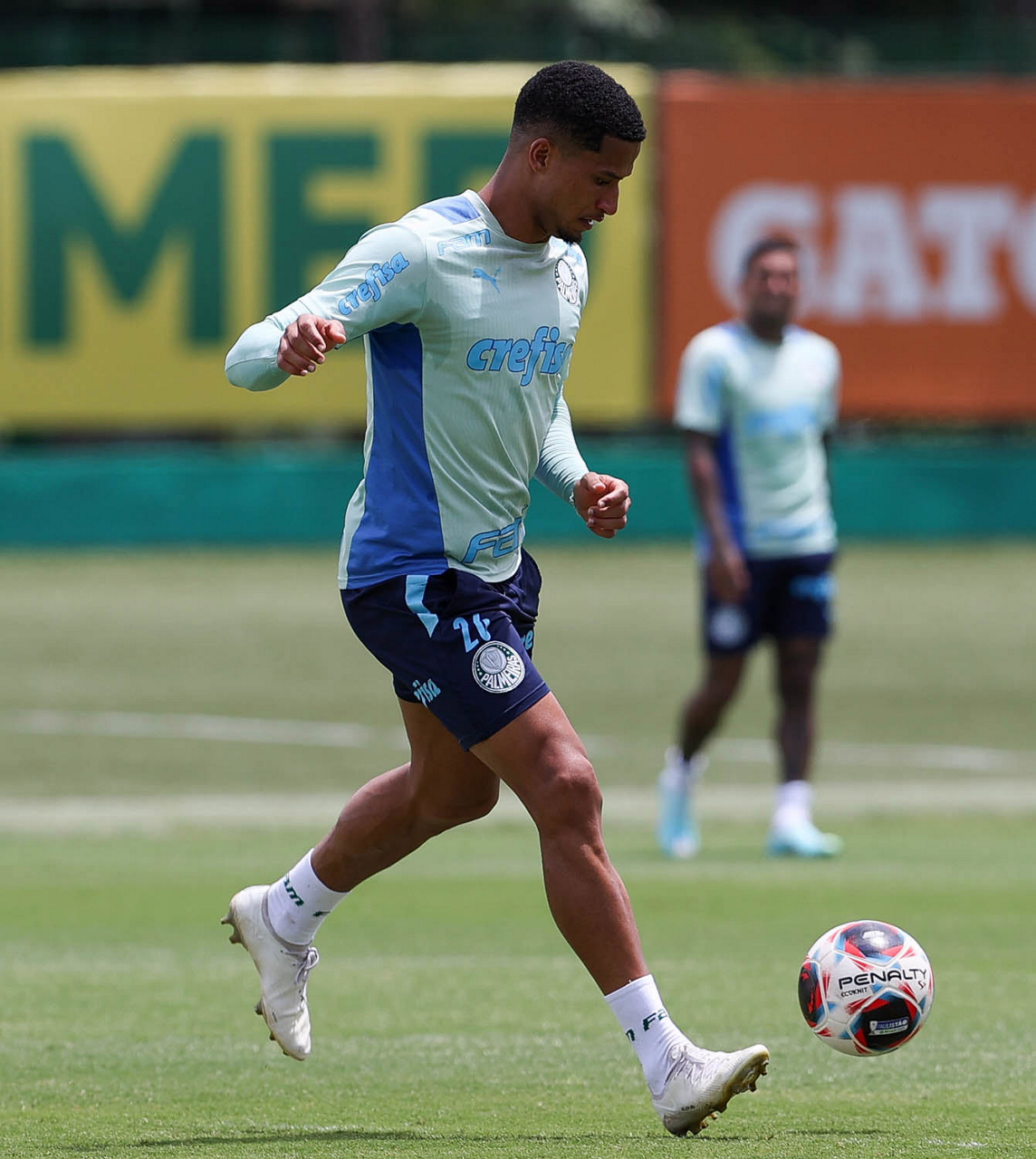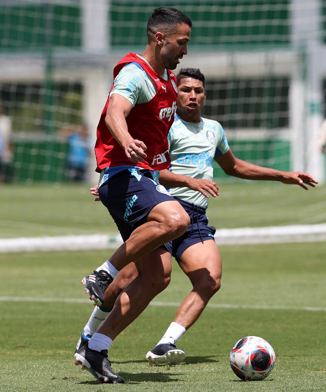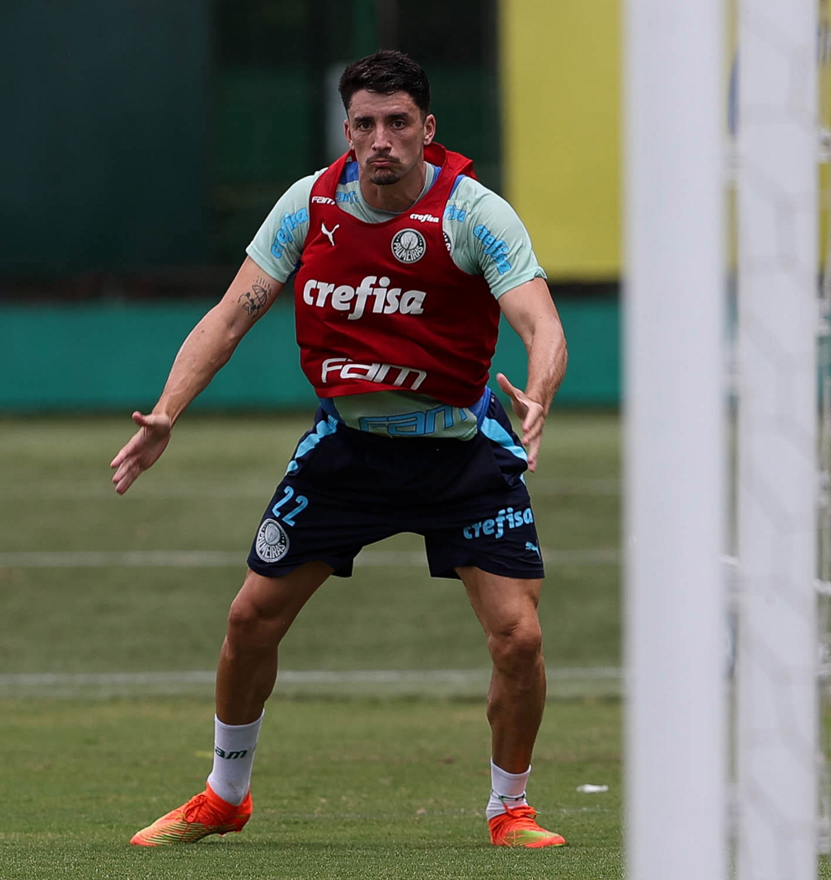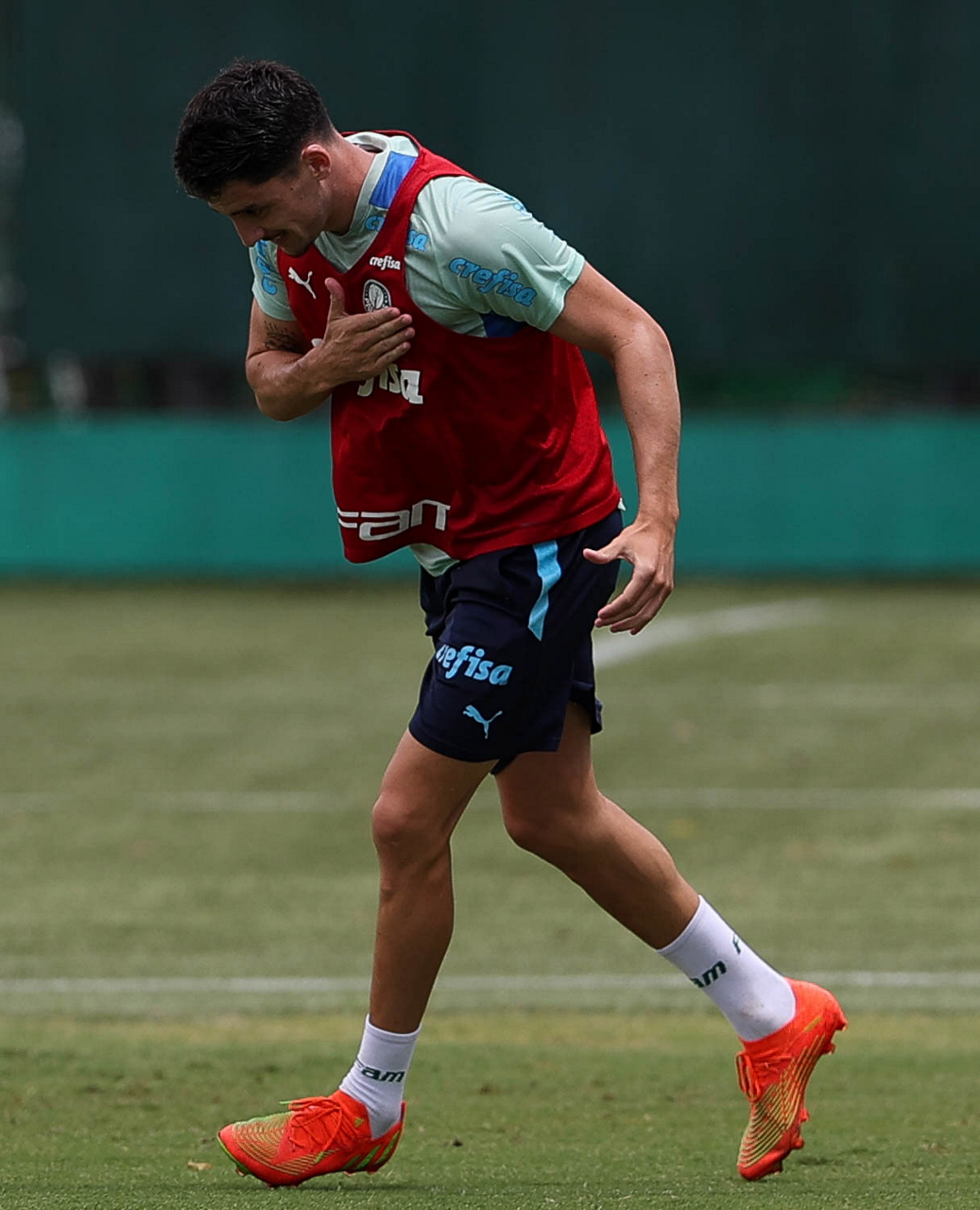 Os jogadores Marcos Rocha, Luan, Fabinho, Murilo, Jailson, Naves, Kaique e Garcia (E/D em pé) e Gustavo Gómez, Mayke, Vanderlan, Gabriel Menino e Joaquín Piquerez (E/D agachados), da SE Palmeiras, durante treinamento, na Academia de Futebol. (Foto: Cesar Greco/Palmeiras/by Canon)