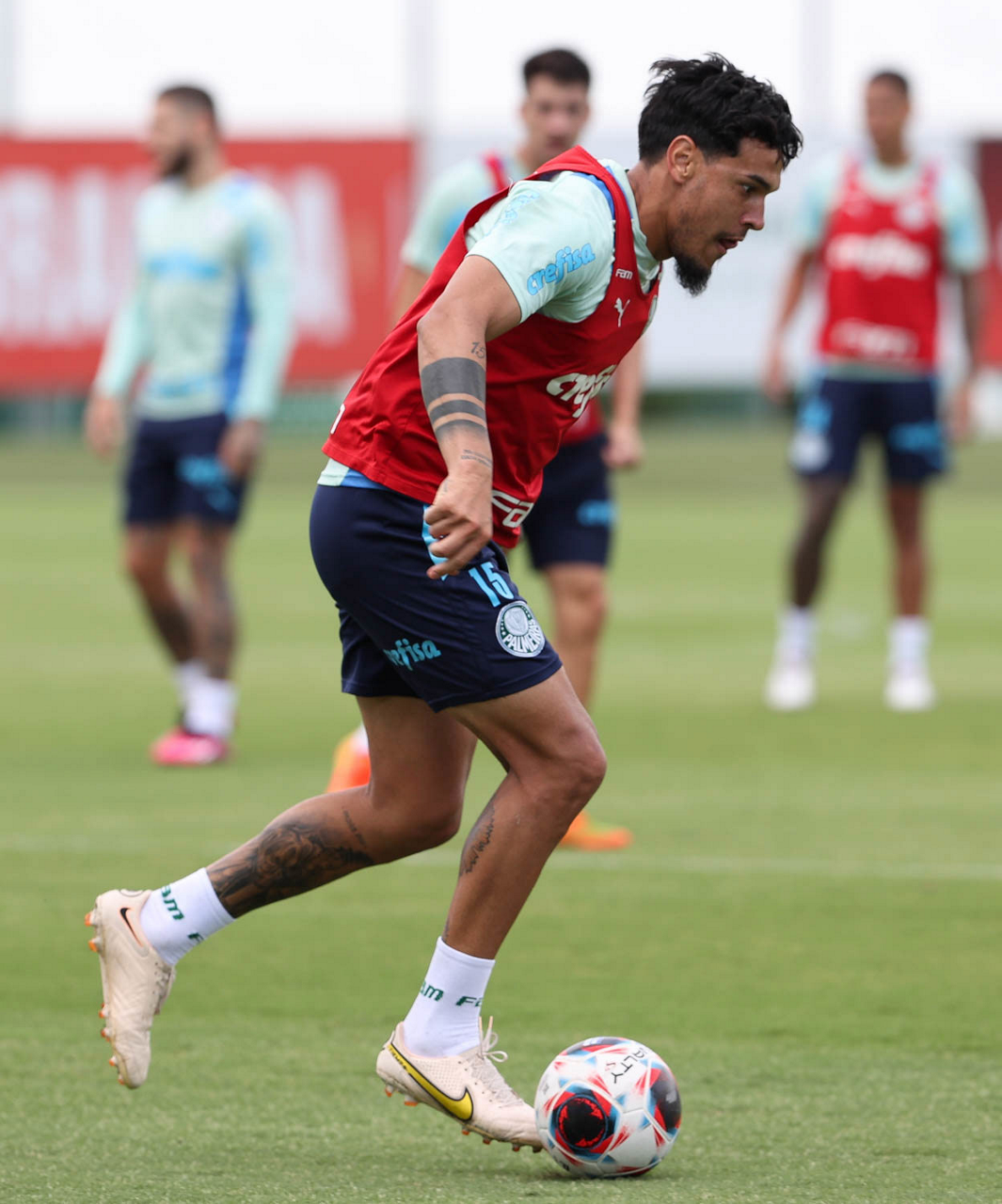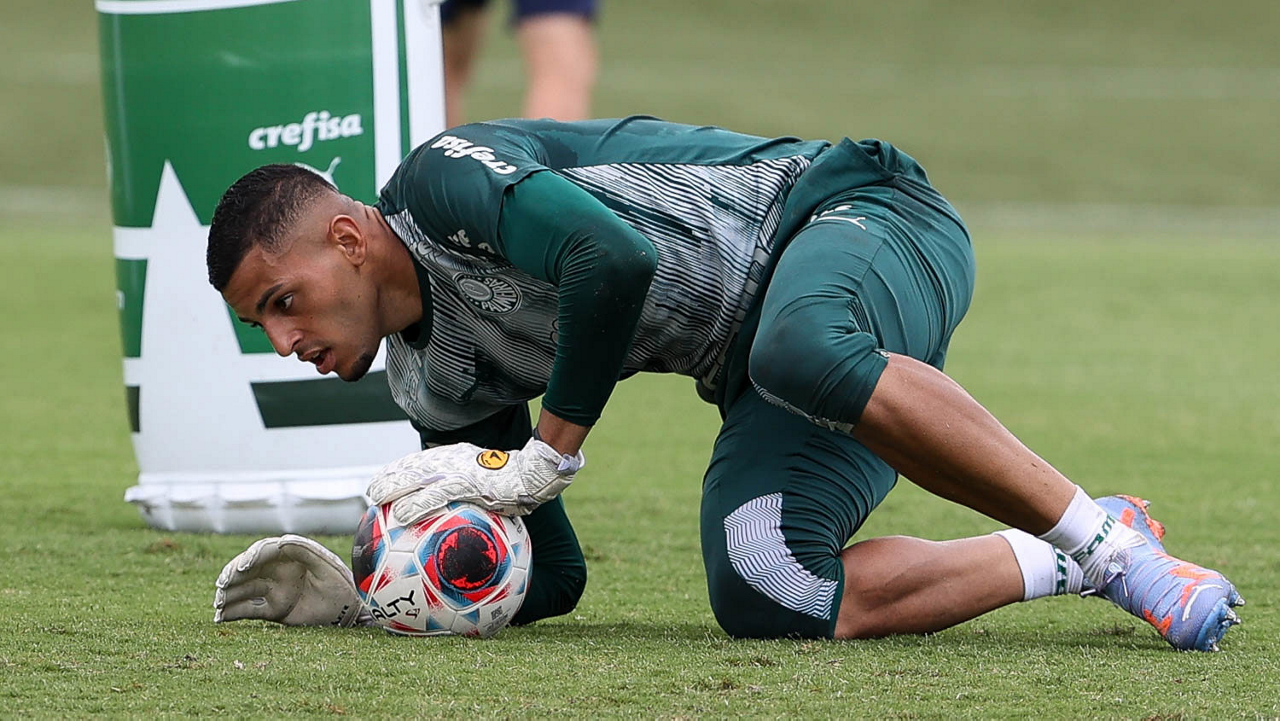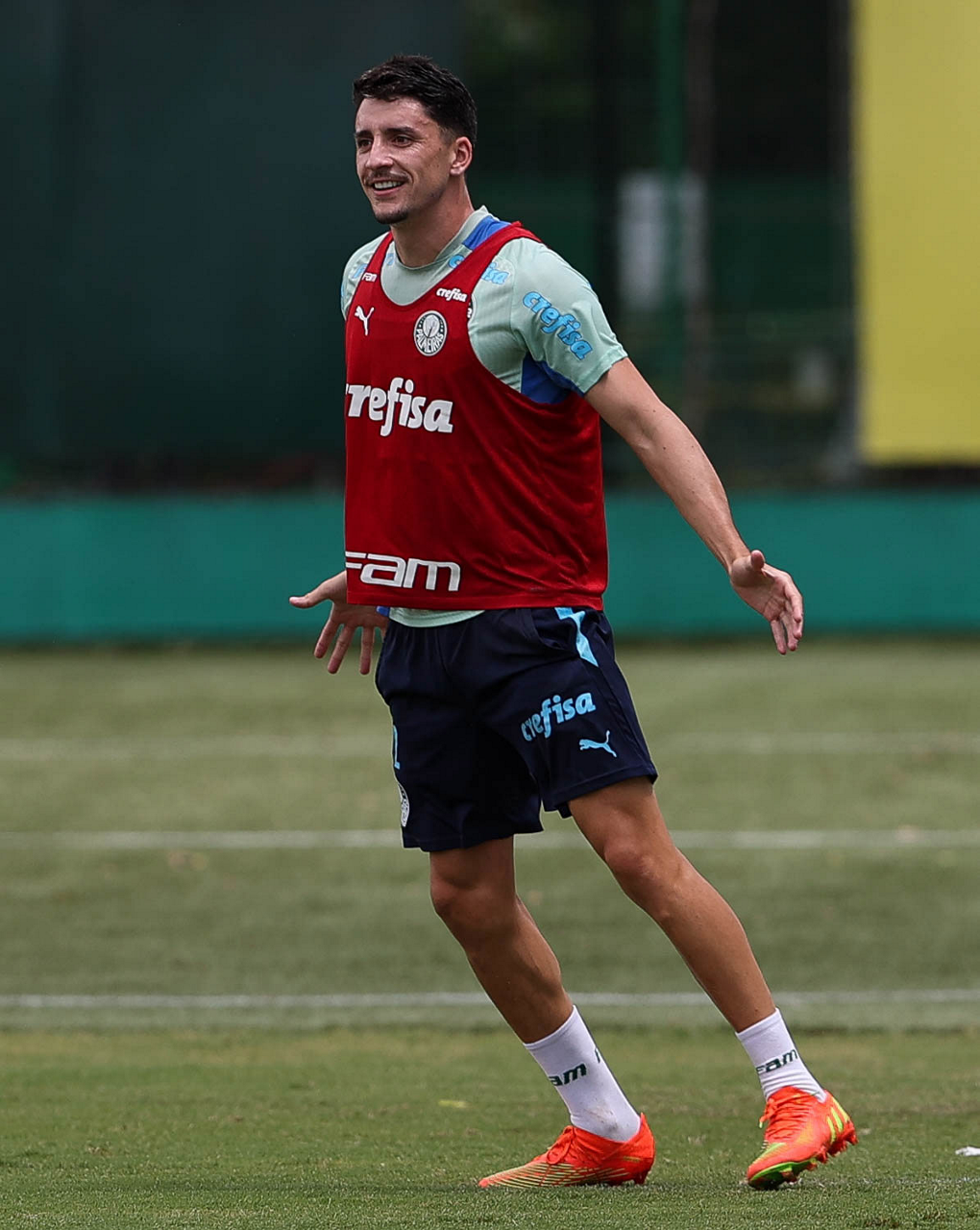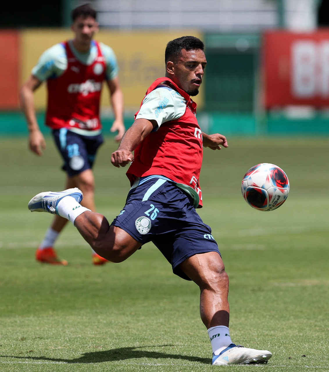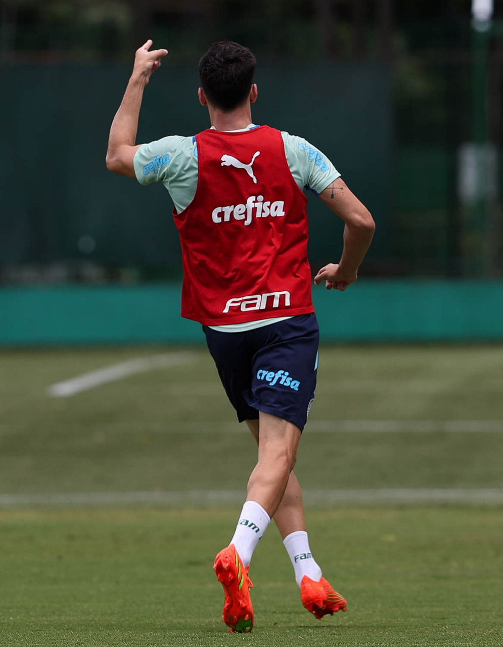 Os jogadores Marcos Rocha, Luan, Fabinho, Murilo, Jailson, Naves, Kaique e Garcia (E/D em pé) e Gustavo Gómez, Mayke, Vanderlan, Gabriel Menino e Joaquín Piquerez (E/D agachados), da SE Palmeiras, durante treinamento, na Academia de Futebol. (Foto: Cesar Greco/Palmeiras/by Canon)