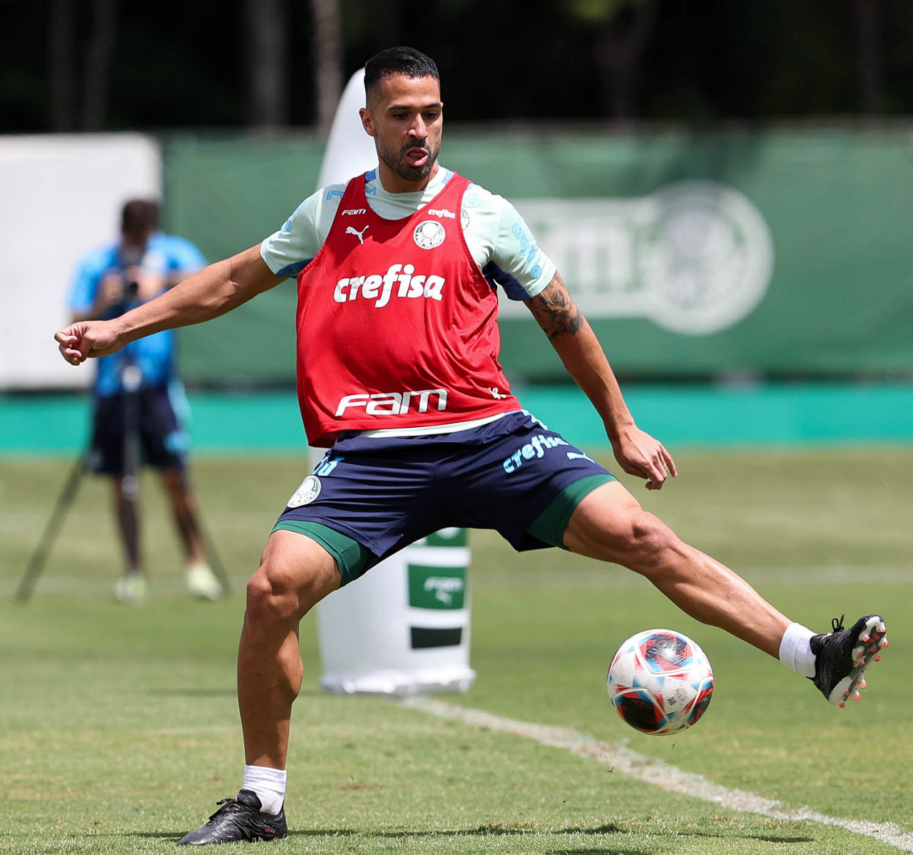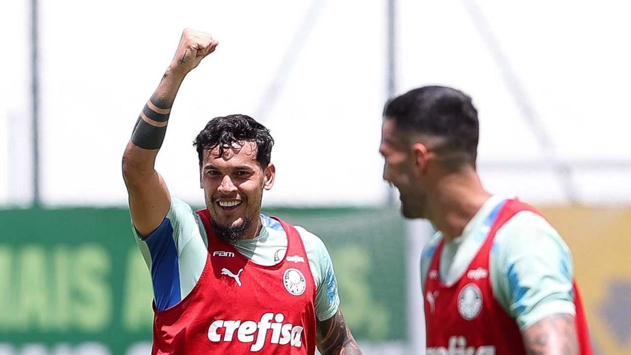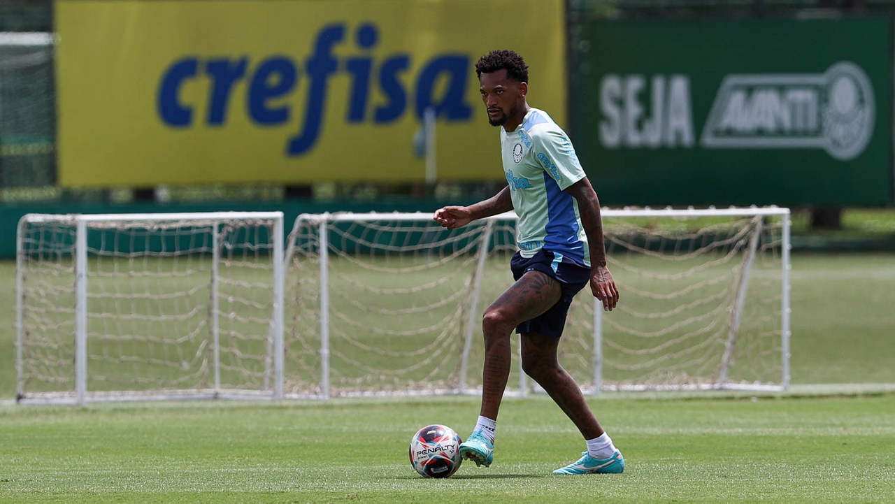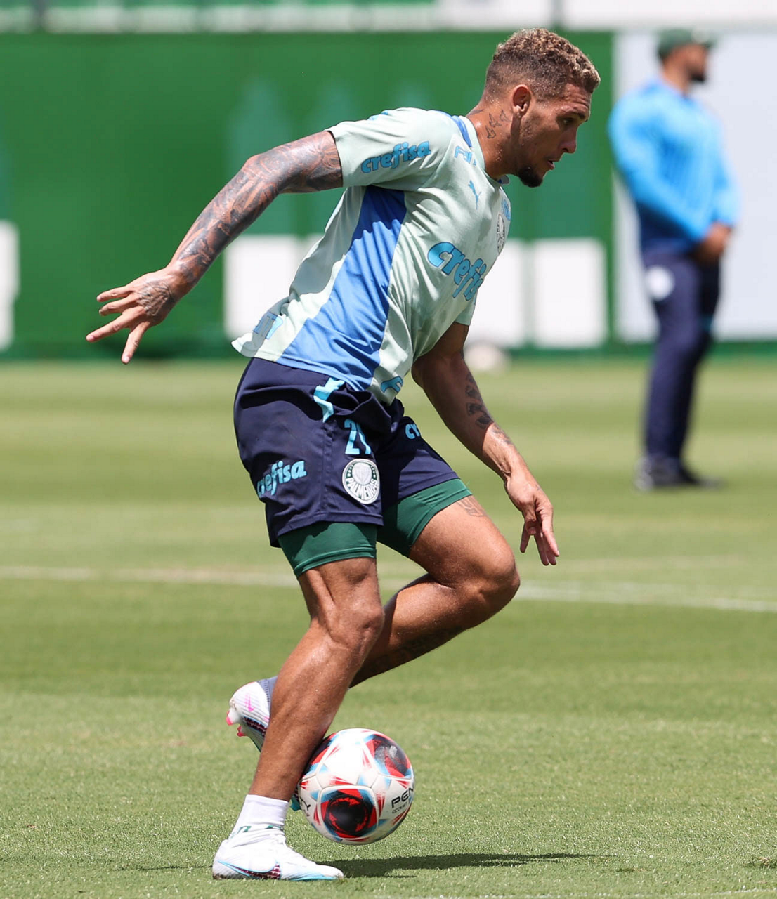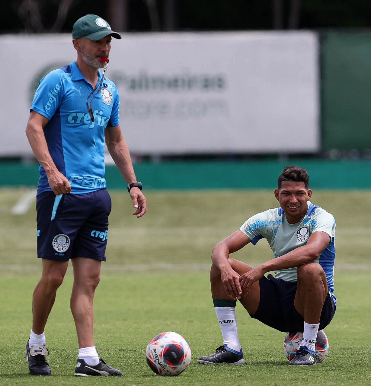 Os jogadores Marcos Rocha, Luan, Fabinho, Murilo, Jailson, Naves, Kaique e Garcia (E/D em pé) e Gustavo Gómez, Mayke, Vanderlan, Gabriel Menino e Joaquín Piquerez (E/D agachados), da SE Palmeiras, durante treinamento, na Academia de Futebol. (Foto: Cesar Greco/Palmeiras/by Canon)