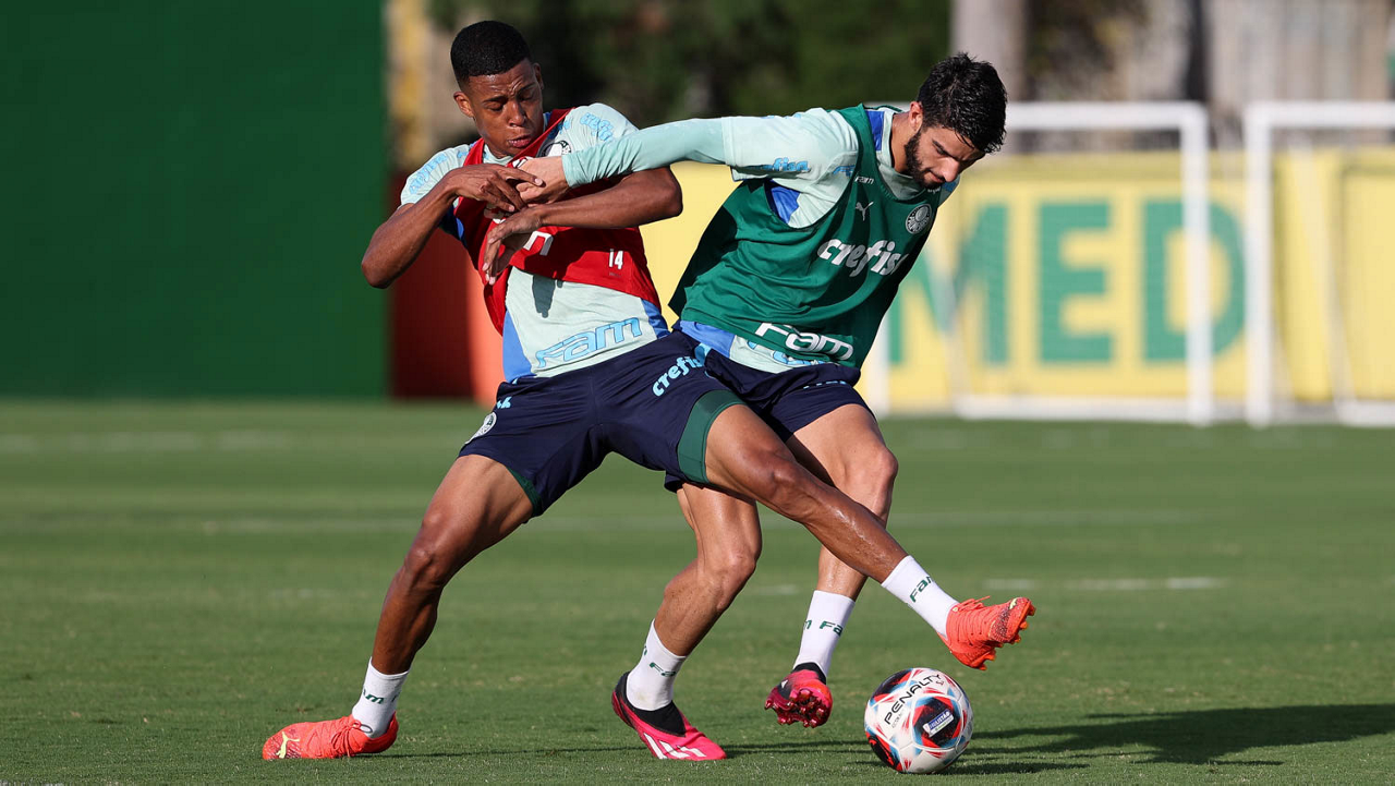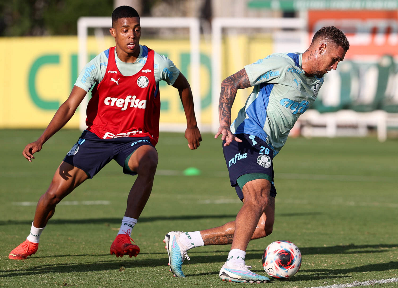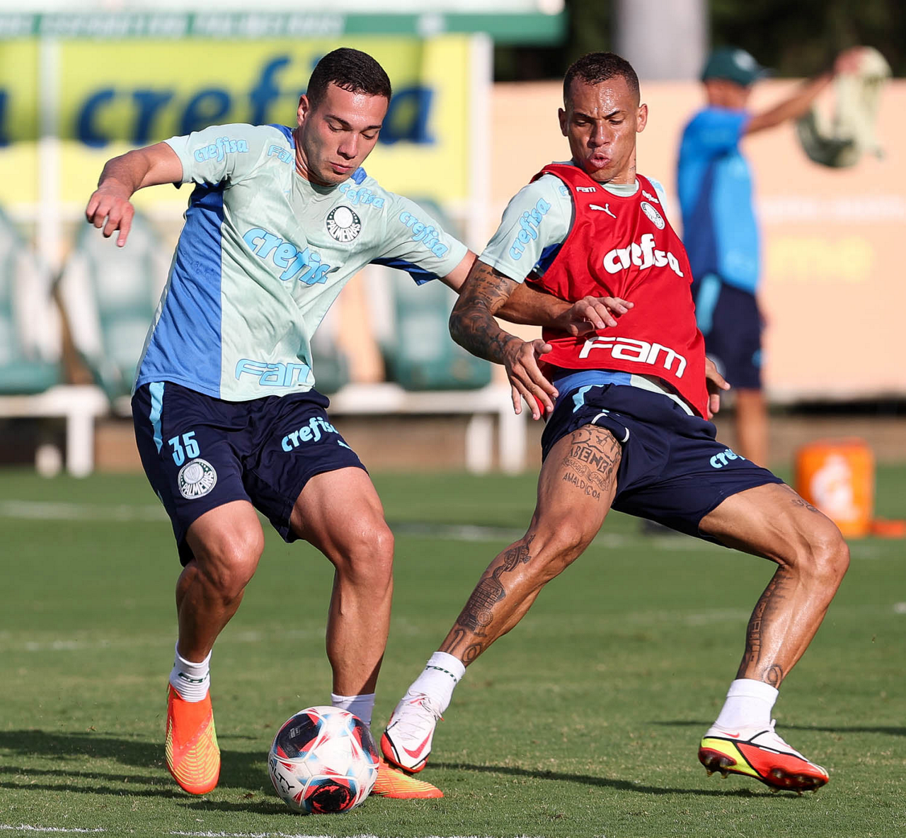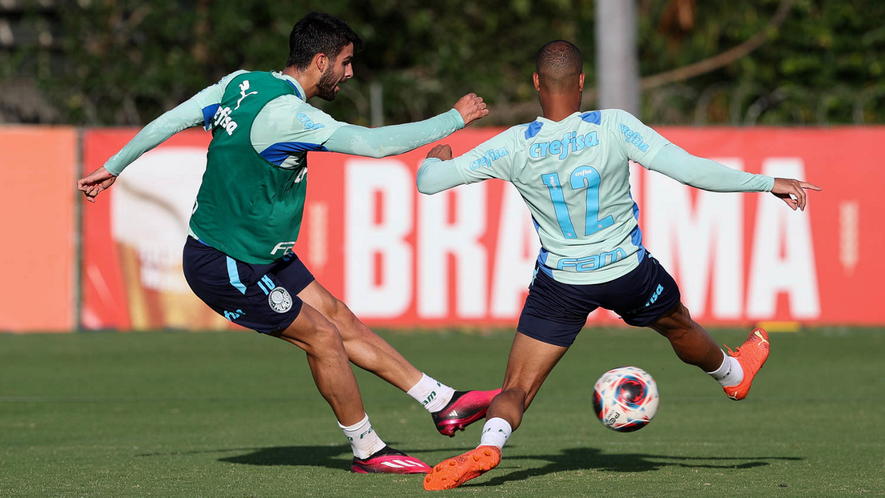 Os jogadores Fabinho e Breno Lopes (D), da SE Palmeiras, durante treinamento, na Academia de Futebol. (Foto: Cesar Greco/Palmeiras/by Canon)