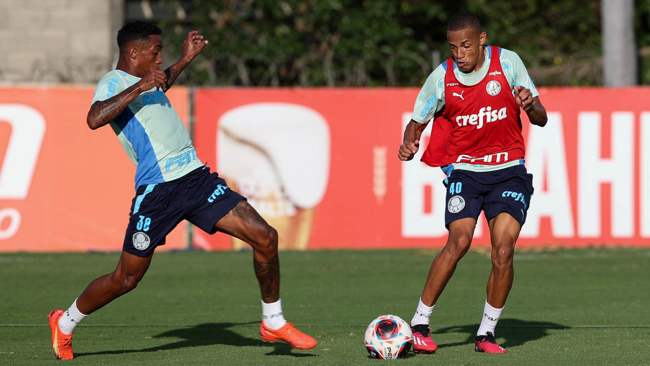 Os jogadores Kevin e Jhonatan (D), da SE Palmeiras, durante treinamento, na Academia de Futebol. (Foto: Cesar Greco/Palmeiras/by Canon)