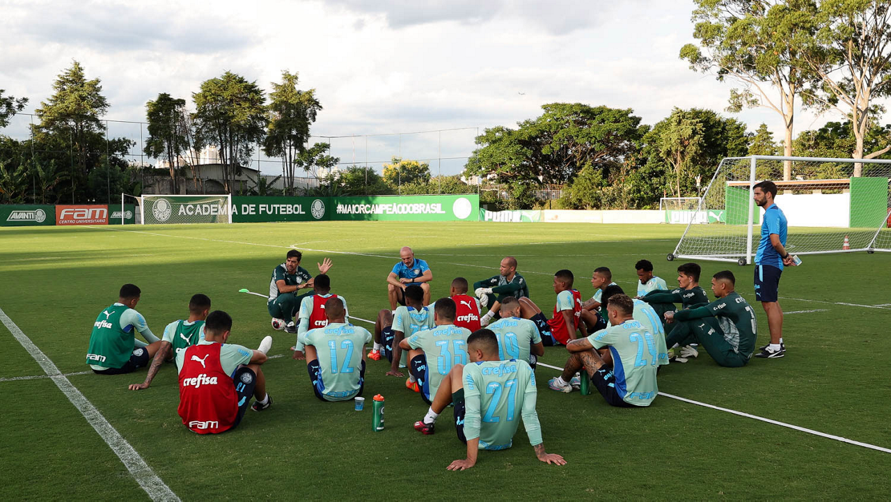O técnico Abel Ferreira, da SE Palmeiras, conversa com o elenco após treinamento, na Academia de Futebol. (Foto: Cesar Greco/Palmeiras/by Canon)