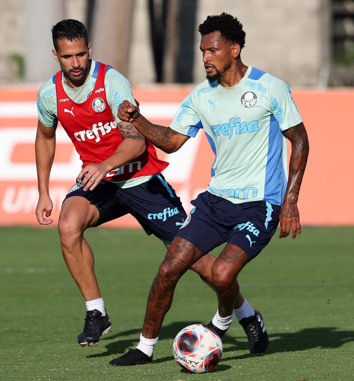 Os jogadores Fabinho e Jhonatan (D), da SE Palmeiras, durante treinamento, na Academia de Futebol. (Foto: Cesar Greco/Palmeiras/by Canon)