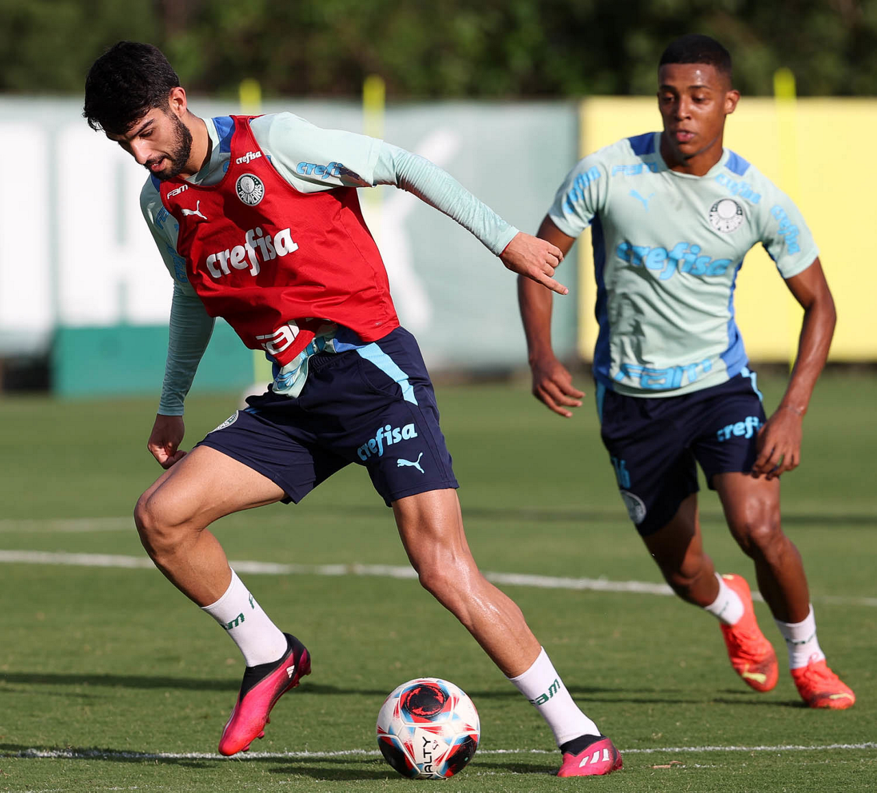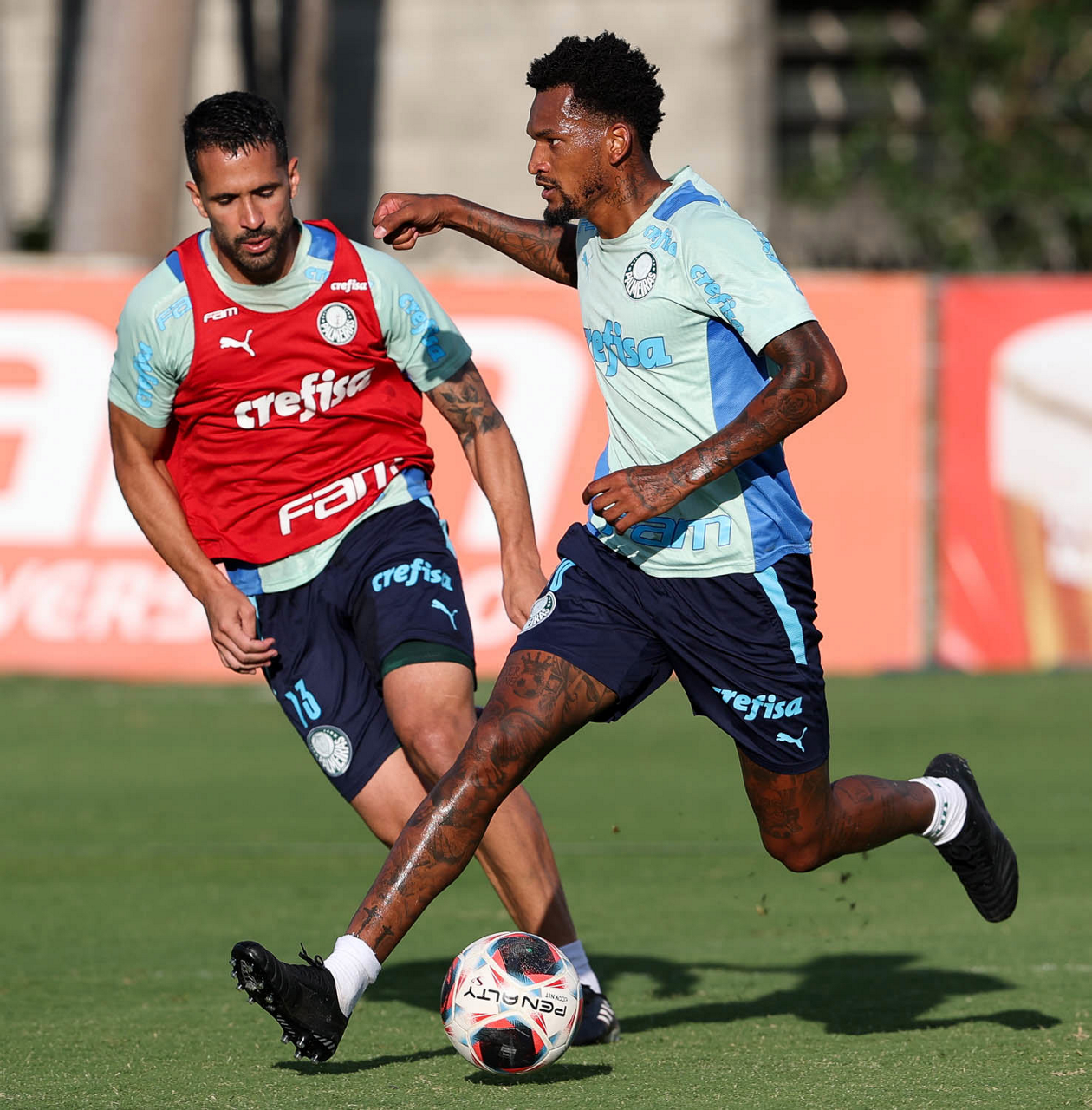 Os jogadores Luan e Breno Lopes (D), da SE Palmeiras, durante treinamento, na Academia de Futebol. (Foto: Cesar Greco/Palmeiras/by Canon)