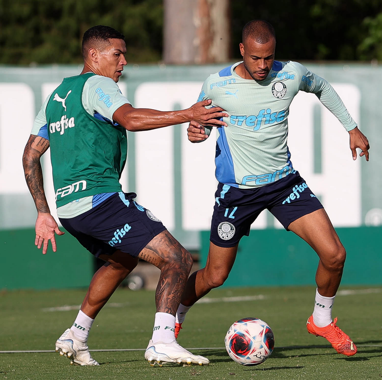 Os jogadores Flaco López e Mayke (D), da SE Palmeiras, durante treinamento, na Academia de Futebol. (Foto: Cesar Greco/Palmeiras/by Canon)