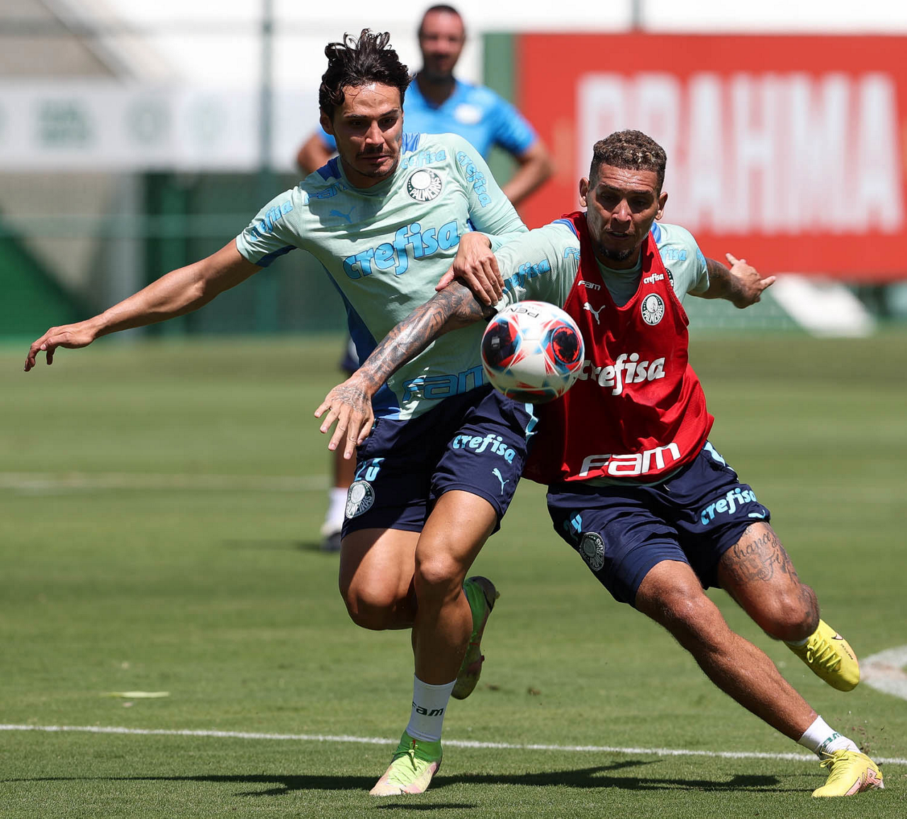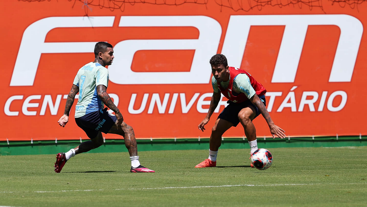 Raphael Veiga e Gabriel Menino (D), da SE Palmeiras, durante treinamento, na Academia de Futebol. (Foto: Cesar Greco/Palmeiras/by Canon)