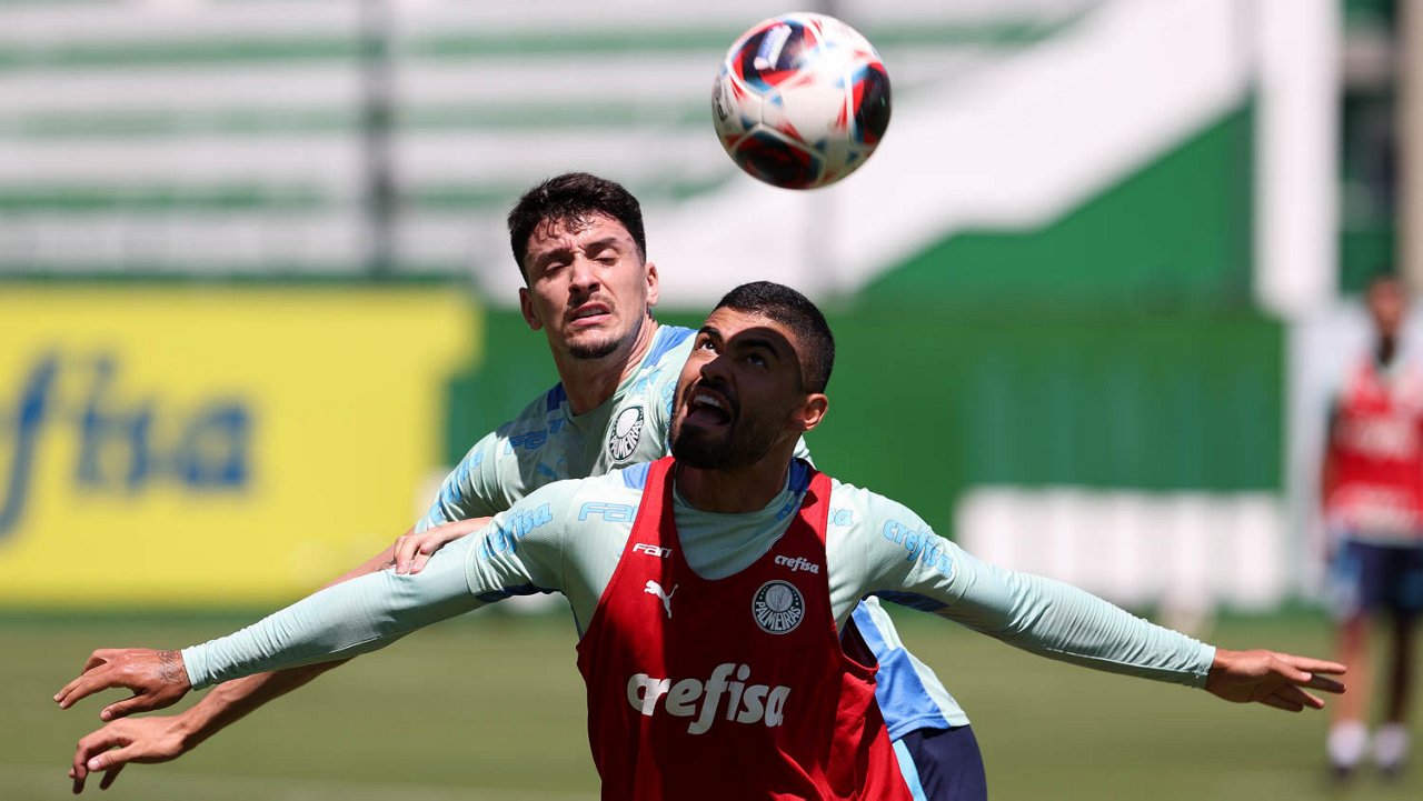 Os jogadores Gustavo Gómez e Raphael Veiga (D), da SE Palmeiras, durante treinamento, na Academia de Futebol. (Foto: Cesar Greco/Palmeiras/by Canon)