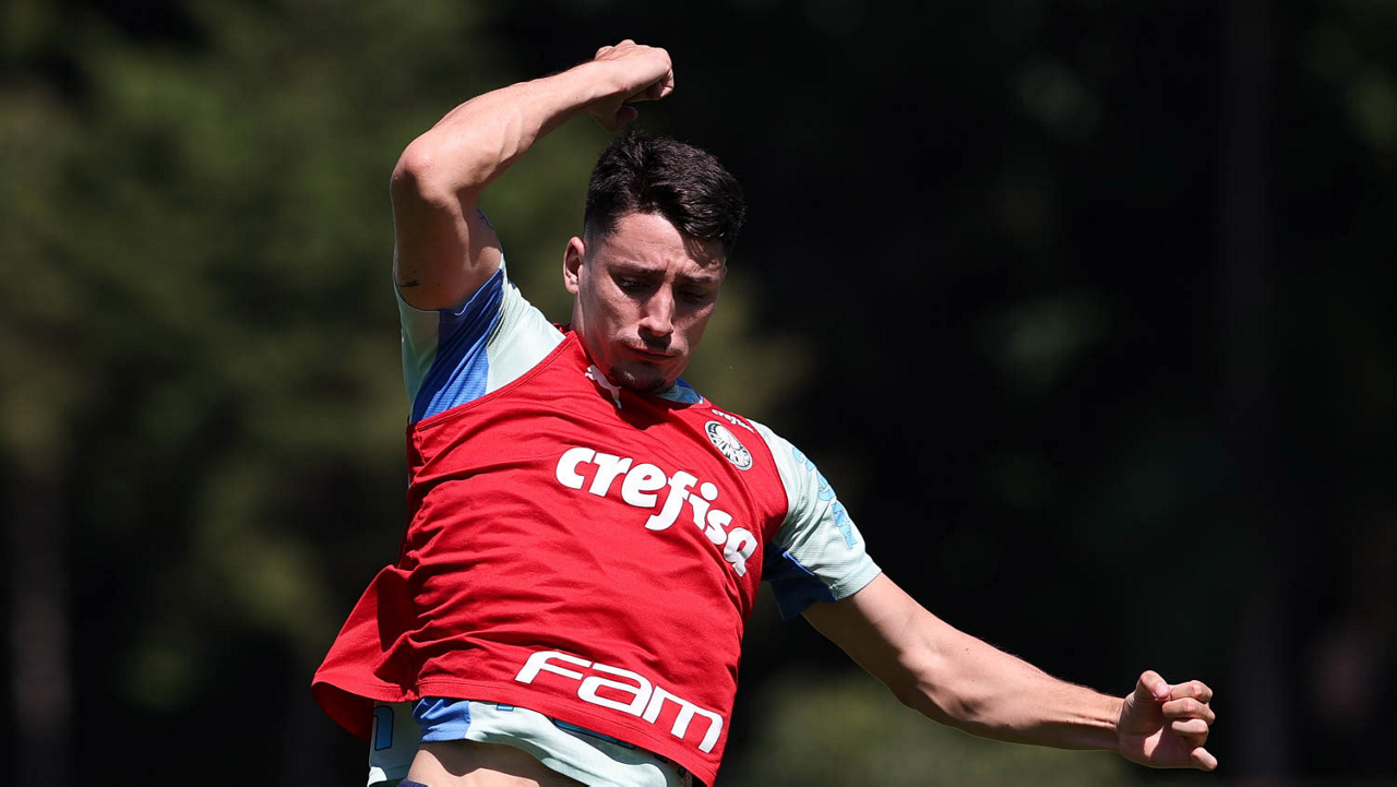 Os jogadores Gustavo Gómez, Joaquín Piquerez, Murilo, Jailson, Fabinho, Luan, Naves (E/D em pé) e Mayke, Gabriel Menino, Vanderlan, Garcia e o goleiro Marcelo Lomba (E/D agachados), da SE Palmeiras, durante treinamento, na Academia de Futebol. (Foto: Cesar Greco/Palmeiras/by Canon)