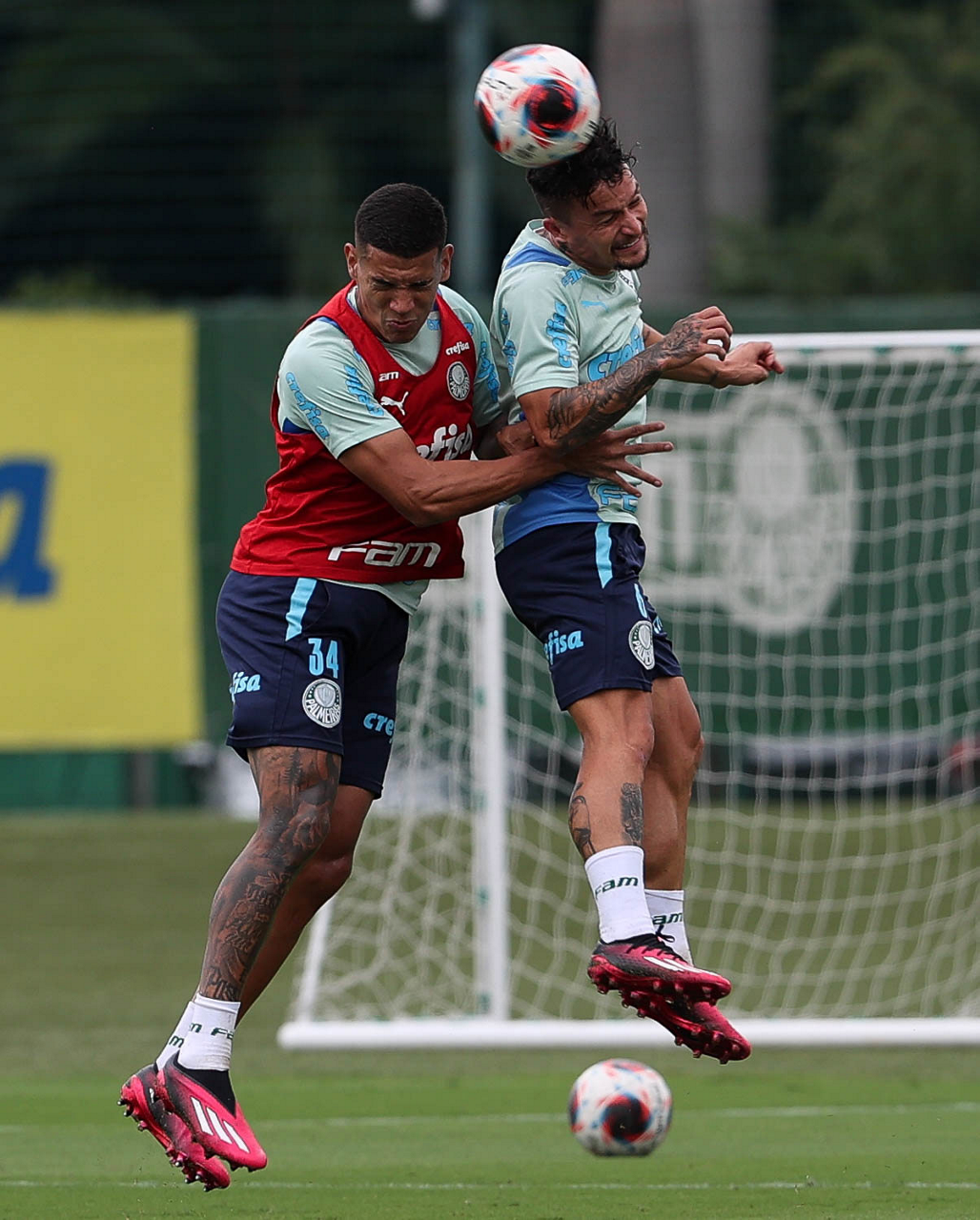 Os jogadores Marcos Rocha, Jailson, Fabinho, Garcia, Naves, Murilo, Luan e o goleiro Marcelo Lomba (E/D em pé) e Vanderlan, Gabriel Menino, Richard Ríos e Gustavo Gómez (E/D agachados), da SE Palmeiras, durante treinamento, na Academia de Futebol. (Foto: Cesar Greco/Palmeiras/by Canon)