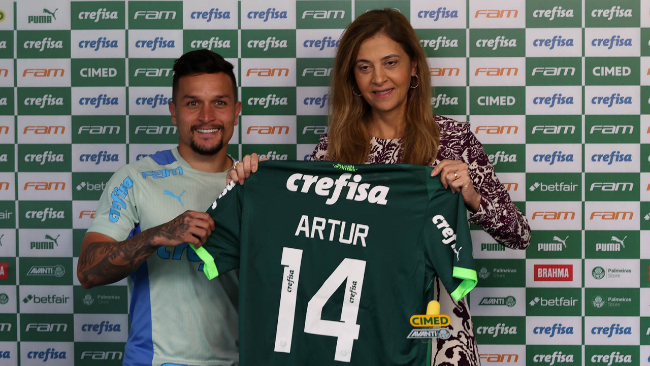 A presidente Leila Pereira, da SE Palmeiras, apresenta o novo atleta do clube Artur (E), na Academia de Futebol. (Foto: Cesar Greco/Palmeiras/by Canon)