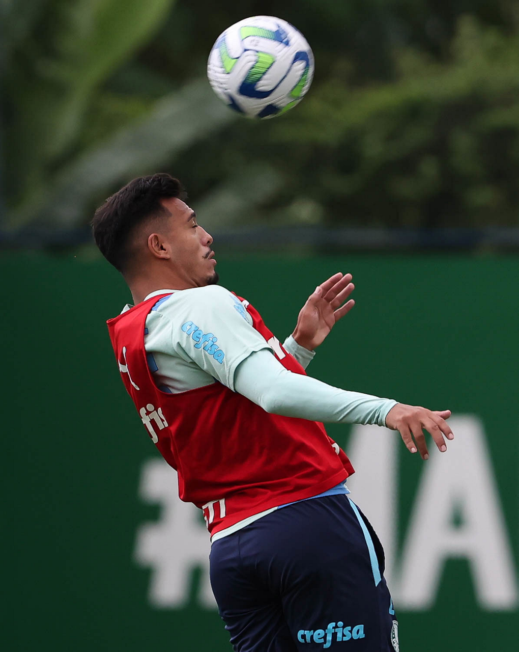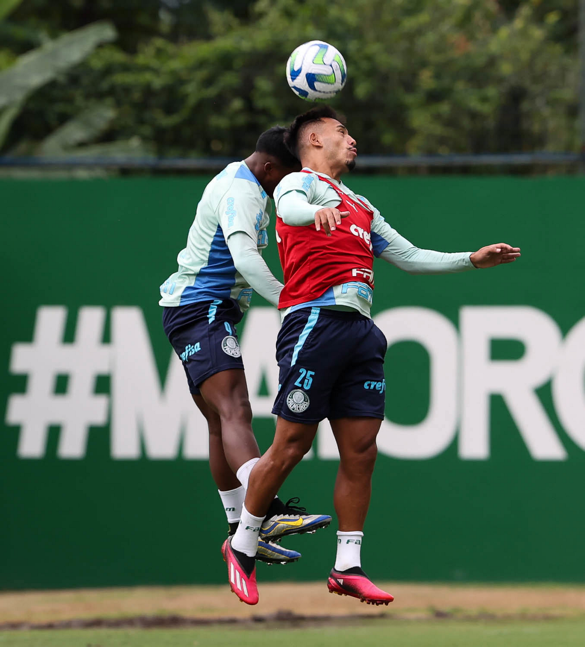 O goleiro Marcelo Lomba e os jogadores Garcia, Murilo, Naves, Luan, Fabinho e Marcos Rocha (E/D em pé) e Richard Ríos, Joaquín Piquerez, Gabriel Menino, Vanderlan e Gustavo Gómez (E/D agachados), da SE Palmeiras, durante treinamento, na Academia de Futebol. (Foto: Cesar Greco/Palmeiras/by Canon)