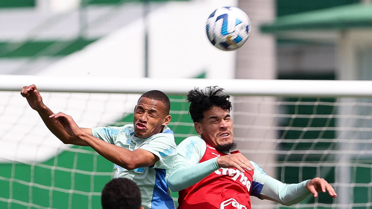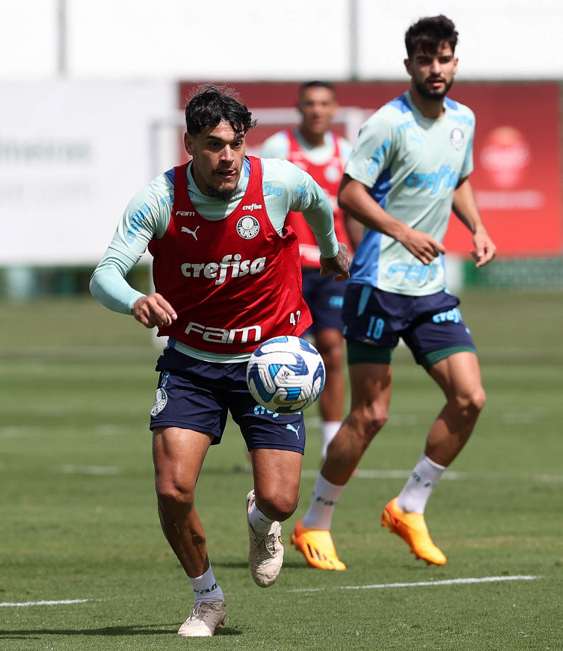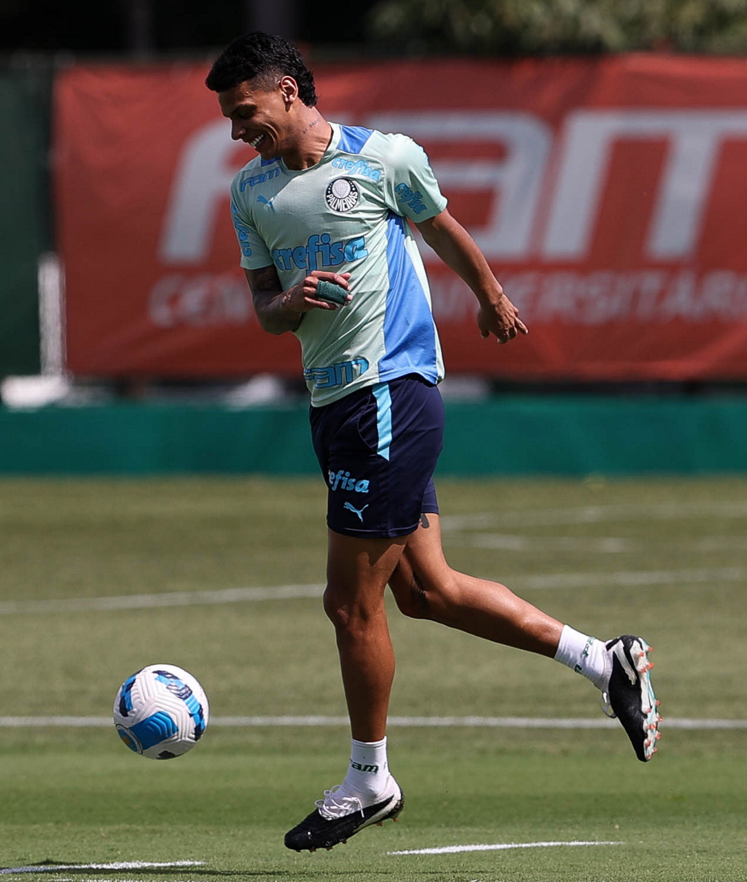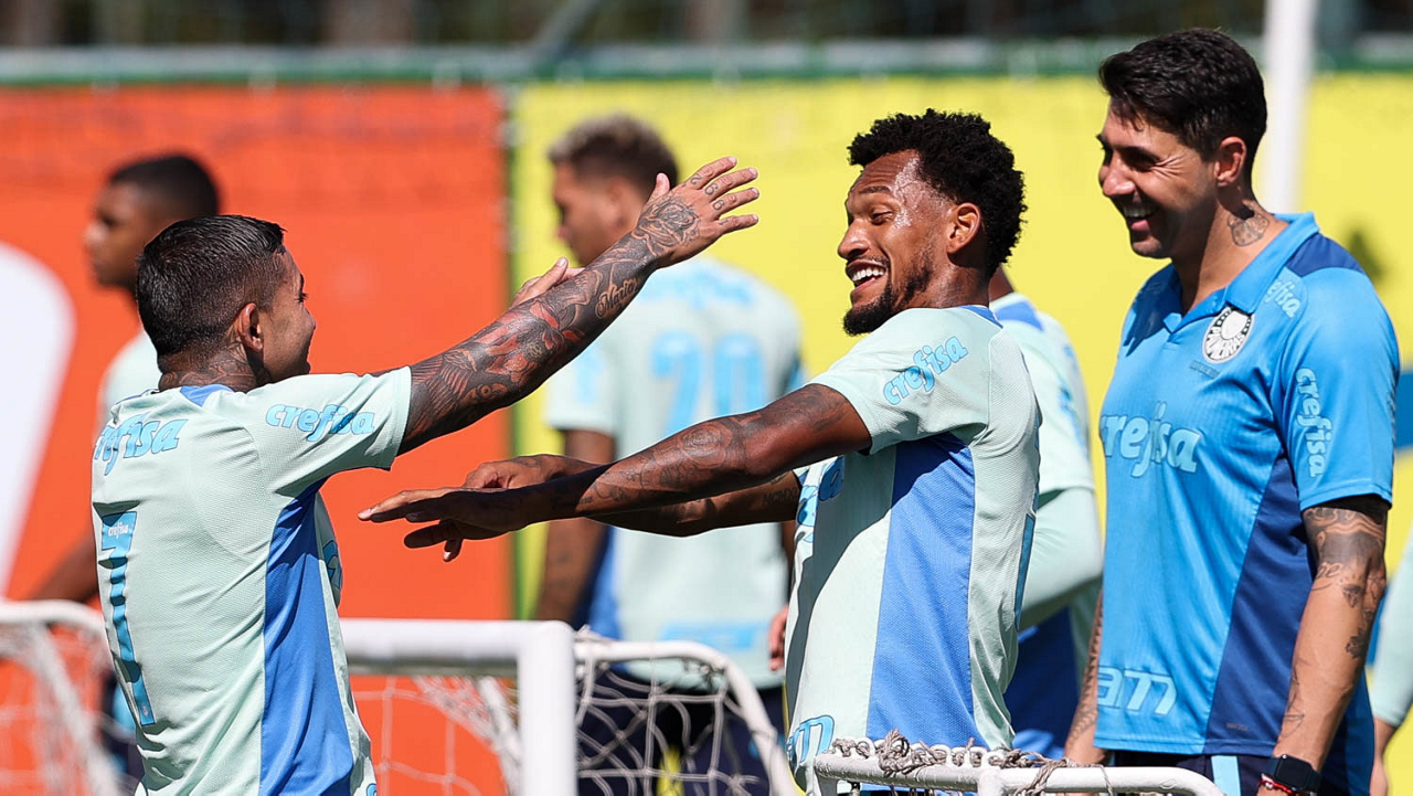 O goleiro Weverton e os jogadores Flaco López, Luis Guilherme, Jhonatan, Rafael Navarro, Giovani e Breno Lopes (E/D em pé) e Rony, Endrick, Zé Rafael, Richard Ríos, Dudu e Artur (E/D agachados), da SE Palmeiras, durante treinamento, na Academia de Futebol. (Foto: Cesar Greco/Palmeiras/by Canon)