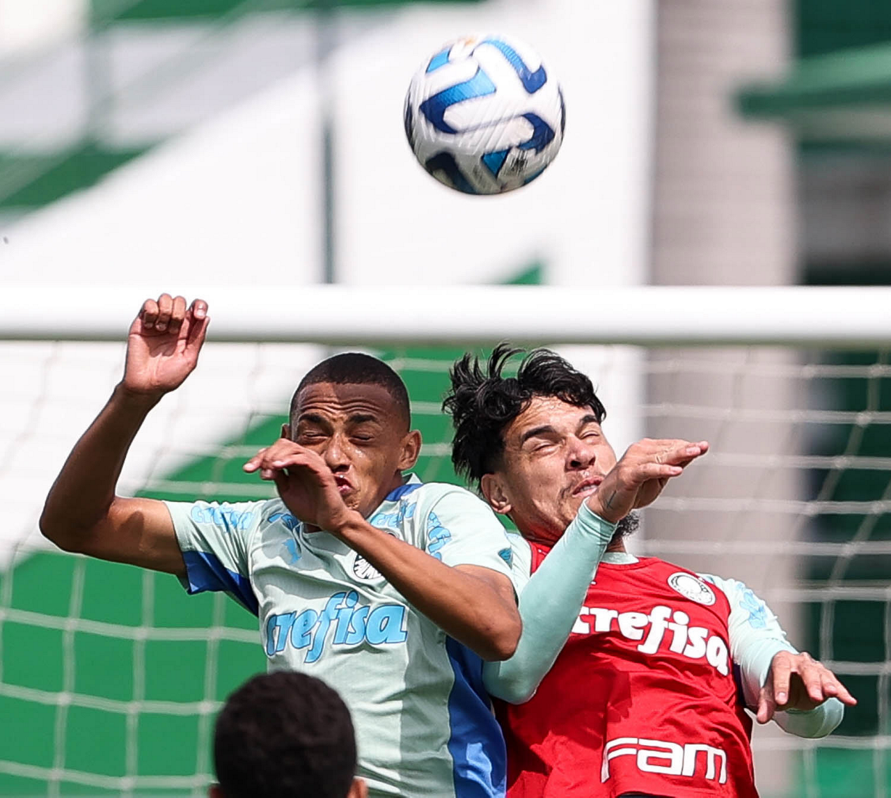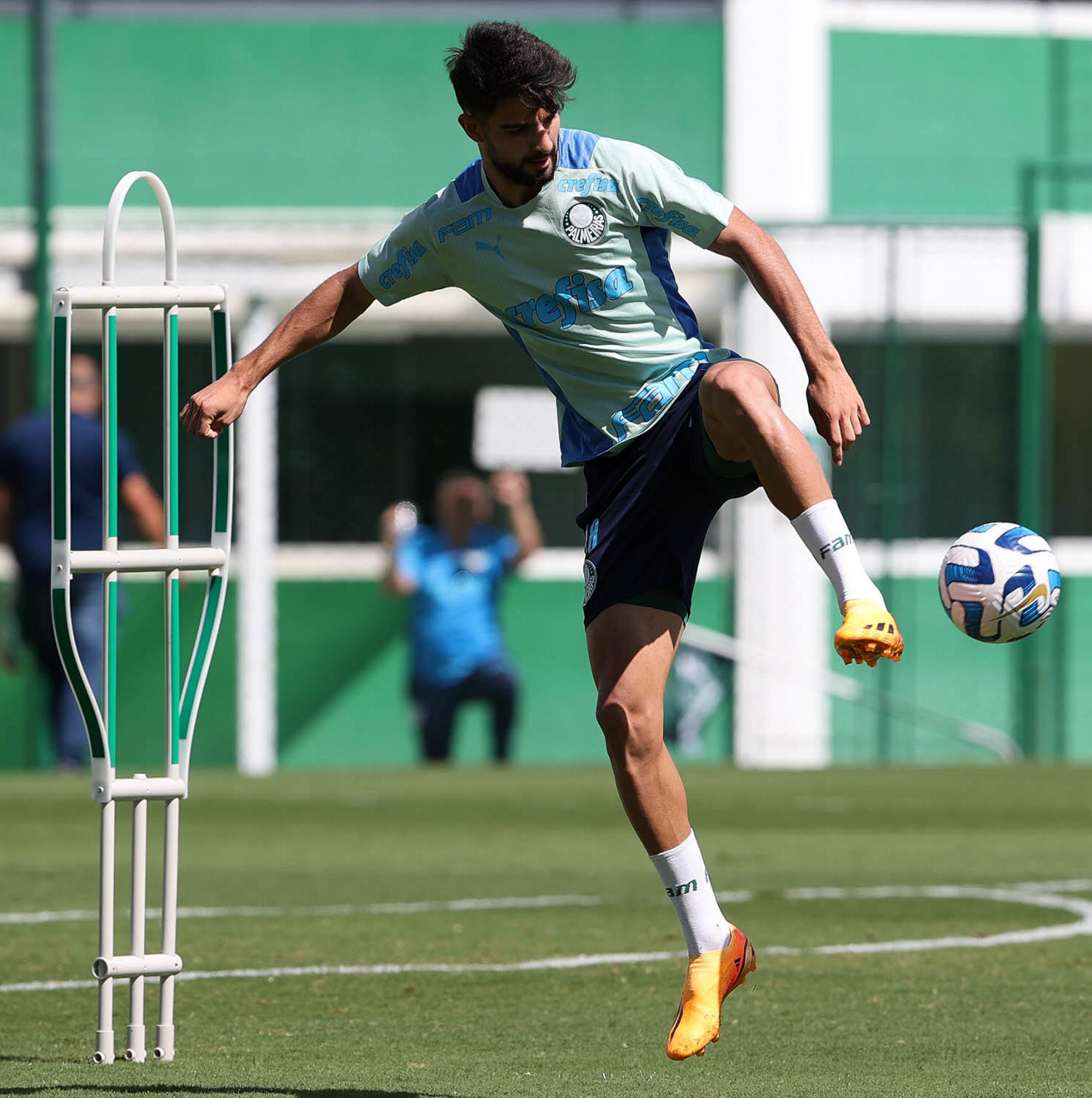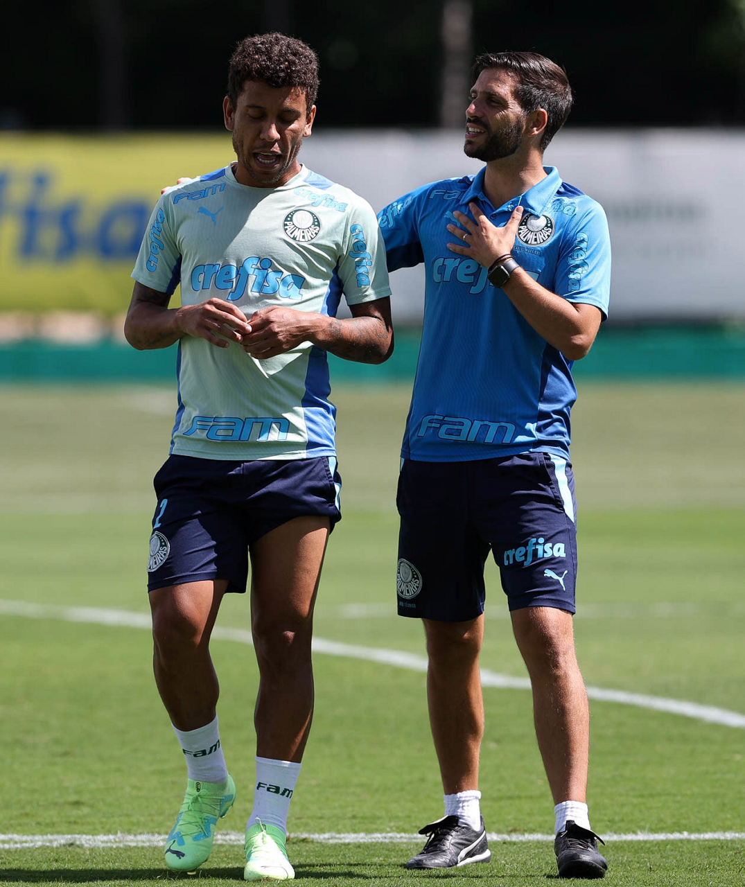 O goleiro Weverton e os jogadores Flaco López, Luis Guilherme, Jhonatan, Rafael Navarro, Giovani e Breno Lopes (E/D em pé) e Rony, Endrick, Zé Rafael, Richard Ríos, Dudu e Artur (E/D agachados), da SE Palmeiras, durante treinamento, na Academia de Futebol. (Foto: Cesar Greco/Palmeiras/by Canon)