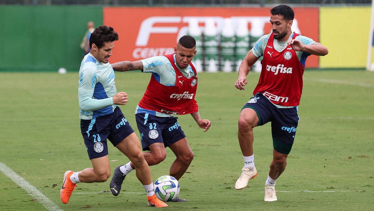 Os jogadores Raphael Veiga, Garcia e Luan (E/D), da SE Palmeiras, durante treinamento, na Academia de Futebol. (Foto: Cesar Greco/Palmeiras/by Canon)