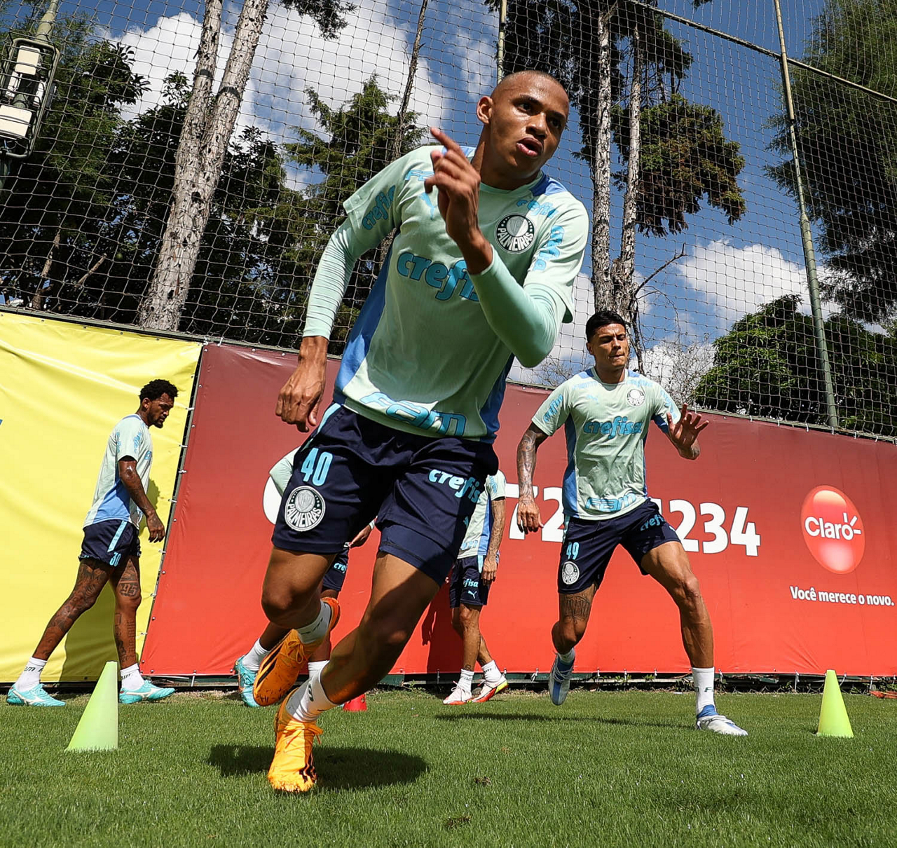 Os jogadores Richard Ríos e Endrick (D), da SE Palmeiras, durante treinamento, na Academia de Futebol. (Foto: Cesar Greco/Palmeiras/by Canon)