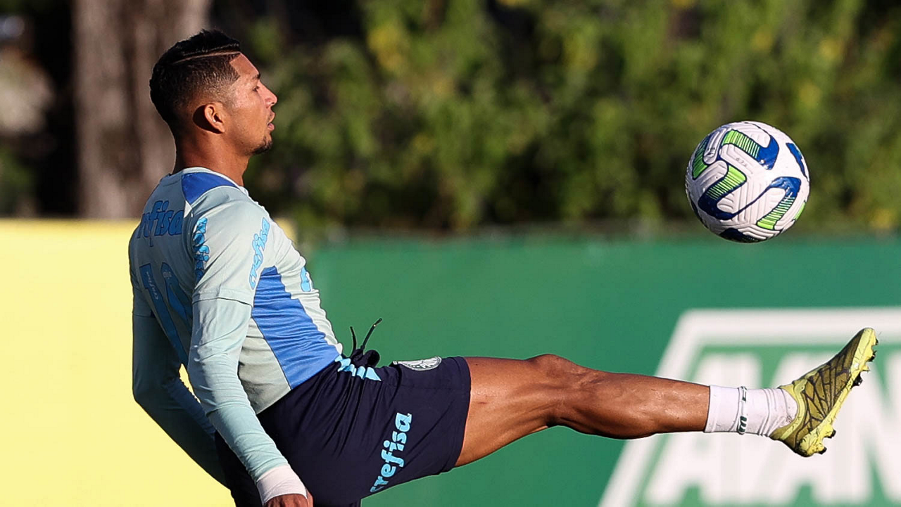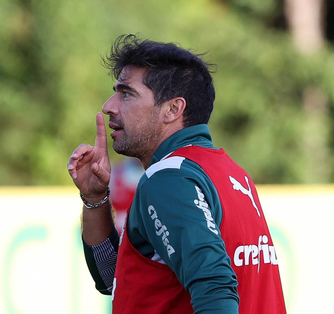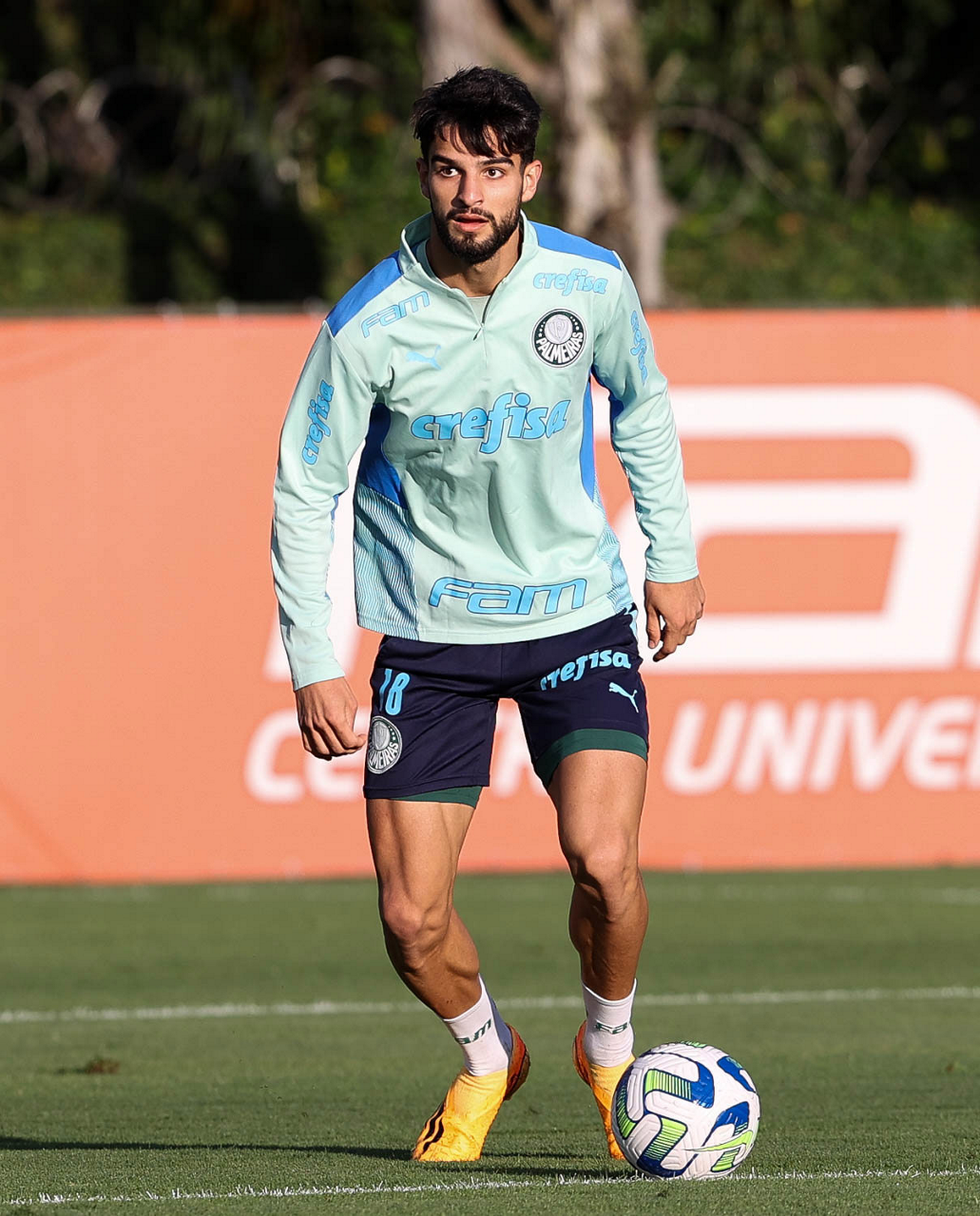 Os jogadores Luan, Fabinho, Garcia, Vanderlan, Jailson e Naves (E/D em pé) e Gustavo Gómez, Marcelo Lomba, Mayke, Joaquín Piquerez, Gabriel Menino e Richard Ríos (E/D agachados), da SE Palmeiras, durante treinamento, na Academia de Futebol. (Foto: Cesar Greco/Palmeiras/by Canon)