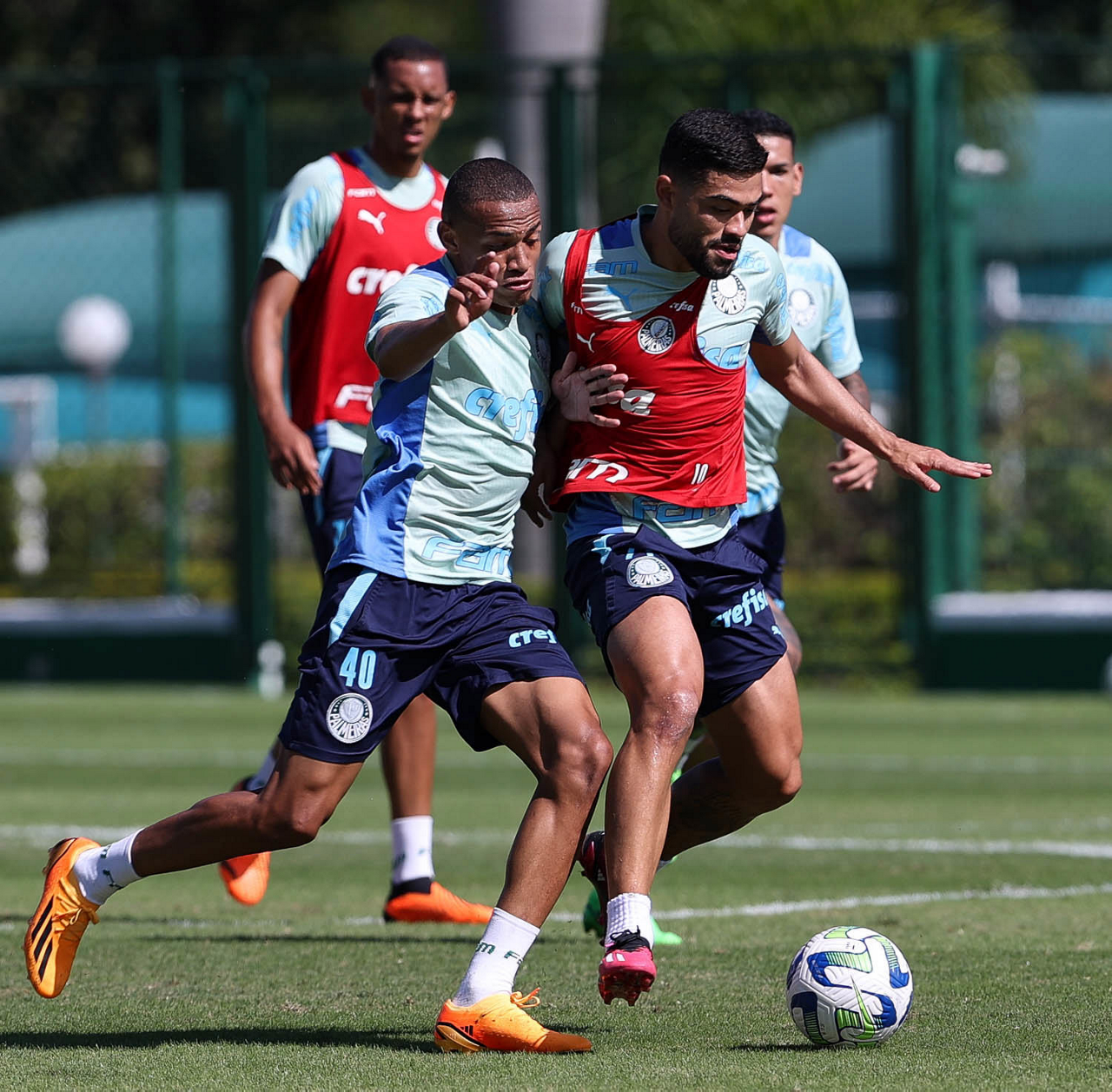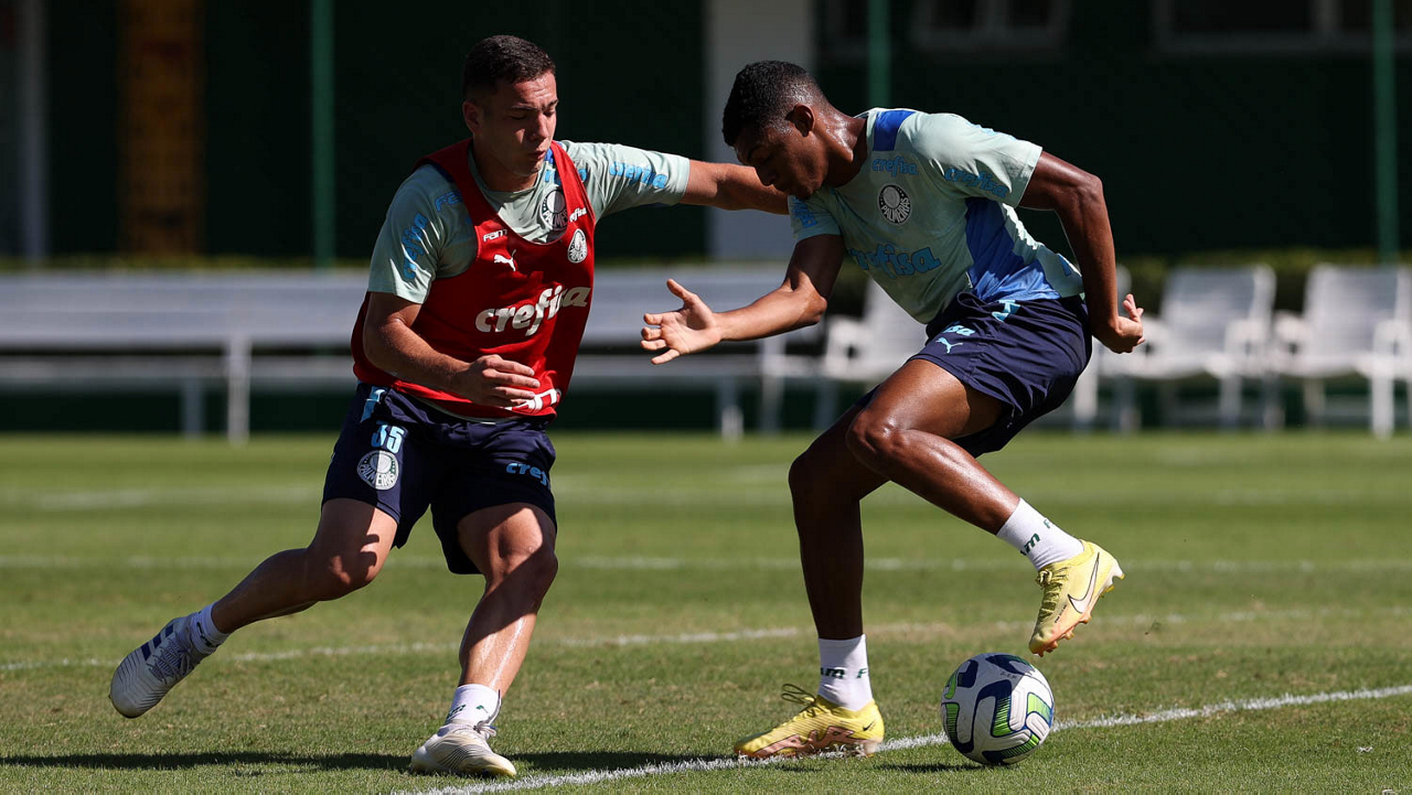 Os jogadores Naves e Endrick (D), da SE Palmeiras, durante treinamento, na Academia de Futebol. (Foto: Cesar Greco/Palmeiras/by Canon)
