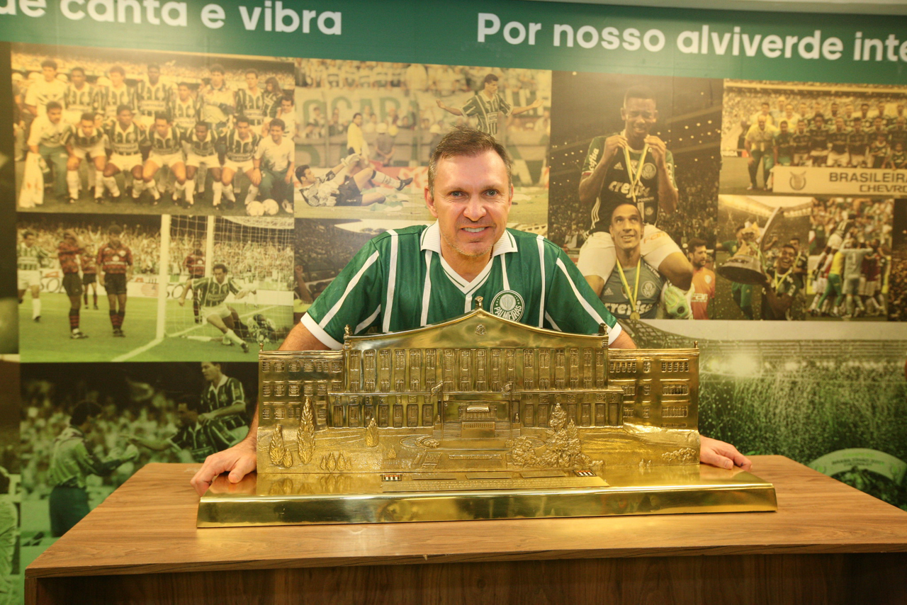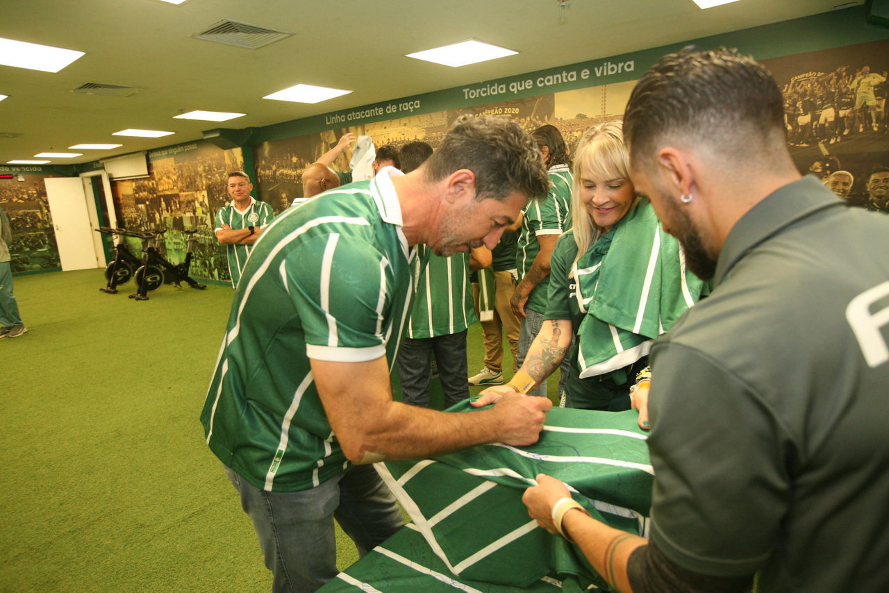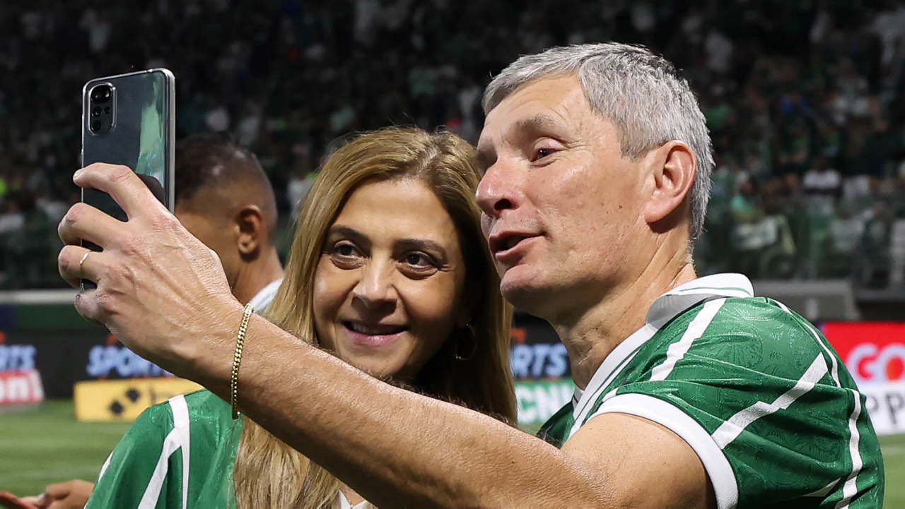 A presidente Leila Pereira, da SE Palmeiras, faz foto com o ex-jogador Paulo Sergio do clube, em homenagem ao time campeão Paulista de 1993, no intervalo do jogo contra a equipe do Coritiba FC, durante partida válida pela nona rodada, do Campeonato Brasileiro, Série A, na arena Allianz Parque. (Foto: Cesar Greco/Palmeiras/by Canon)