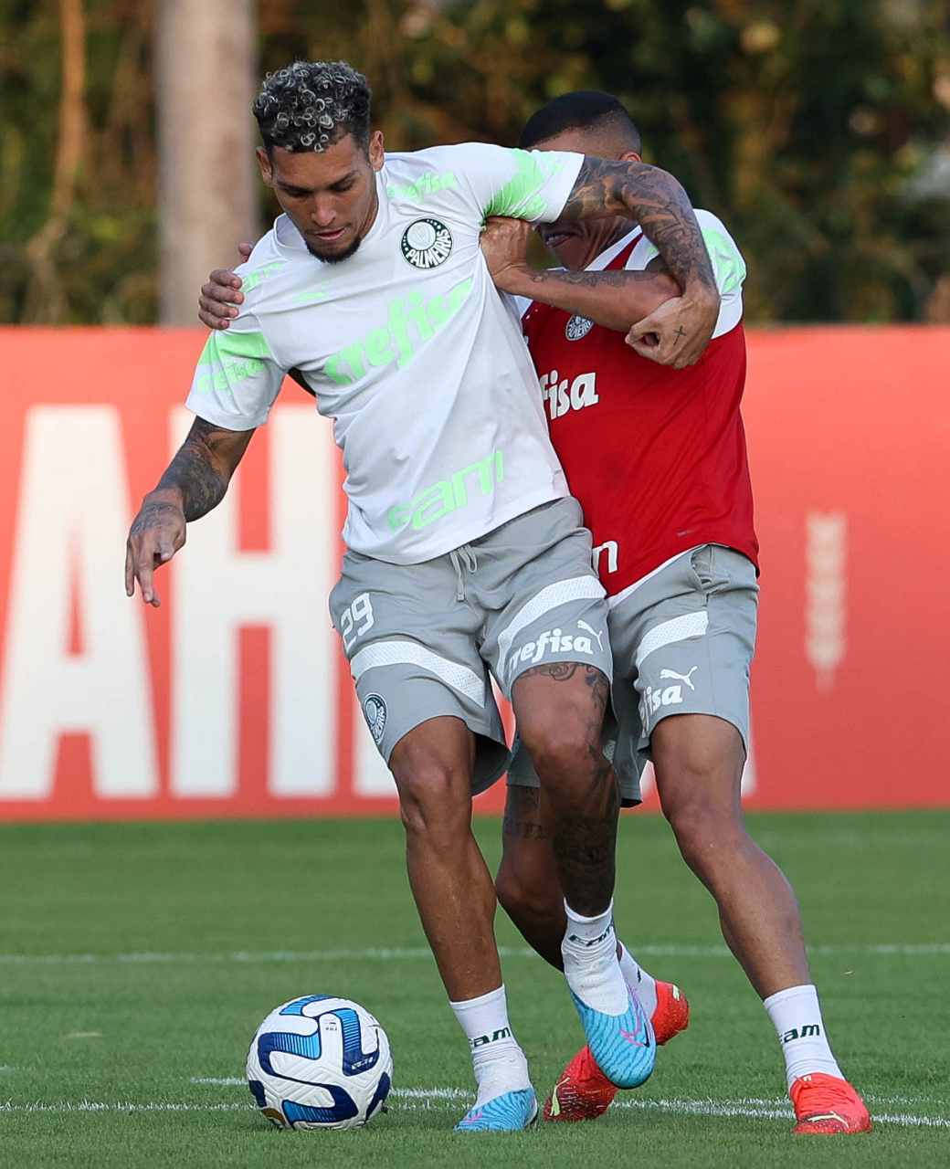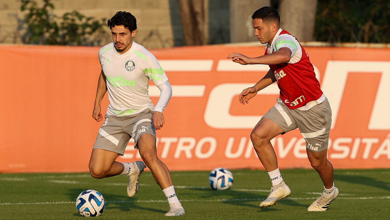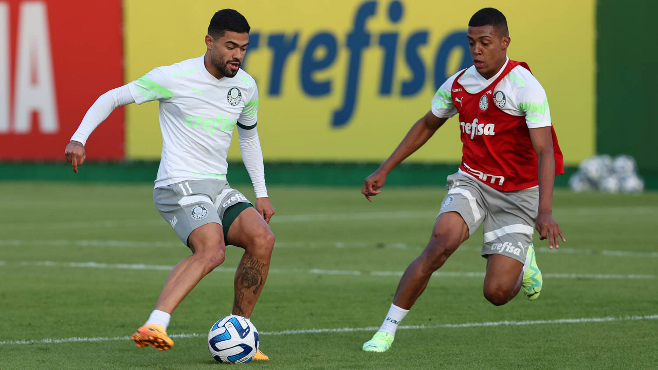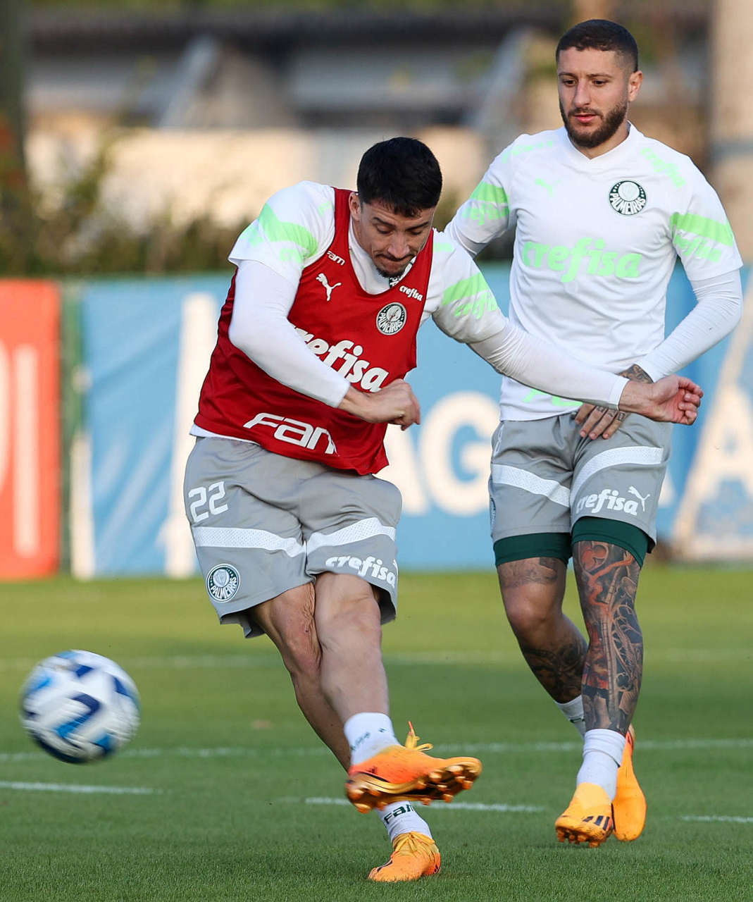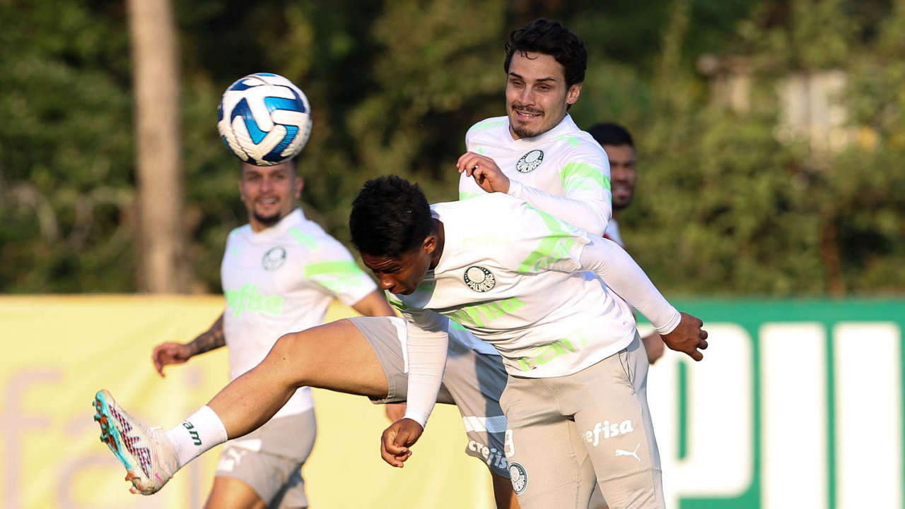 Os jogadores Raphael Veiga, Rony, Zé Rafael, Flaco López e Artur (E/D em pé) e Jhonatan, Kevin, Bruno Tabata, Breno Lopes, Dudu, Giovani, Vinicius, Endrick e Rafael Navarro (E/D agachados), da SE Palmeiras, durante treinamento, na Academia de Futebol. (Foto: Cesar Greco/Palmeiras/by Canon)