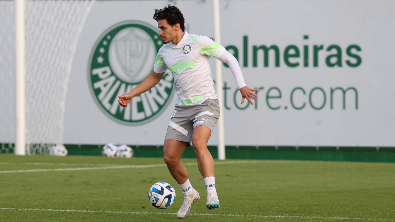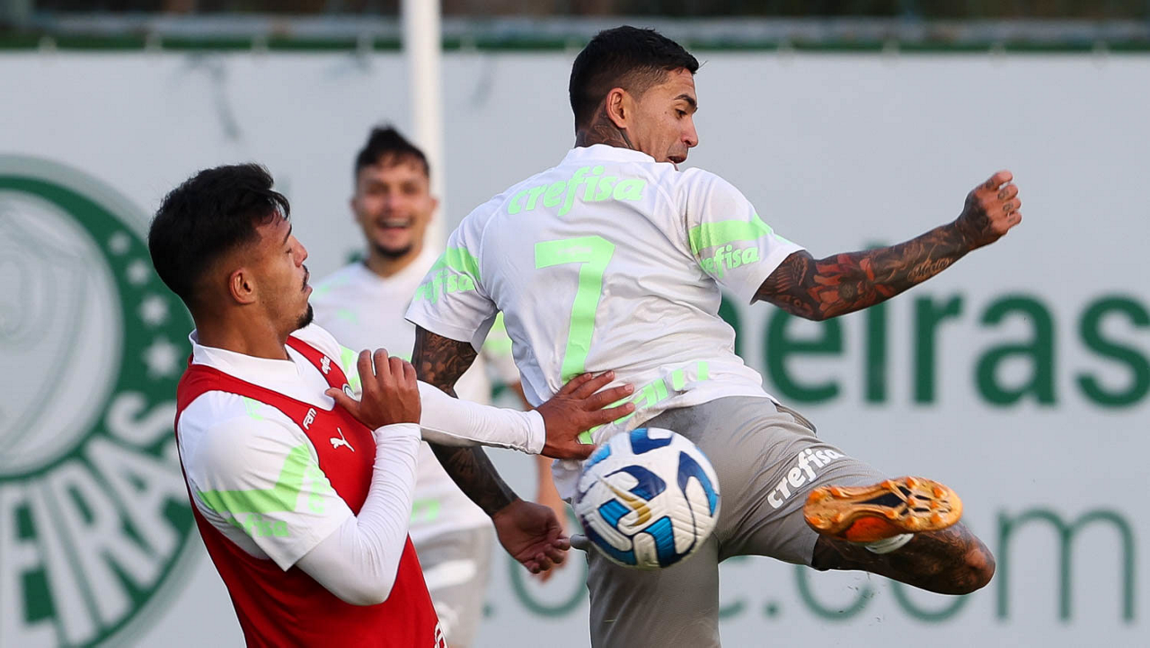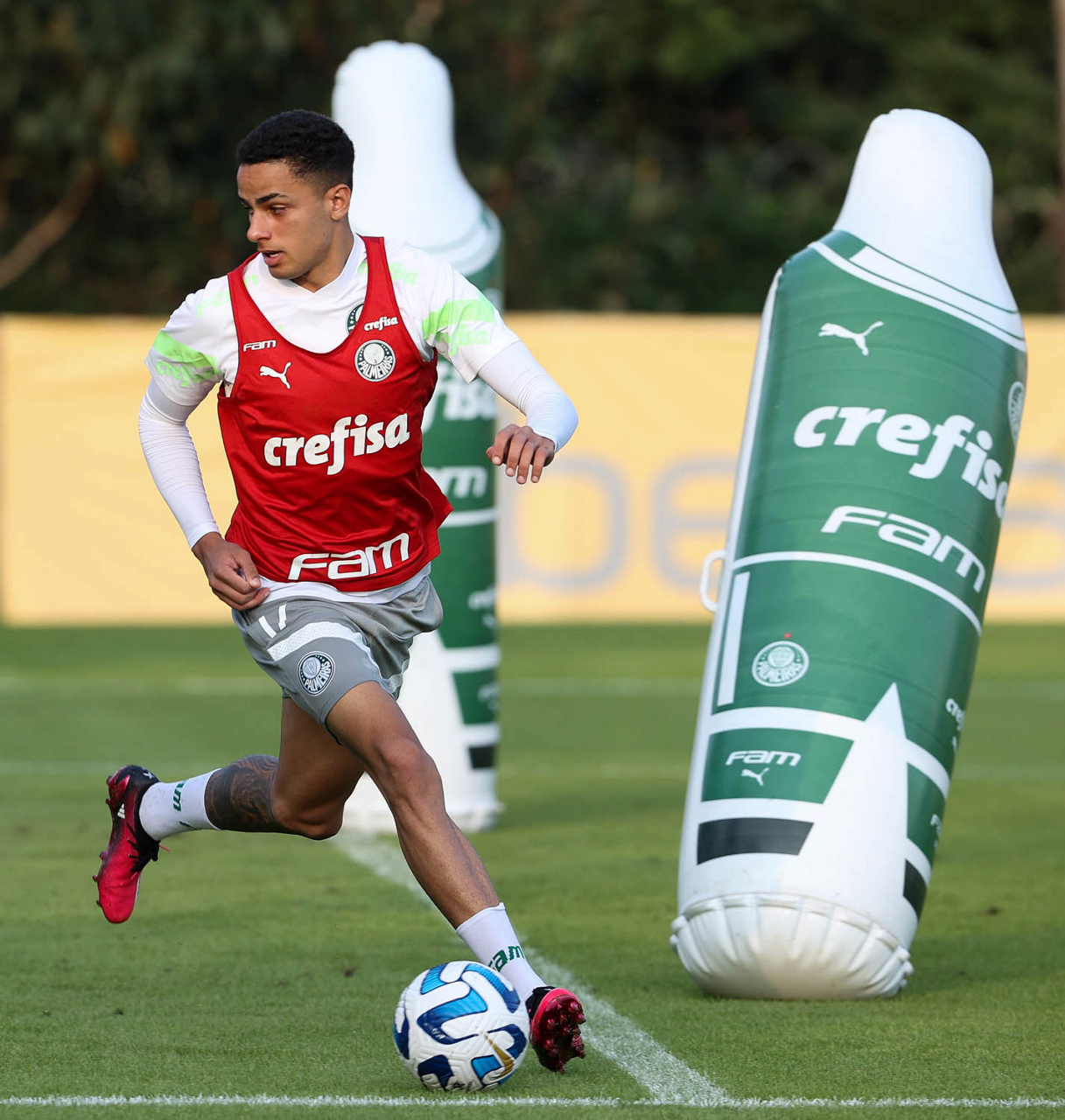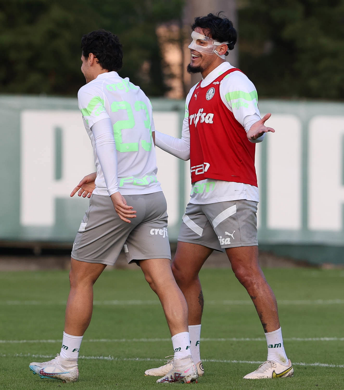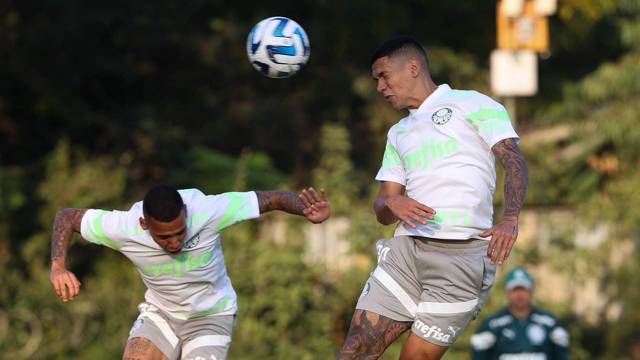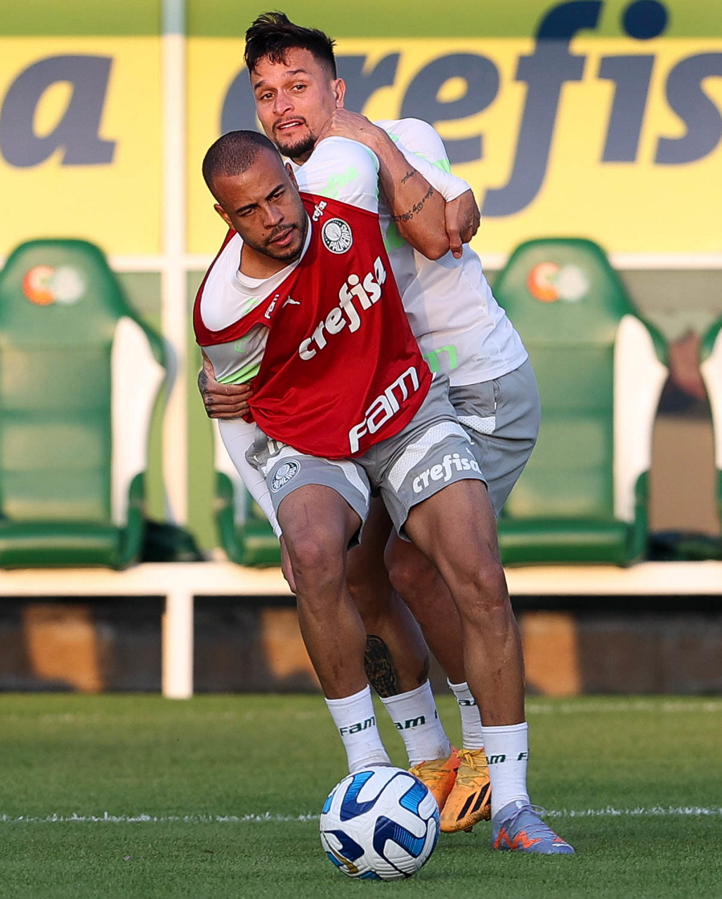 Os jogadores Raphael Veiga, Rony, Zé Rafael, Flaco López e Artur (E/D em pé) e Jhonatan, Kevin, Bruno Tabata, Breno Lopes, Dudu, Giovani, Vinicius, Endrick e Rafael Navarro (E/D agachados), da SE Palmeiras, durante treinamento, na Academia de Futebol. (Foto: Cesar Greco/Palmeiras/by Canon)