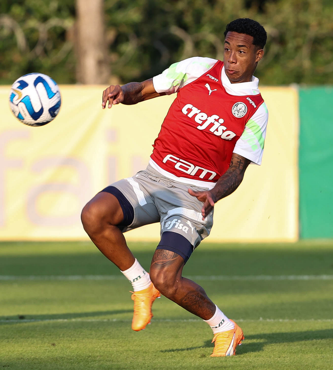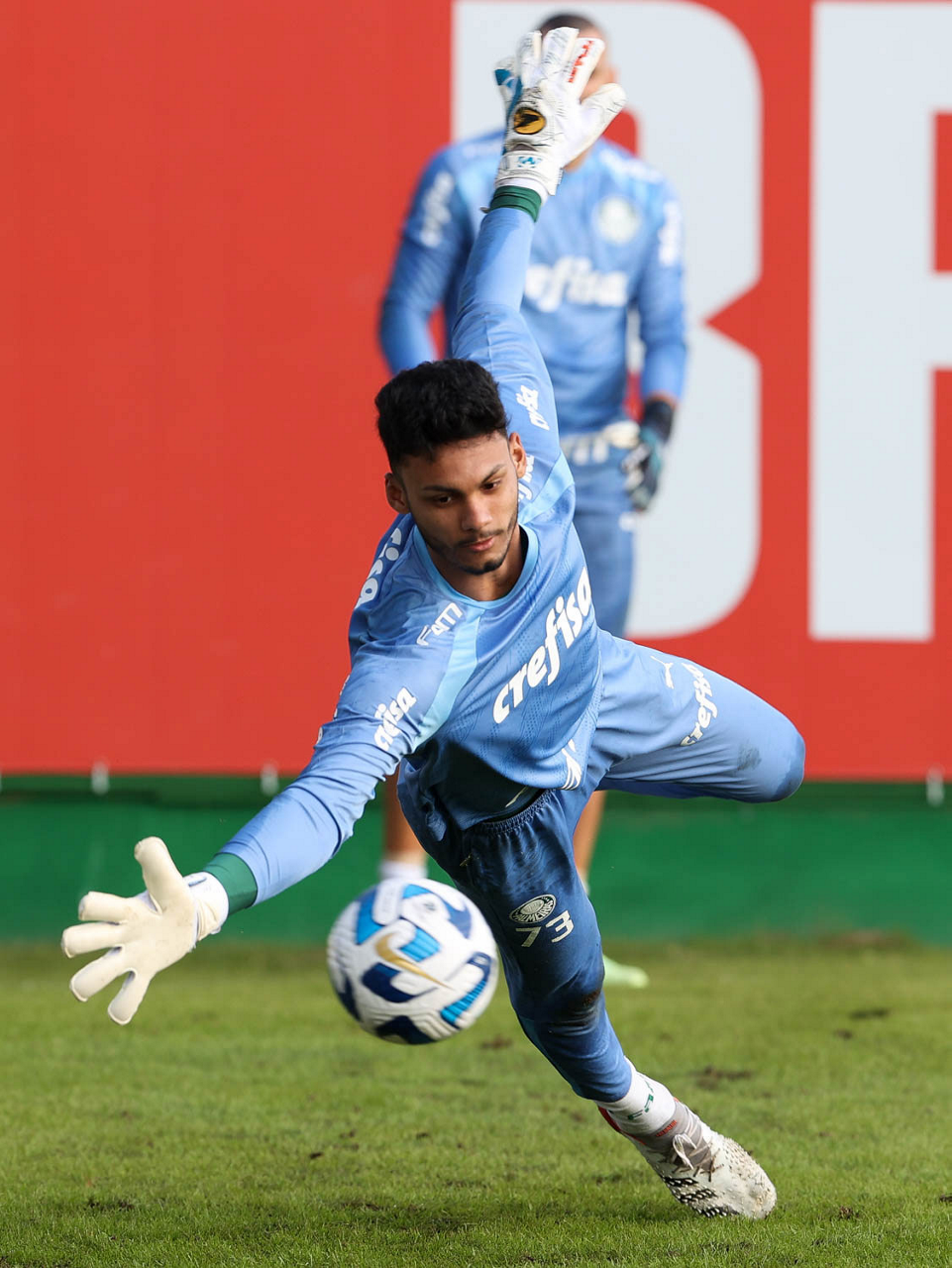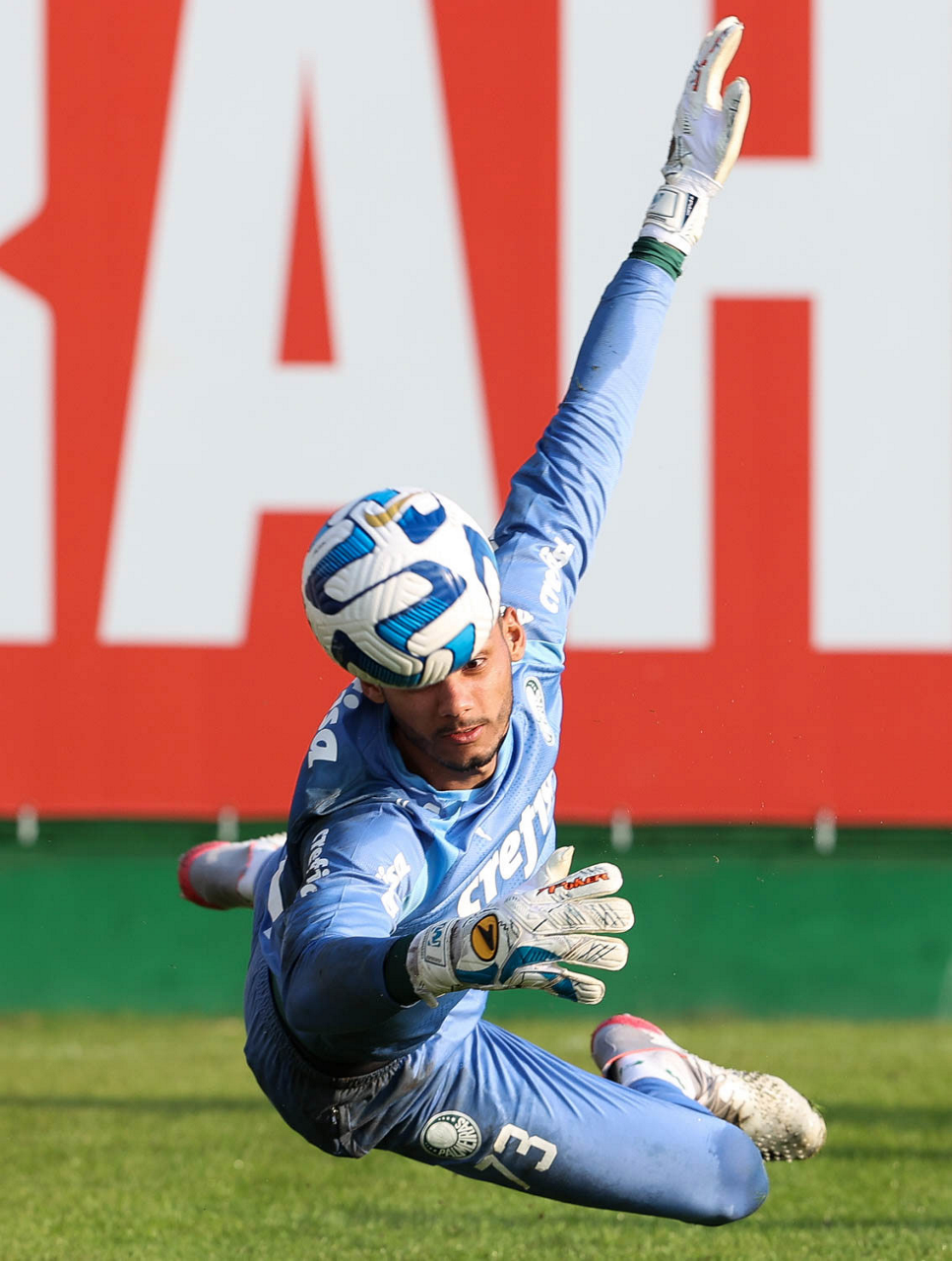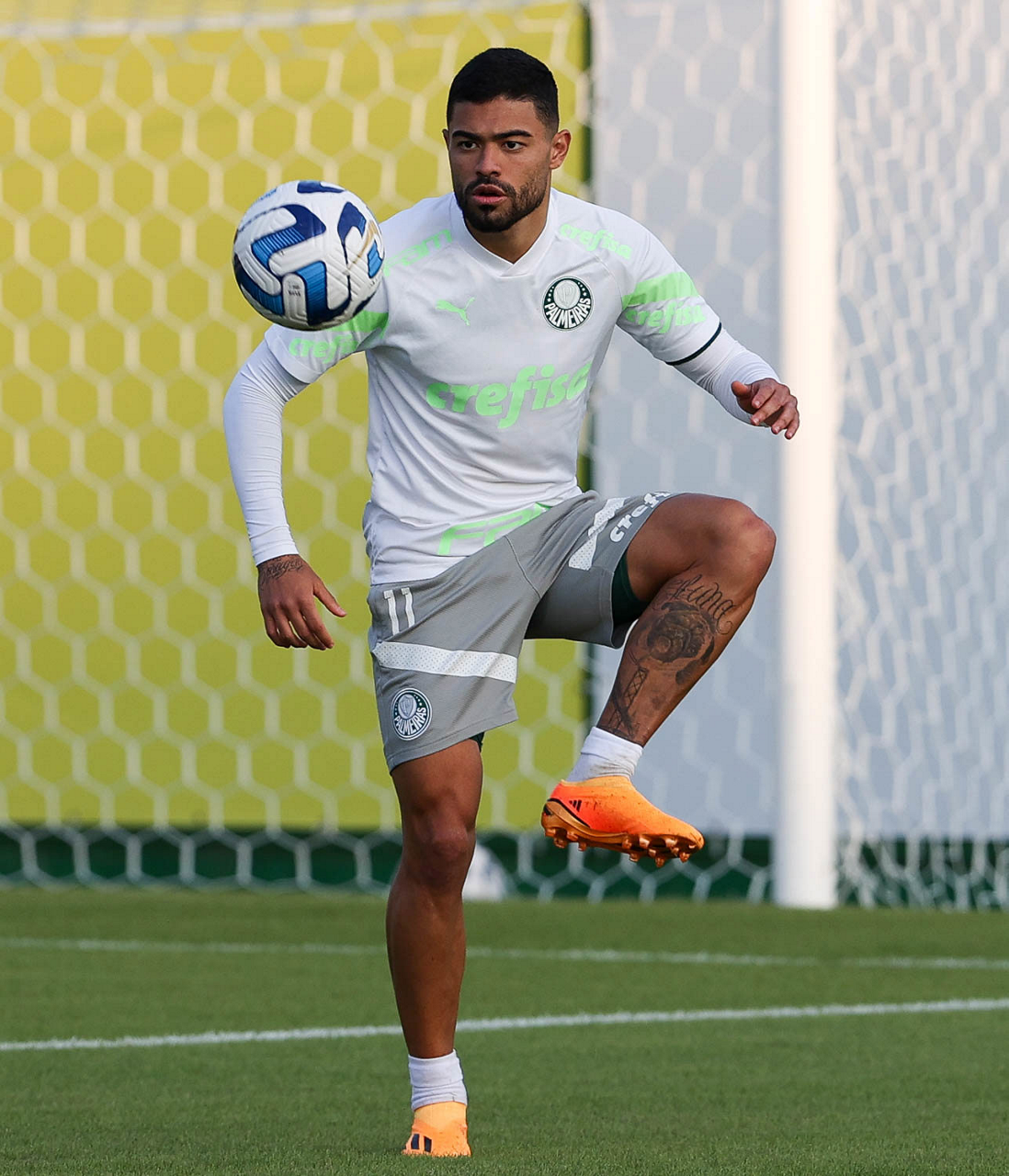 Os jogadores Raphael Veiga, Rony, Zé Rafael, Flaco López e Artur (E/D em pé) e Jhonatan, Kevin, Bruno Tabata, Breno Lopes, Dudu, Giovani, Vinicius, Endrick e Rafael Navarro (E/D agachados), da SE Palmeiras, durante treinamento, na Academia de Futebol. (Foto: Cesar Greco/Palmeiras/by Canon)