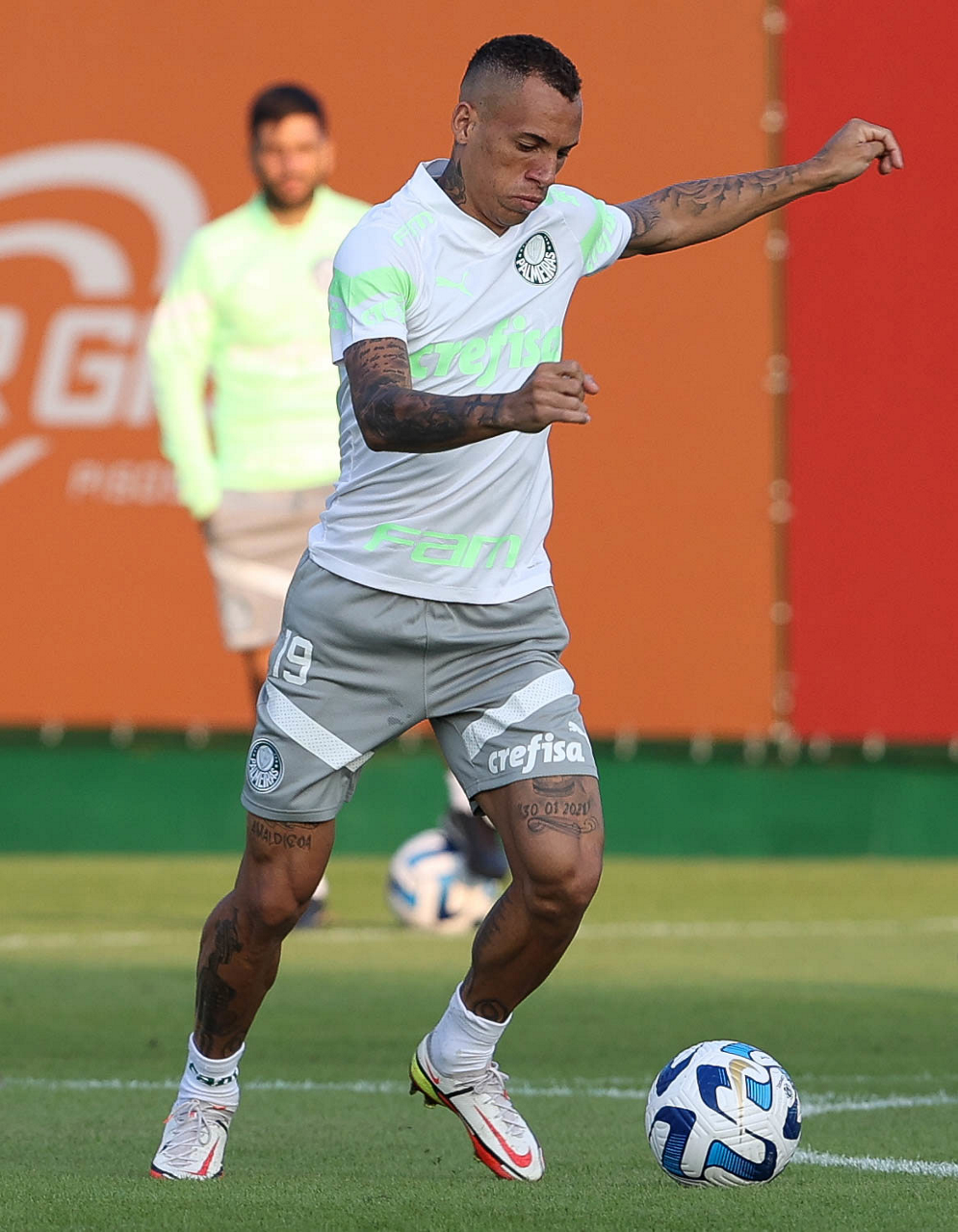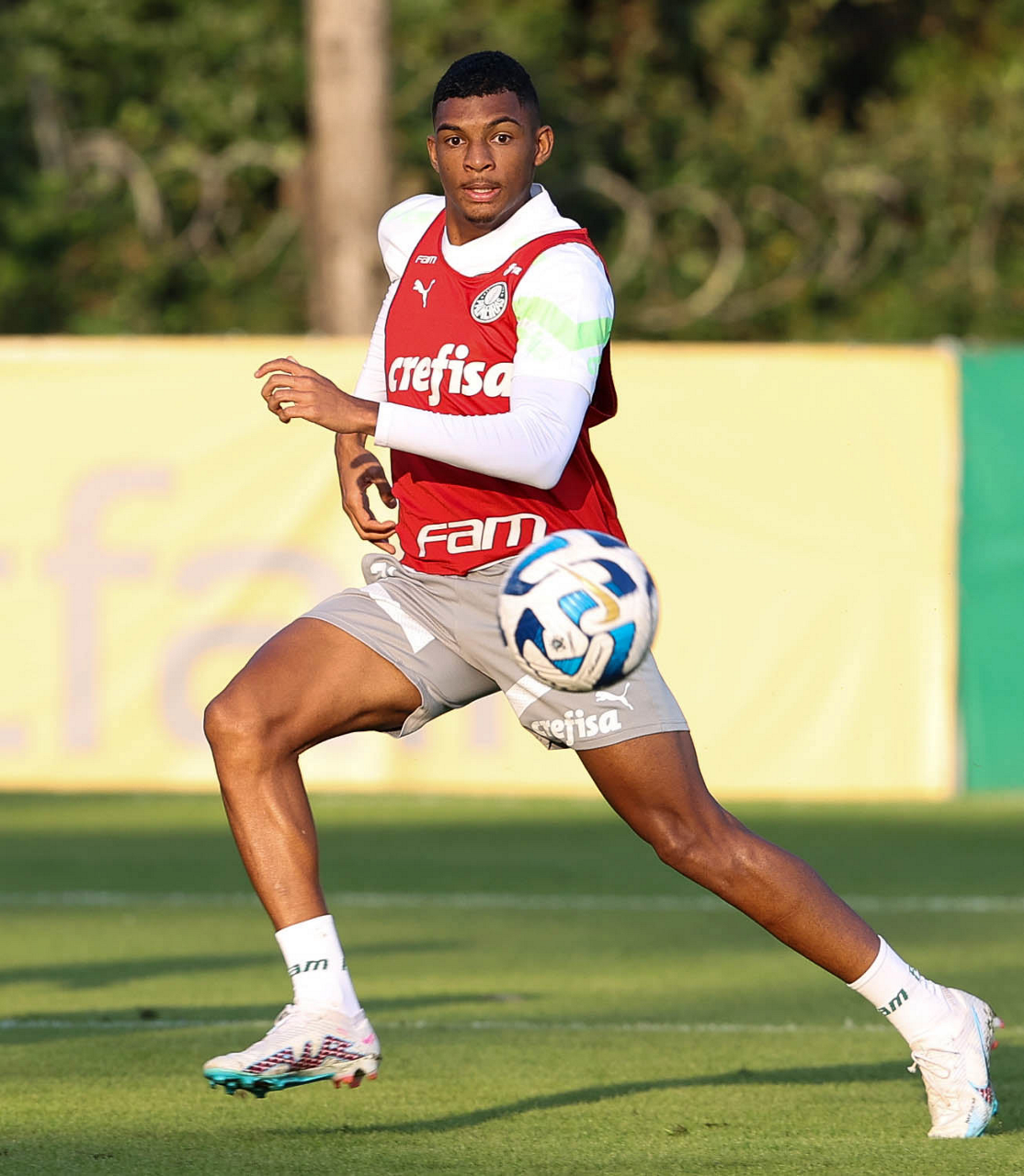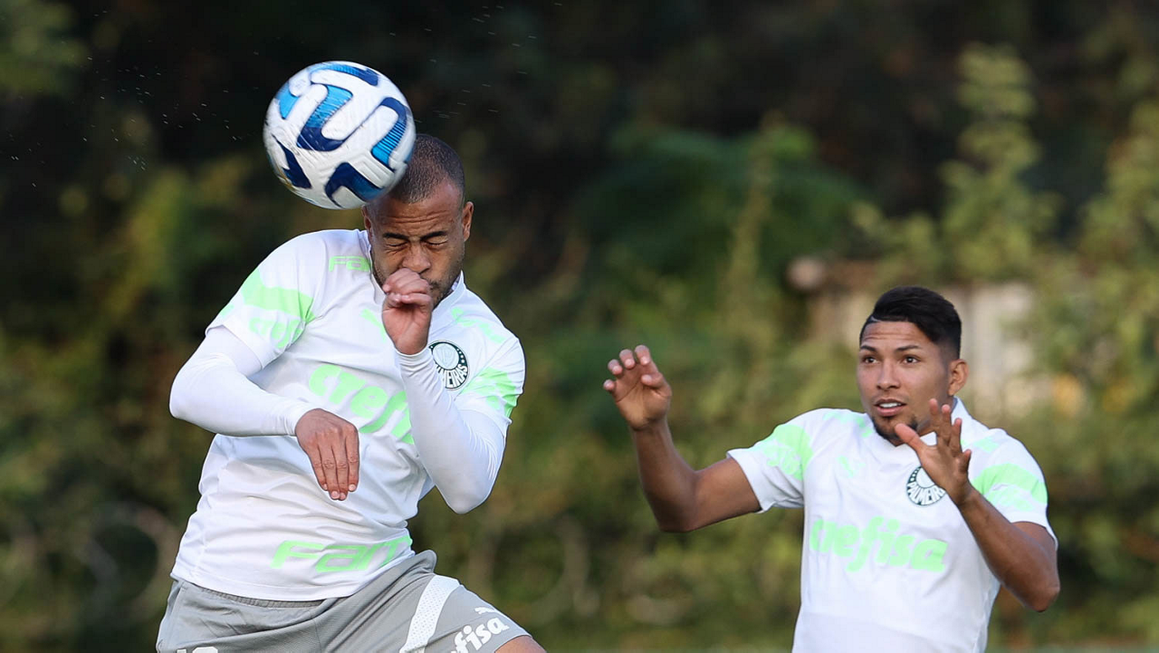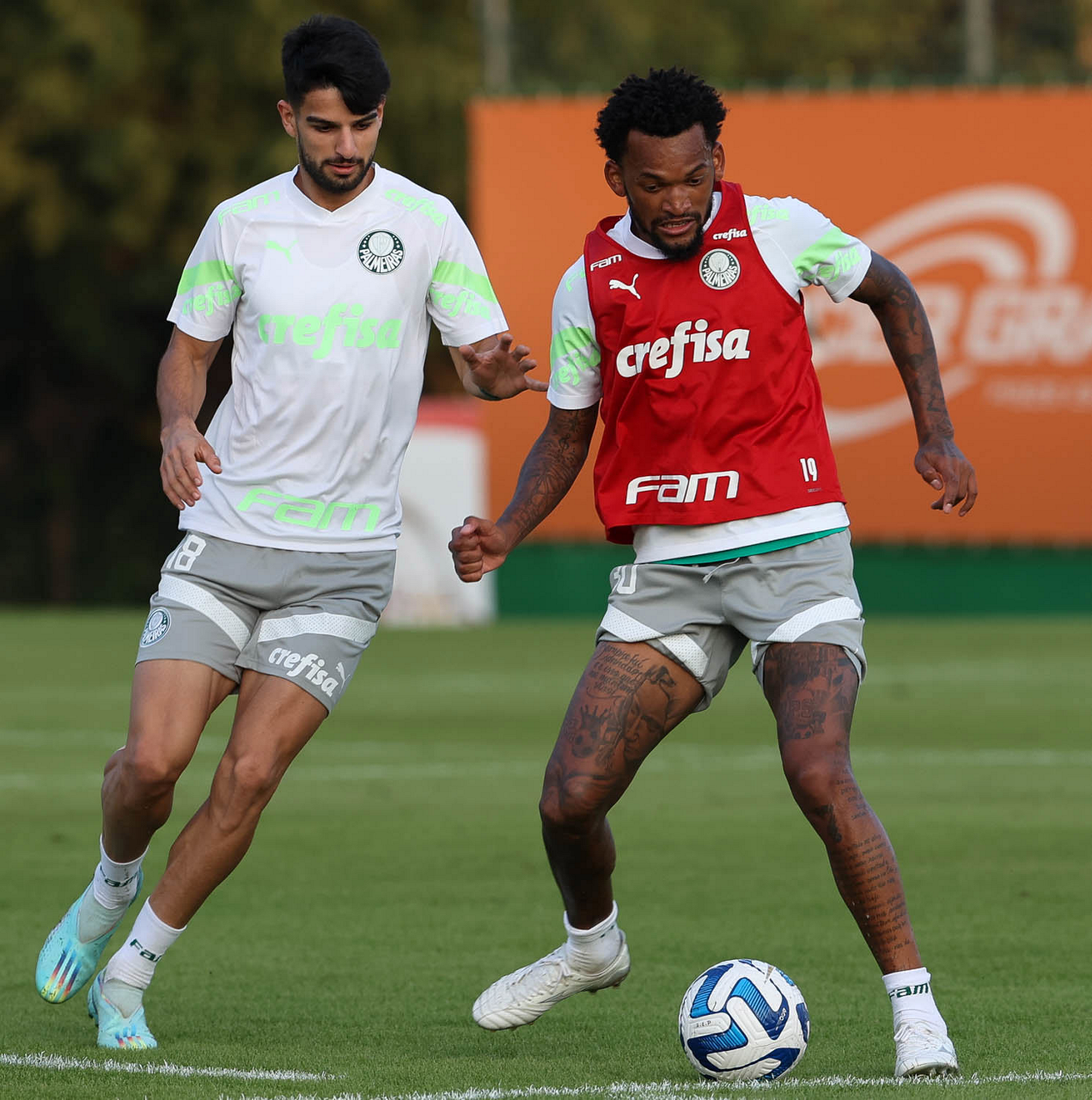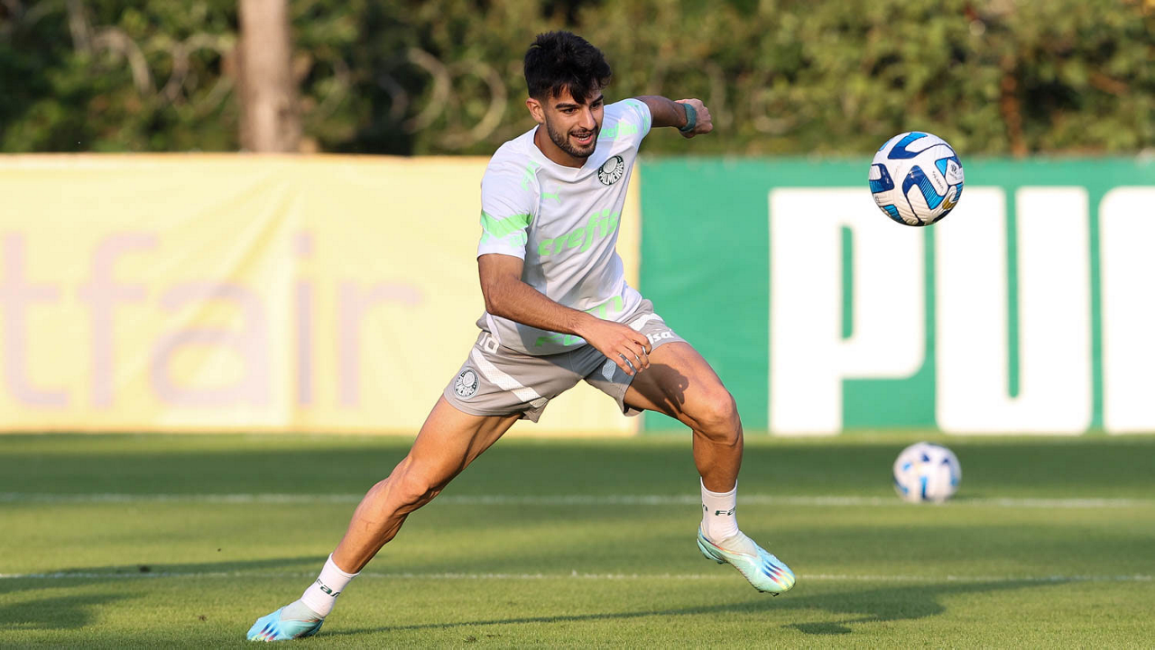 Os jogadores Raphael Veiga, Rony, Zé Rafael, Flaco López e Artur (E/D em pé) e Jhonatan, Kevin, Bruno Tabata, Breno Lopes, Dudu, Giovani, Vinicius, Endrick e Rafael Navarro (E/D agachados), da SE Palmeiras, durante treinamento, na Academia de Futebol. (Foto: Cesar Greco/Palmeiras/by Canon)