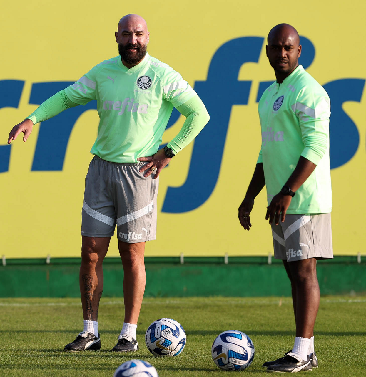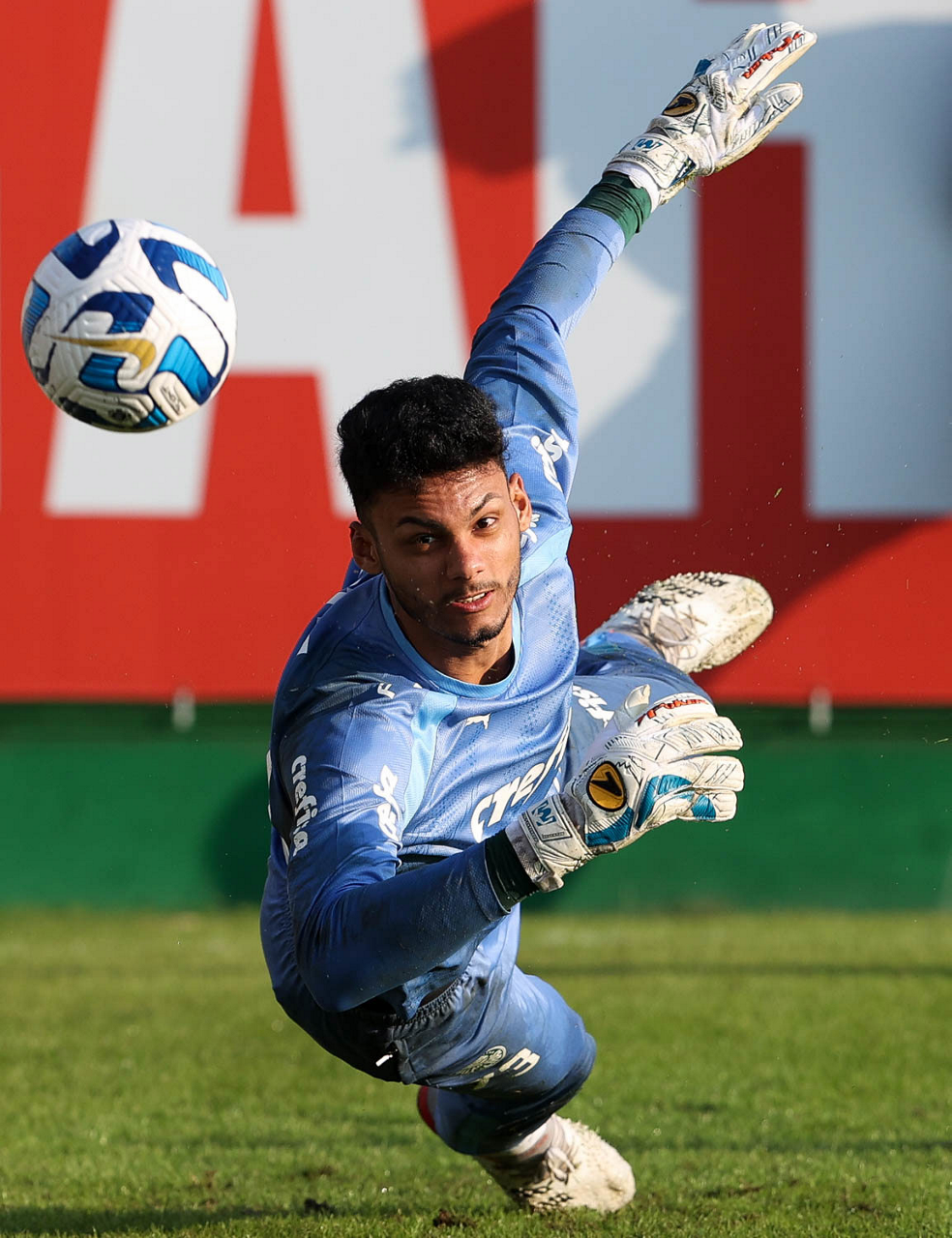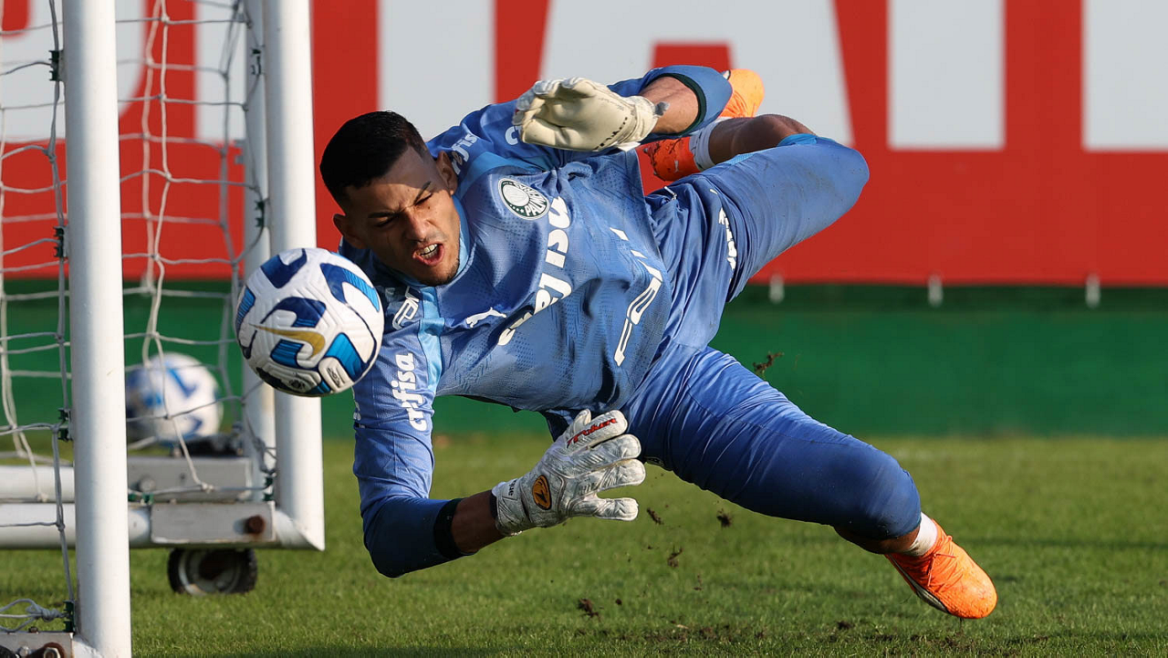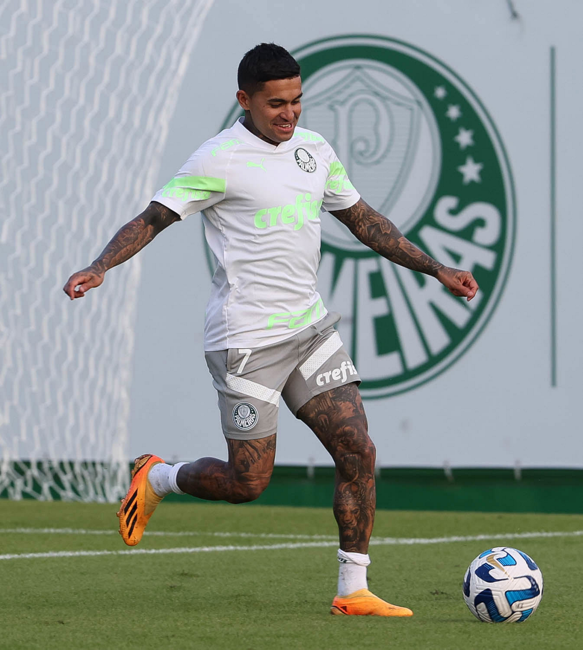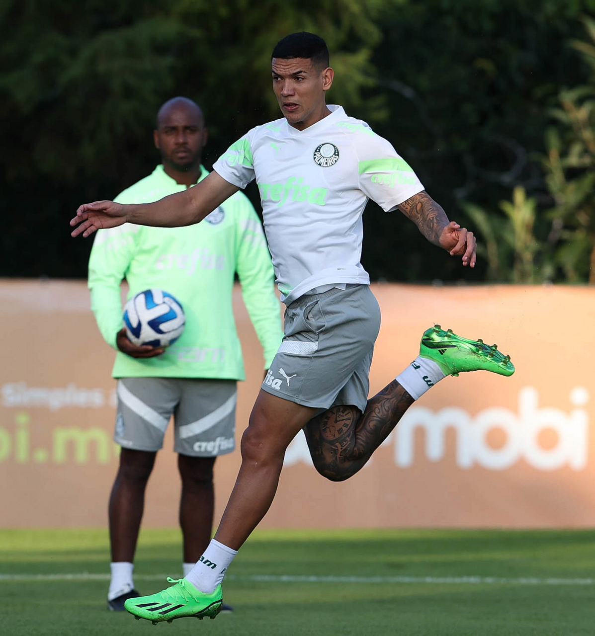 Os jogadores Raphael Veiga, Rony, Zé Rafael, Flaco López e Artur (E/D em pé) e Jhonatan, Kevin, Bruno Tabata, Breno Lopes, Dudu, Giovani, Vinicius, Endrick e Rafael Navarro (E/D agachados), da SE Palmeiras, durante treinamento, na Academia de Futebol. (Foto: Cesar Greco/Palmeiras/by Canon)