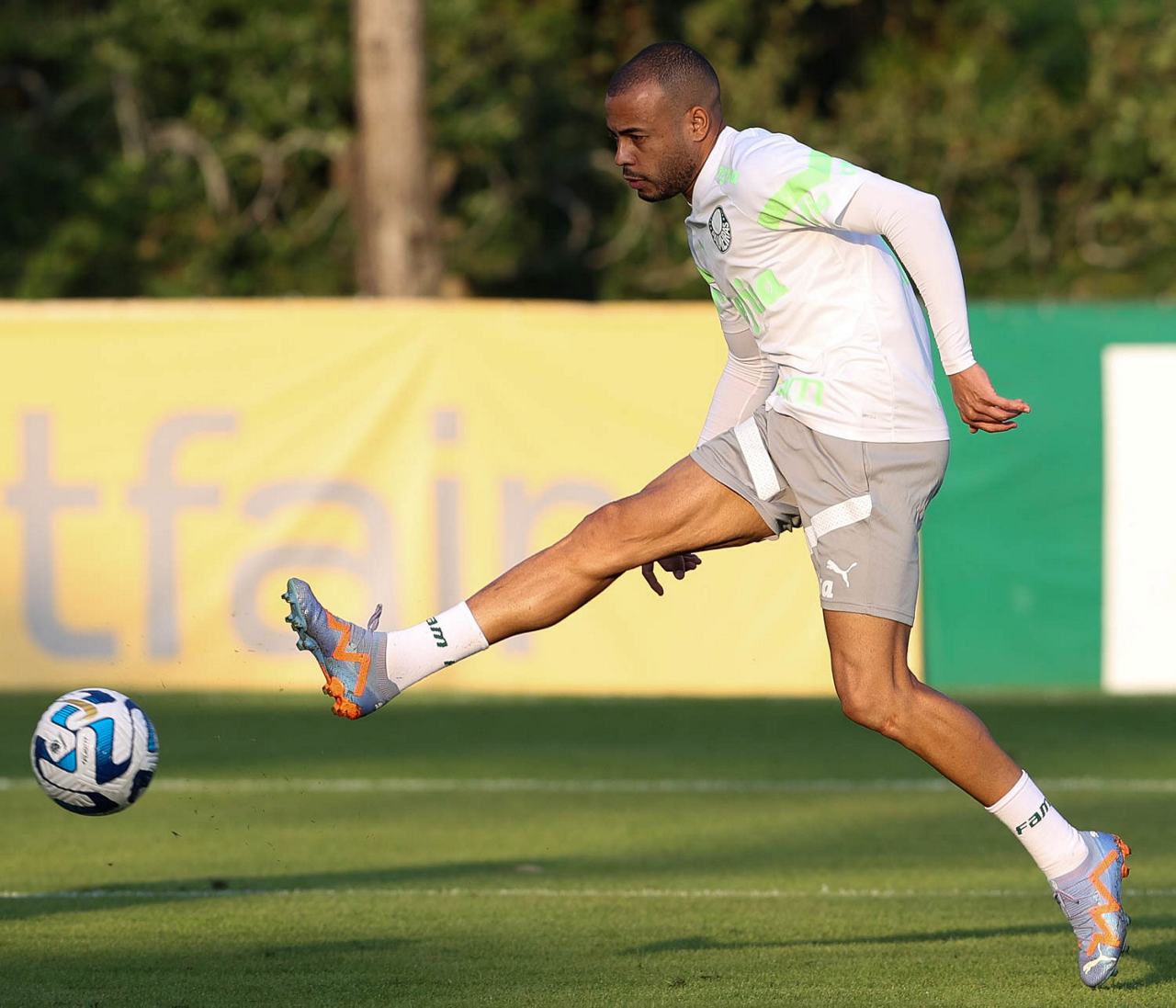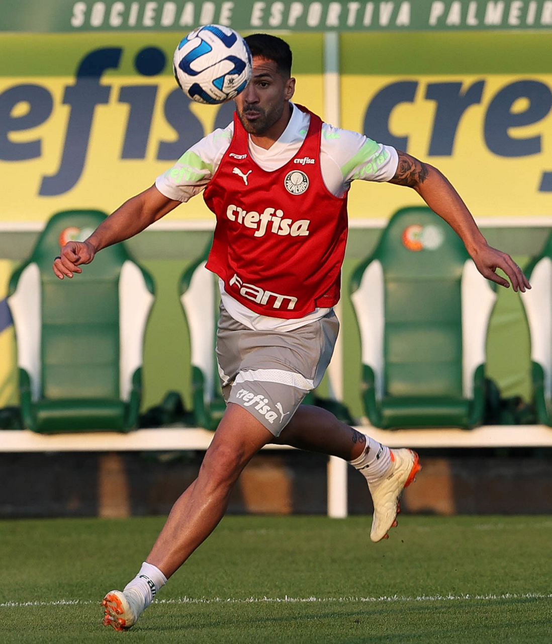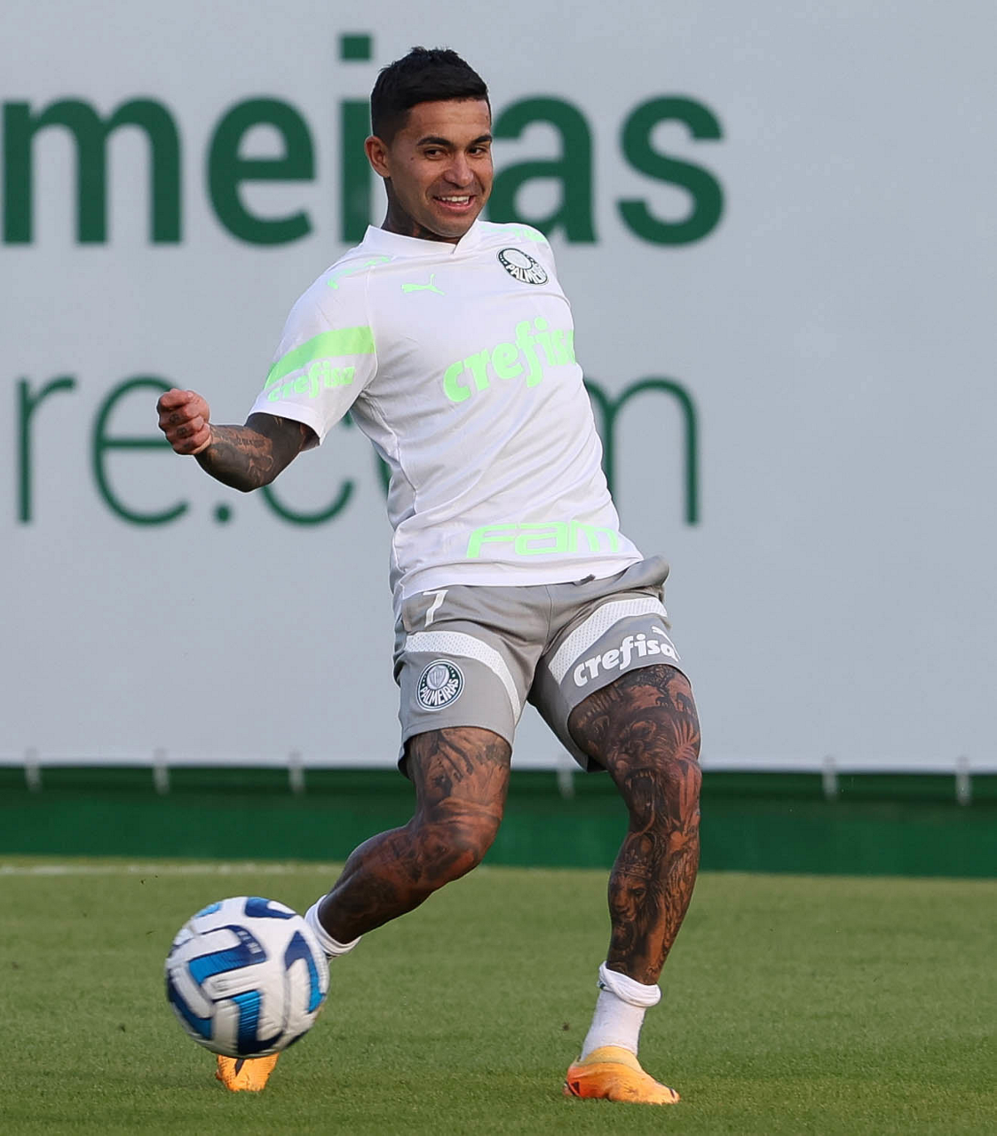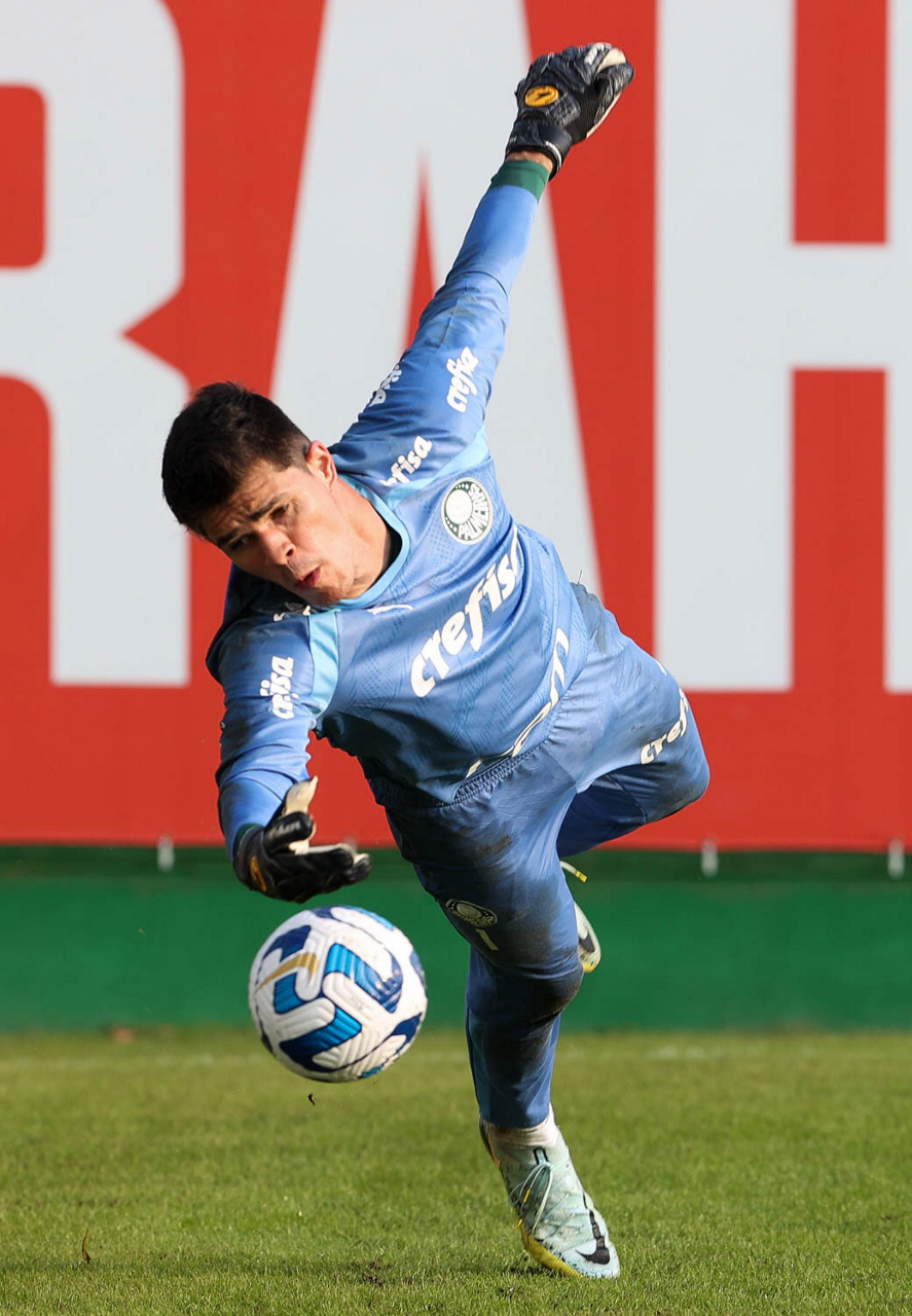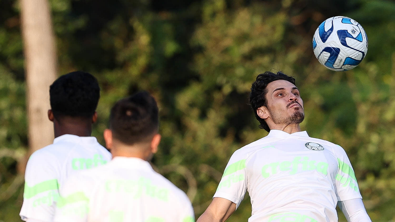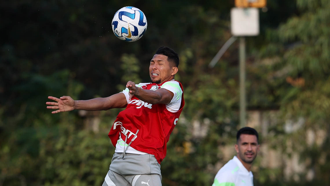 Os jogadores Raphael Veiga, Rony, Zé Rafael, Flaco López e Artur (E/D em pé) e Jhonatan, Kevin, Bruno Tabata, Breno Lopes, Dudu, Giovani, Vinicius, Endrick e Rafael Navarro (E/D agachados), da SE Palmeiras, durante treinamento, na Academia de Futebol. (Foto: Cesar Greco/Palmeiras/by Canon)