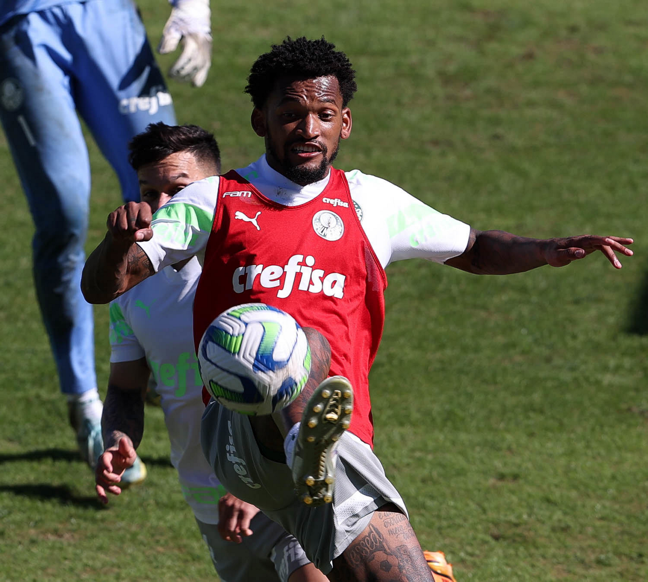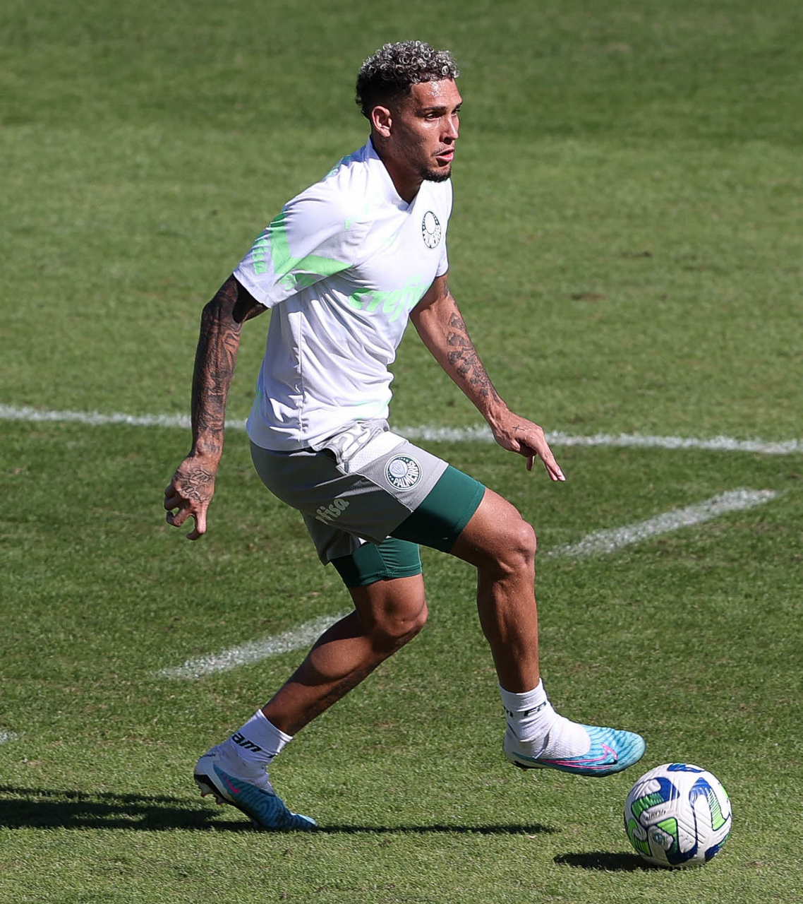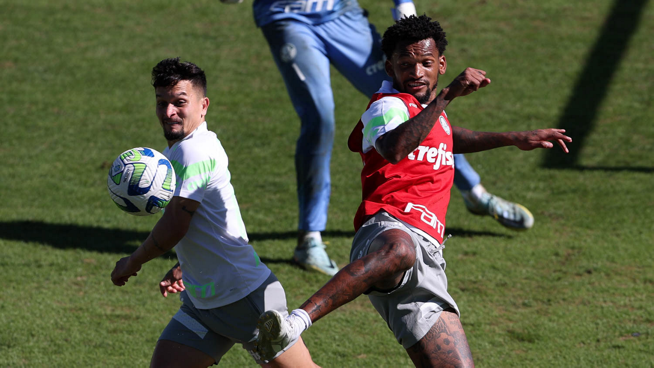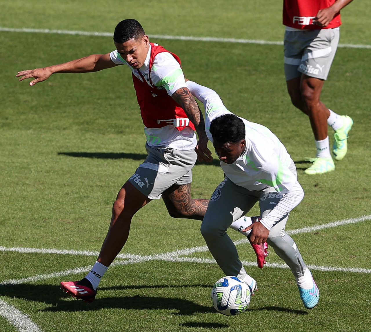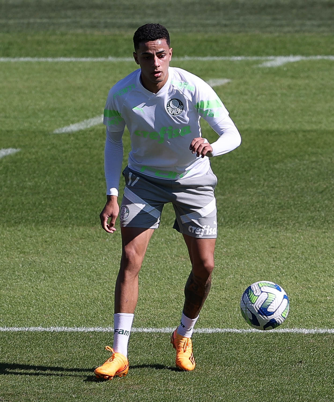 Os jogadores Jhonatan, Endrick, Vinicius, Flaco López, Rony e Raphael Veiga (E/D em pé) e Rafael Navarro, Breno Lopes, Artur, Dudu, Giovani, Zé Rafael e Bruno Tabata (E/D agachados), da SE Palmeiras, durante treinamento, na Academia de Futebol. (Foto: Cesar Greco/Palmeiras/by Canon)