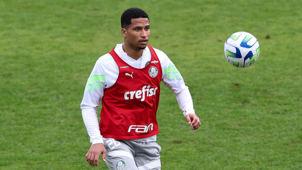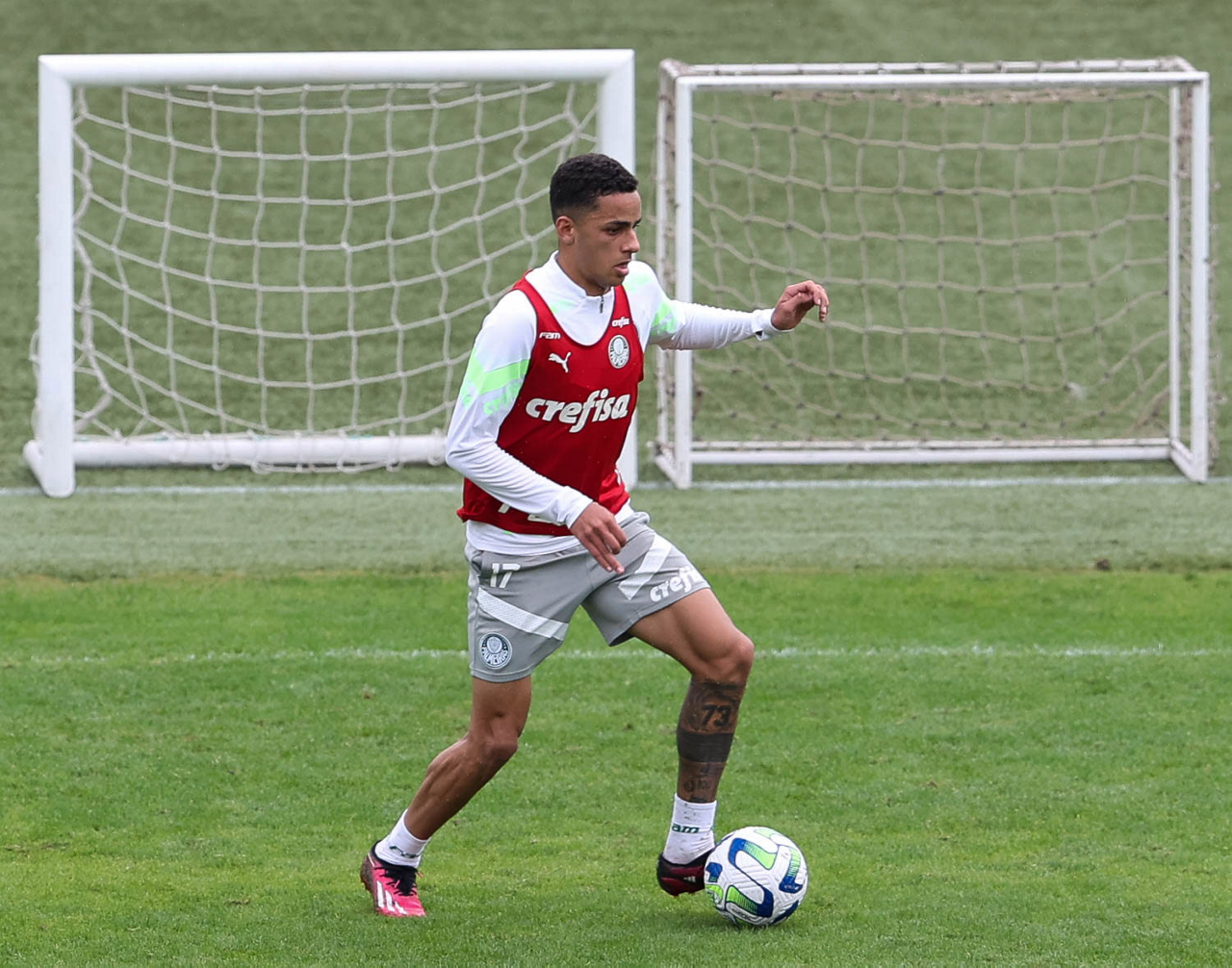 Os jogadores Naves, Endrick, Fabinho, Gabriel Menino, Dudu, Richard Ríos, Garcia, Rafael Navarro e o goleiro Vinicius (E/D em pé) e Bruno Tabata e Vanderlan (D agachados), da SE Palmeiras, durante treinamento, na Academia de Futebol. (Foto: Cesar Greco/Palmeiras/by Canon)
