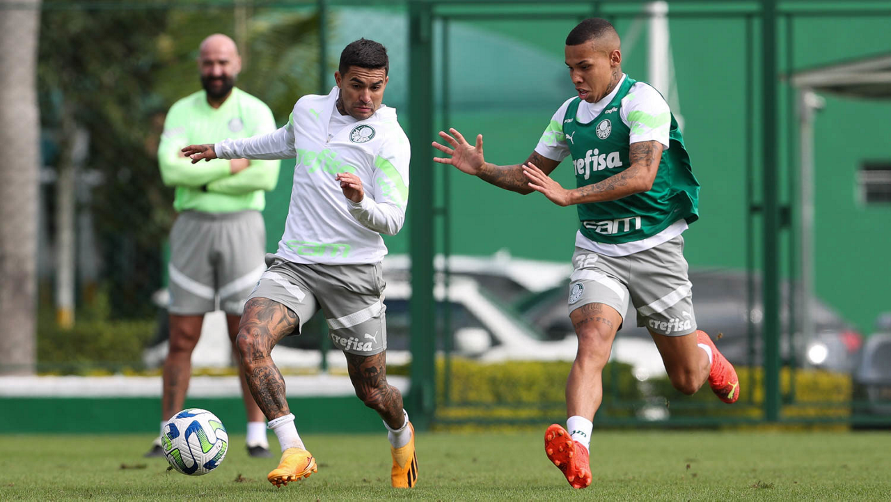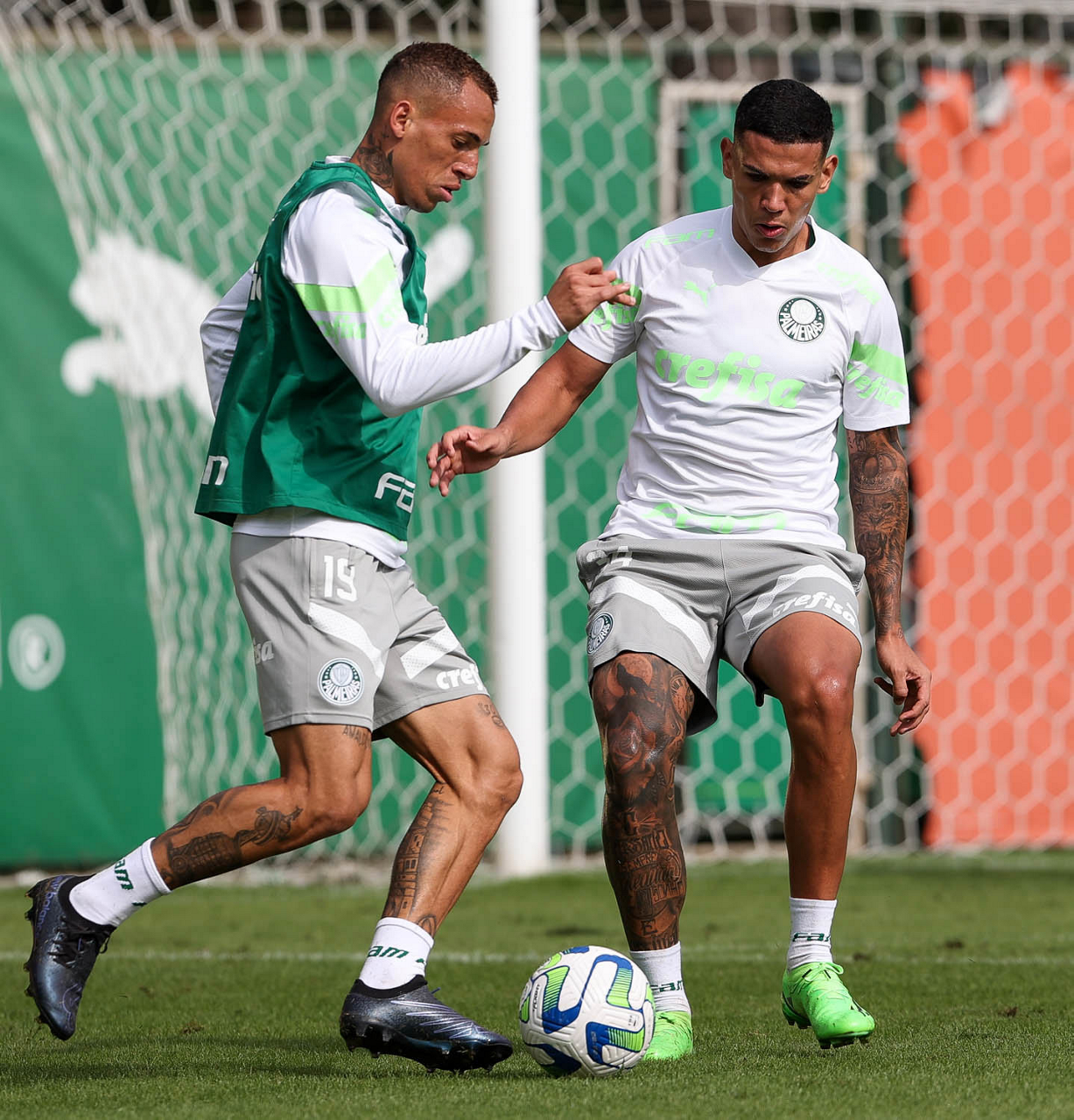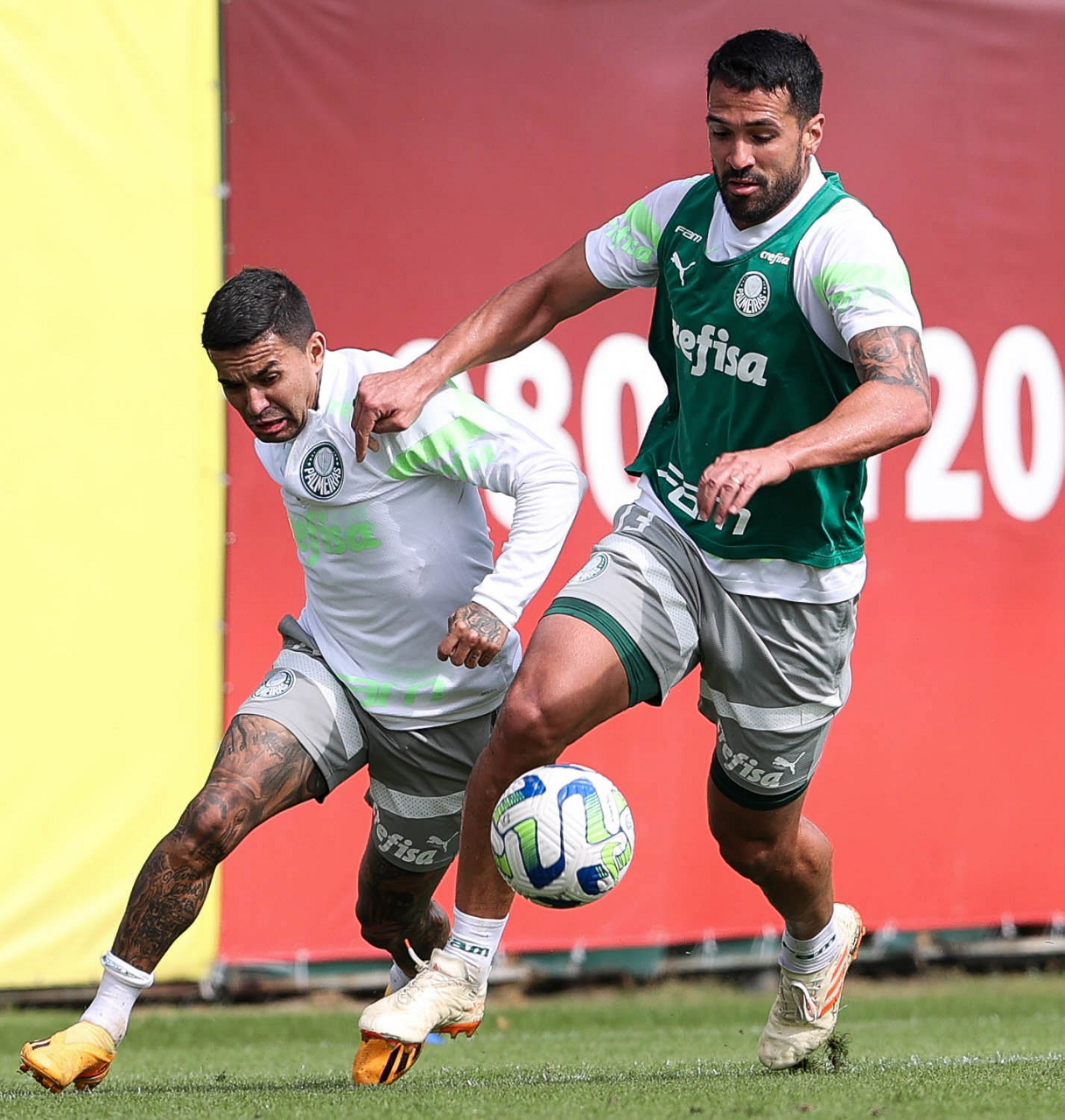 Os jogadores Dudu e Bruno Tabata (D), da SE Palmeiras, durante treinamento, na Academia de Futebol. (Foto: Cesar Greco/Palmeiras/by Canon)