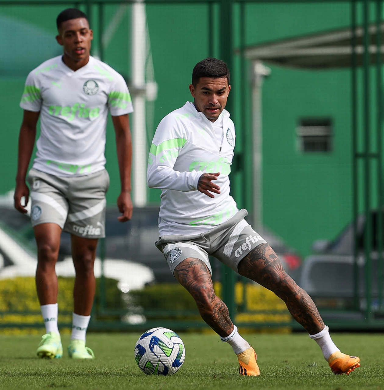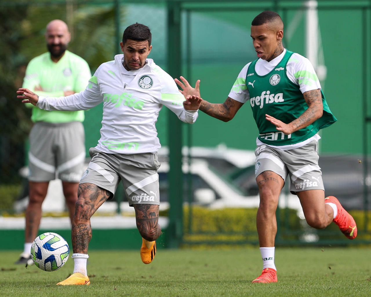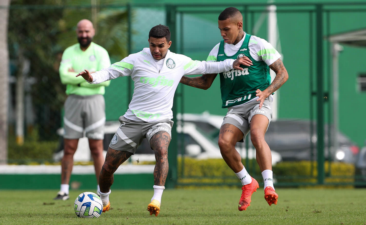 Os jogadores Dudu e Bruno Tabata (D), da SE Palmeiras, durante treinamento, na Academia de Futebol. (Foto: Cesar Greco/Palmeiras/by Canon)