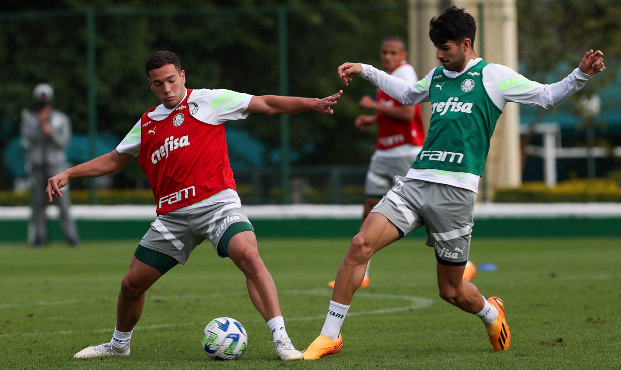 Os jogadores Rafael Navarro e Naves (D), da SE Palmeiras, durante treinamento, na Academia de Futebol. (Foto: Cesar Greco/Palmeiras/by Canon)